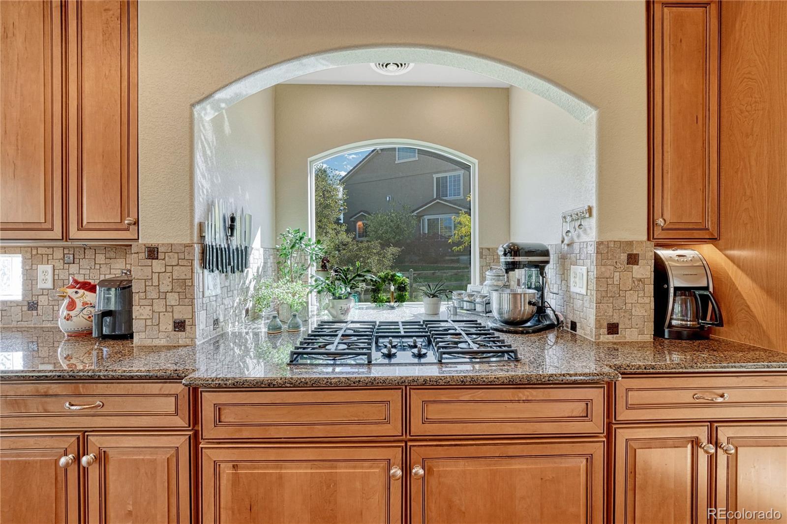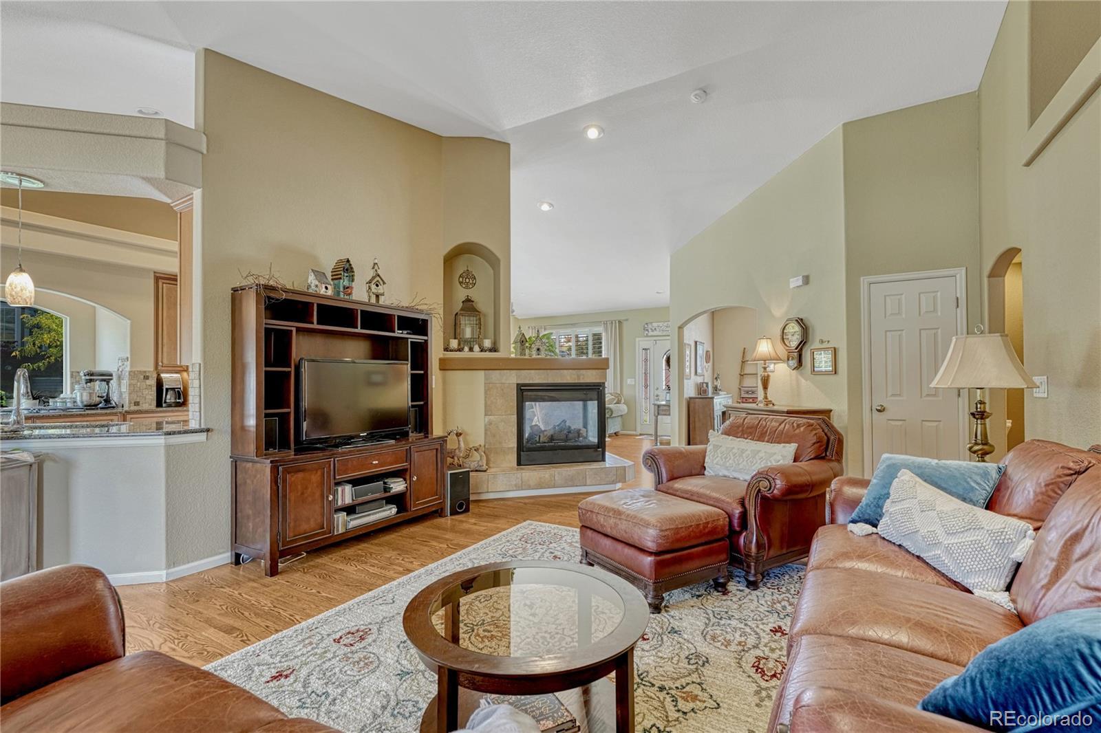 AMAZING ONE STORY HOME WITH BREATHTAKING VIEWS, backs to the Ridgeline Trails Open Space Area and adjoins to a wild life passthrough/greenbelt area, near the top/end of cul de sac road. Oversized 3 vehicle garage, no maintenance yard, large newer composite deck, hail resistant cement tile roof, natural lighting throughout, full finished basement with lots of storage, well loved & maintained home are only a few bonuses for this property. Main level is open with a gourmet kitchen-double oven, gas cook top, slab granite counter tops, stunning stone backsplash, upgraded maple cabinetry-3 sided gas fireplace, office, sizable formal dining area, hardwood flooring, vaulted ceiling, laundry room with a sink/cabinets/shelving, 2 bedrooms, and 2 bathrooms. Spacious primary suite has great views, vaulted ceiling, 5 pc bathroom, deep soaking tub, walk-in closet. Professionally finished basement has 2 living areas, bedroom, full bathroom, and lots of unfinished storage room. Main entertainment room has a dry bar, slab granite counter tops, mini-frig, and built-in cabinets. Full wall credenza conveys with the property. Second living area is equally impressive with heated LVT flooring and many uses - Exercise room, crafts, work shop. Close proximity to hiking & biking trails, tennis & pickle ball courts, golf courses, hospital, schools, stores, restaurants, Outlets at Castle Rock, The Promenade, MAC, I-25, DTC, & more.