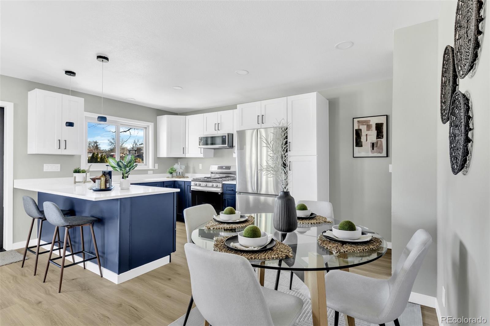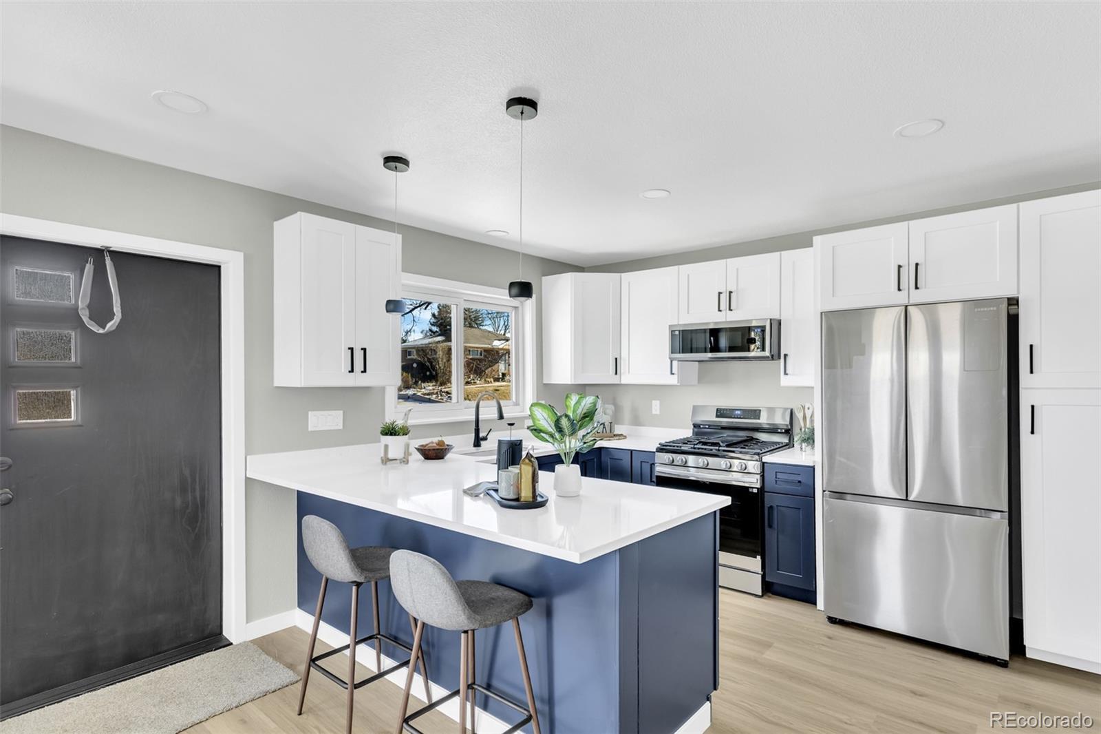 Stunning remodel from top to bottom with open concept kitchen, this beautiful home feels brand new throughout. Updates include new carpet and luxury vinyl plank flooring, new exterior electrical panel and interior tamper-proof receptacles and switches, new LED lighting, and new plumbing throughout. The designer kitchen features all-new soft-close cabinets and drawers and brand-new Samsung appliances including gas stove. Bathrooms have been fully remodeled with new vanities, toilets, tub, and shower. Major mechanical and structural upgrades include a new AC unit, newer furnace and hot water heater, all new concrete, and a new electric fireplace with heat. The home also features all new interior and exterior doors, new basement windows, and a new garage door and opener. Smart-home additions include a Google Nest thermostat and Google Nest doorbell camera. Landscaping includes brand-new sod in front yard and back yard is graded and seeded for a fresh start. Truly a move-in-ready renovation with high-quality finishes and thoughtful upgrades throughout. The location is minutes from I-25 for a short commute to downtown, quick access to I-70 to head to the high country, or swing onto 36 and head up to Boulder. Close to retail and many restaurants for your convenience. This home is ready for its next owner!
