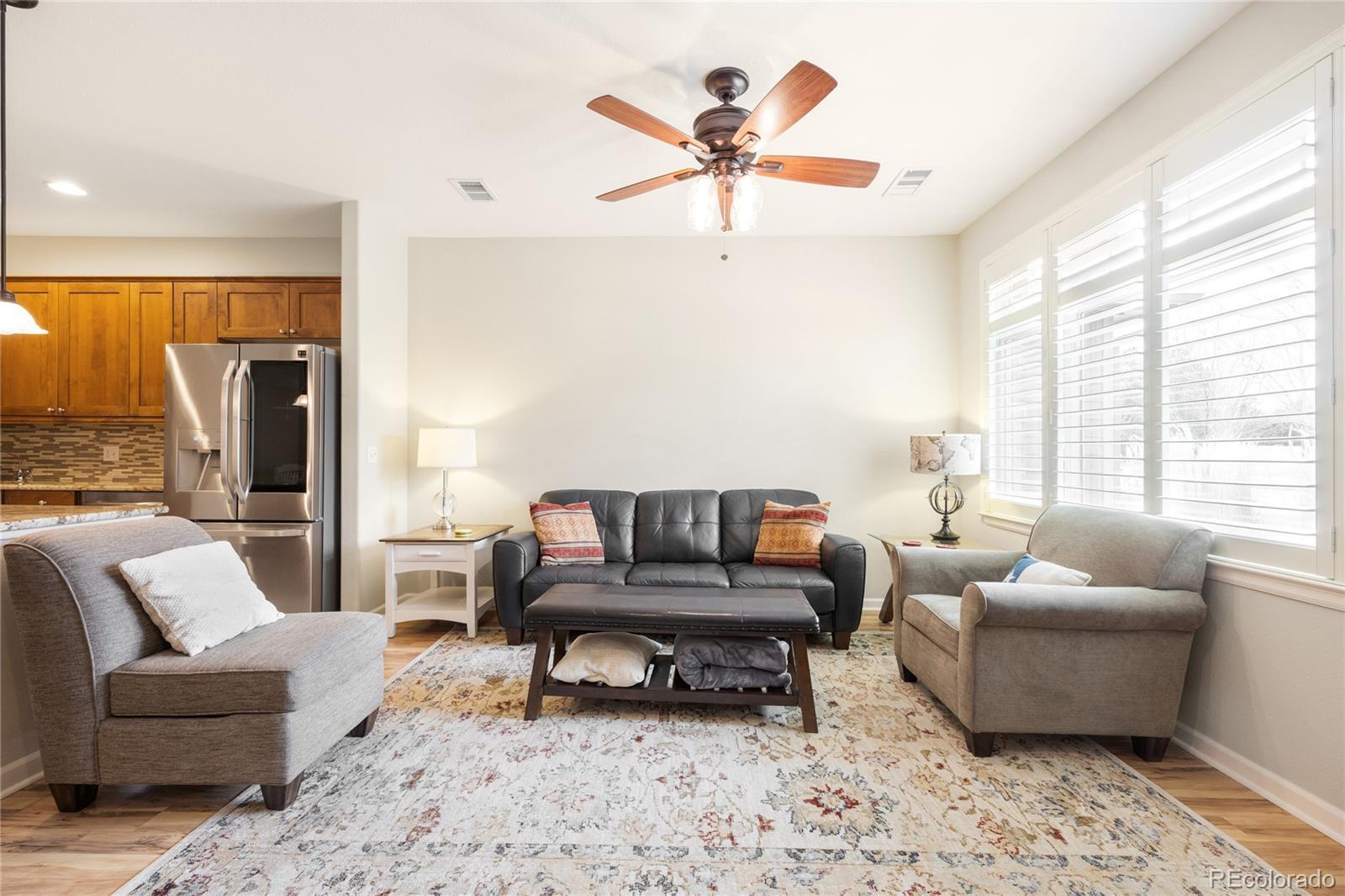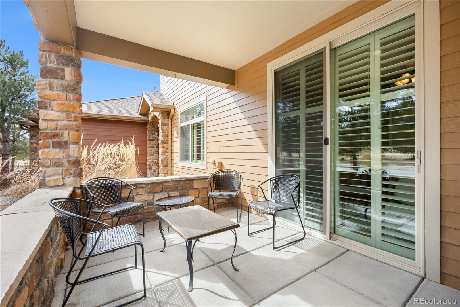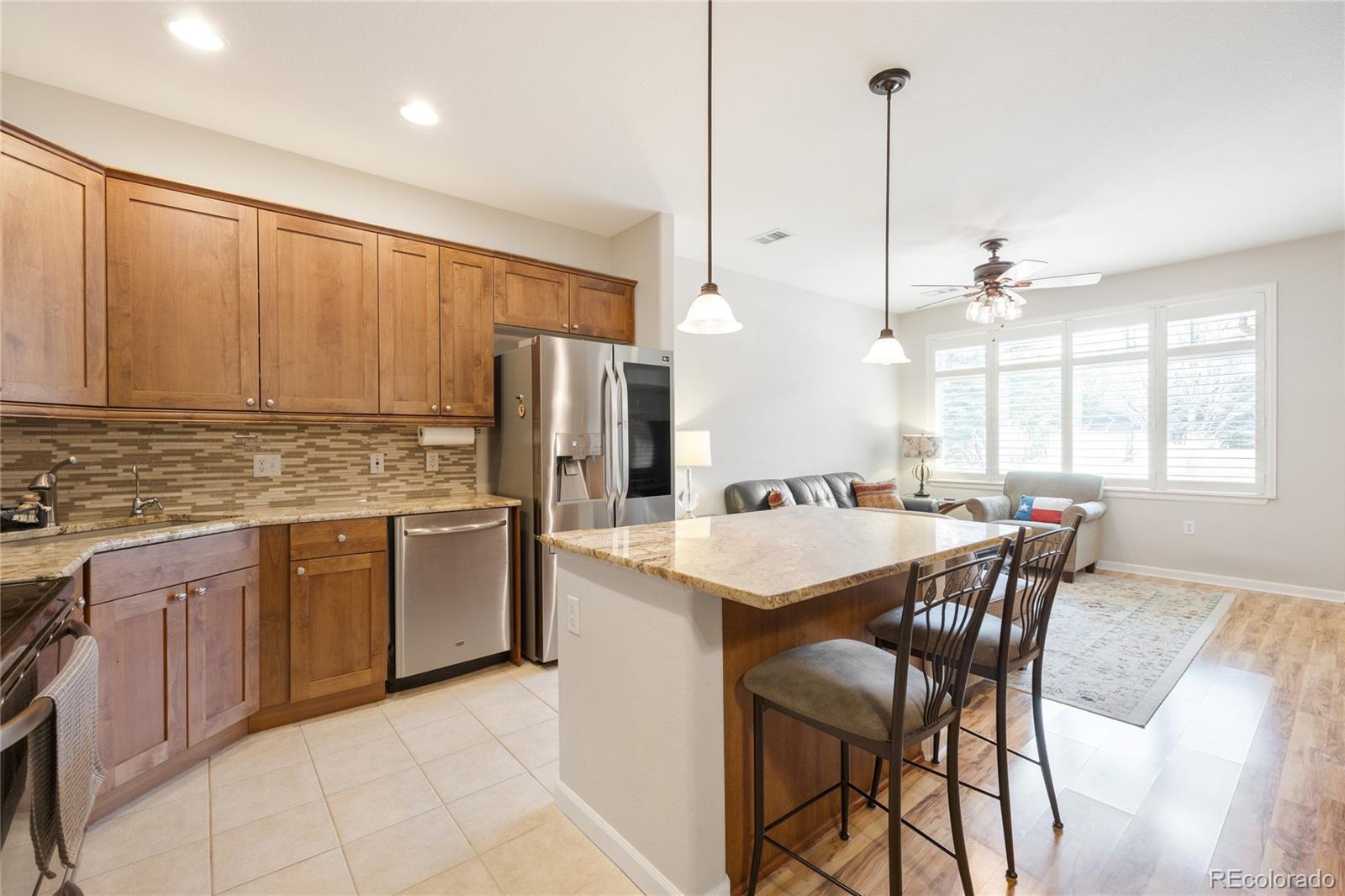 Welcome to gated resort-style living in the highly desirable Gold Peak at Palomino Park community of Highlands Ranch. This Park-Facing beautifully updated condominium offers 2 bedrooms, 2 baths, and approximately 1,133 finished square feet of thoughtfully designed living space, combining comfort, style, and low-maintenance convenience. The inviting interior begins with a tiled entry that opens to a bright living area featuring laminate wood flooring, newer paint, plantation shutters, newer Pella windows, and a stunning three-way fireplace that creates warmth and architectural interest throughout the main living spaces. The upgraded kitchen is both functional and stylish, showcasing granite countertops, glass tile backsplash, stainless steel GE and LG appliances, and 42" alder cabinetry with crown molding. A center island with pendant lighting, storage, and breakfast bar seating flows seamlessly into the dining area—perfect for everyday living or entertaining. The spacious primary suite features laminate wood flooring, plantation shutters, newer windows, a walk-in closet, and a private en-suite bath with granite countertops, updated fixtures, and a large walk-in shower. The secondary bedroom provides excellent flexibility with patio access, a built-in desk niche, ceiling fan, and adjacent full bath featuring granite counters and updated finishes. Additional highlights include a dedicated laundry room with custom cabinetry, added utility sink, drying rod, and LG steam washer and dryer included, plus direct garage access for added convenience. Enjoy the unmatched lifestyle Palomino Park is known for, featuring gated entry, resort-style pools, fitness facilities, tennis and pickleball courts, trails, and beautifully maintained grounds—all just minutes from shopping, dining, parks, and major commuter routes. An exceptional opportunity to own a move-in-ready home in one of Highlands Ranch’s premier gated communities. Click here: https://www.tourfactory.com/3236785