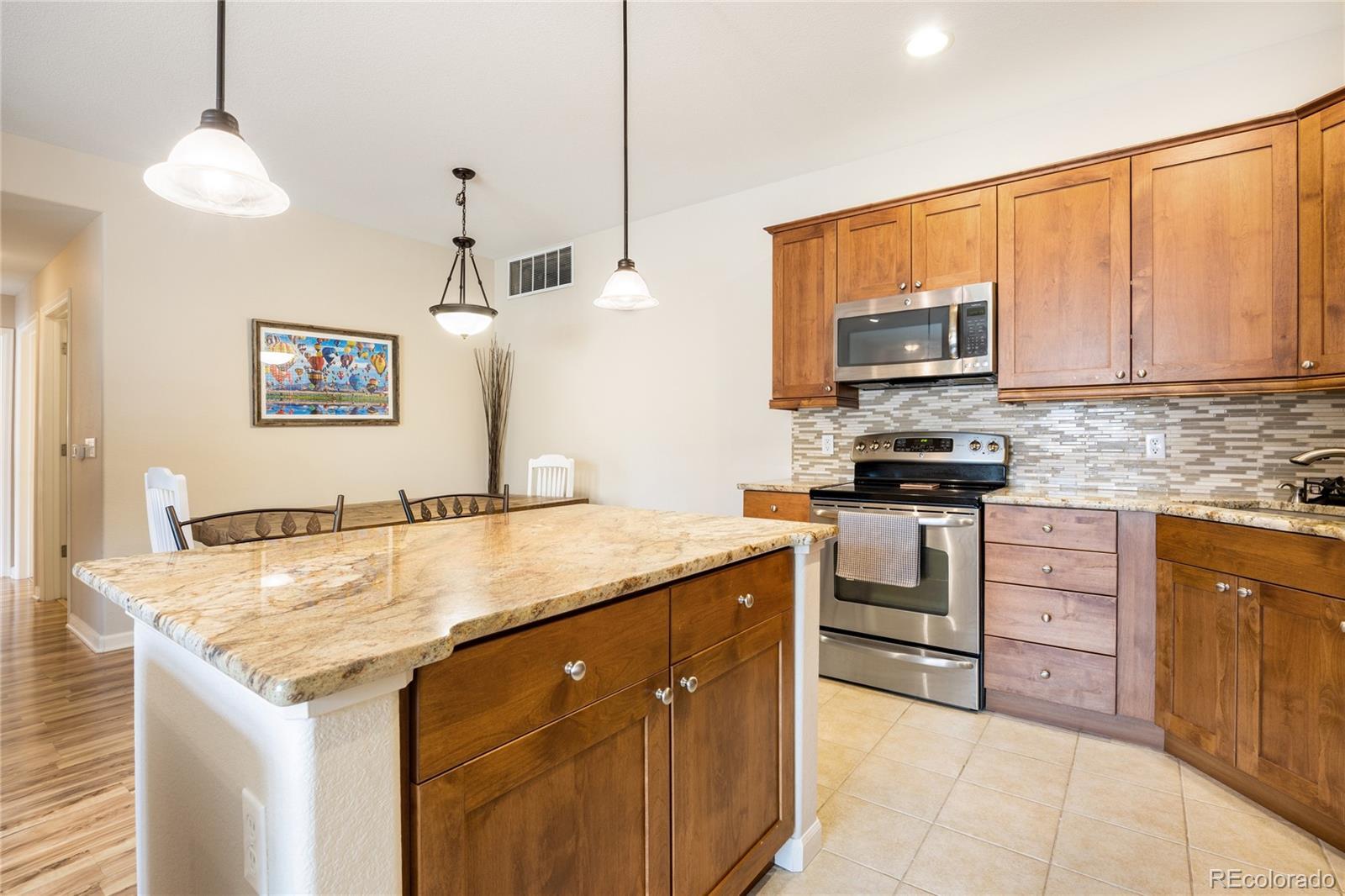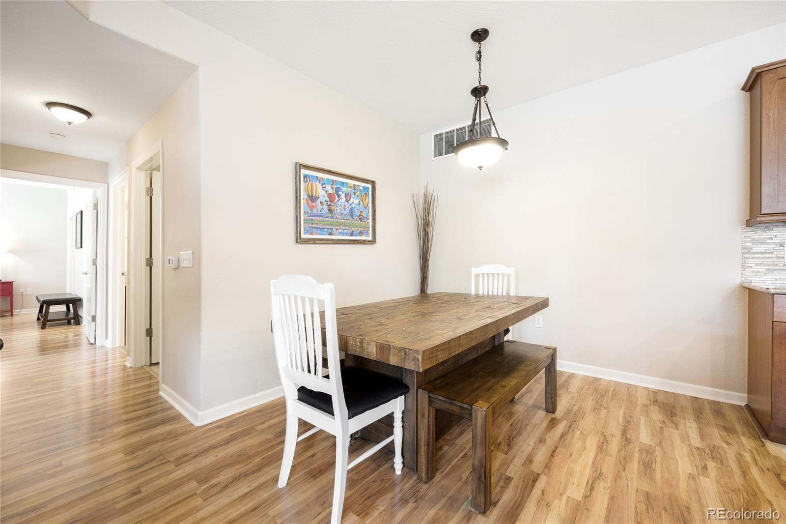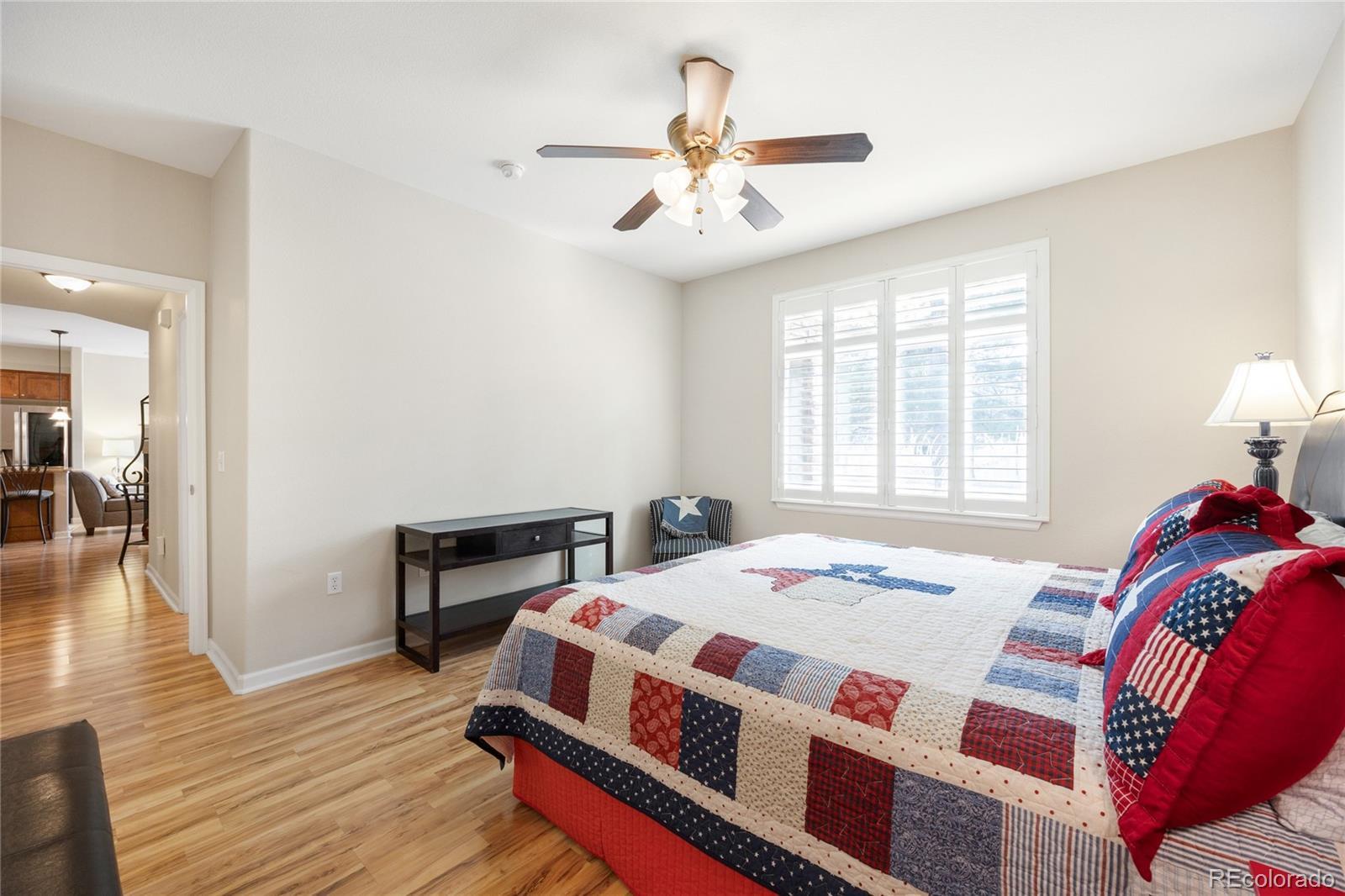 Welcome to gated resort-style living in the highly desirable Gold Peak at Palomino Park community of Highlands Ranch. This Park-Facing beautifully updated condominium offers 2 bedrooms, 2 baths, and approximately 1,133 finished square feet of thoughtfully designed living space, combining comfort, style, and low-maintenance convenience. The inviting interior begins with a tiled entry that opens to a bright living area featuring laminate wood flooring, newer paint, plantation shutters, newer Pella windows, and a stunning three-way fireplace that creates warmth and architectural interest throughout the main living spaces. The upgraded kitchen is both functional and stylish, showcasing granite countertops, glass tile backsplash, stainless steel GE and LG appliances, and 42" alder cabinetry with crown molding. A center island with pendant lighting, storage, and breakfast bar seating flows seamlessly into the dining area—perfect for everyday living or entertaining. The spacious primary suite features laminate wood flooring, plantation shutters, newer windows, a walk-in closet, and a private en-suite bath with granite countertops, updated fixtures, and a large walk-in shower. The secondary bedroom provides excellent flexibility with patio access, a built-in desk niche, ceiling fan, and adjacent full bath featuring granite counters and updated finishes. Additional highlights include a dedicated laundry room with custom cabinetry, added utility sink, drying rod, and LG steam washer and dryer included, plus direct garage access for added convenience. Enjoy the unmatched lifestyle Palomino Park is known for, featuring gated entry, resort-style pools, fitness facilities, tennis and pickleball courts, trails, and beautifully maintained grounds—all just minutes from shopping, dining, parks, and major commuter routes. An exceptional opportunity to own a move-in-ready home in one of Highlands Ranch’s premier gated communities. Click here: https://www.tourfactory.com/3236785
