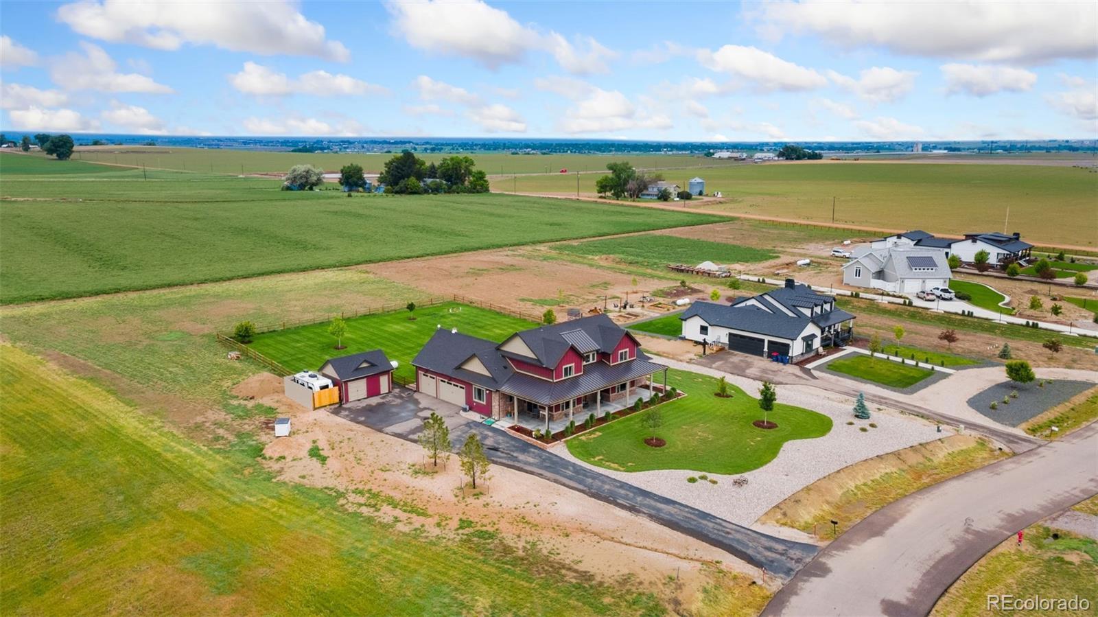 Set on 1.62 fully fenced acres in the sought-after Meadow Farms equestrian community—complete with its own riding loop—this modern farmhouse blends elevated design with everyday livability. From the wraparound front porch with a stained wood ceiling to the thoughtfully layered interiors, every detail feels intentional and inviting. Inside, soaring shiplap ceilings, rich hickory floors, and warm wood beams frame the open living space, anchored by a gas fireplace with full-height stone and herringbone surround. The chef-inspired kitchen is designed for gathering, featuring a Thor six-burner gas range, apron-front sink, soft-close cabinetry, and a beautiful mix of soapstone and quartz countertops. A dedicated coffee bar, custom lighting, and imported vanities add character and polish throughout. The main-floor primary suite offers a true retreat with a stained wood ceiling, patio access, mountain views, and a spa-inspired en suite complete with a copper soaking tub, rain shower, dual sinks, and custom walk-in closet. Upstairs, two spacious bedrooms share a full bath, while a vaulted loft provides flexible space for work or play. The finished basement adds a conforming bedroom, ¾ bath, and generous storage. Outside, over $100K in professional landscaping creates a private outdoor escape with a covered patio, firepit area, shed, and hot tub pad. An oversized three-car garage, dual HVAC systems, and thoughtful mechanical upgrades round out this exceptional property—offering rustic soul, refined design, and room to breathe in one of Northern Colorado’s premier acreage communities.