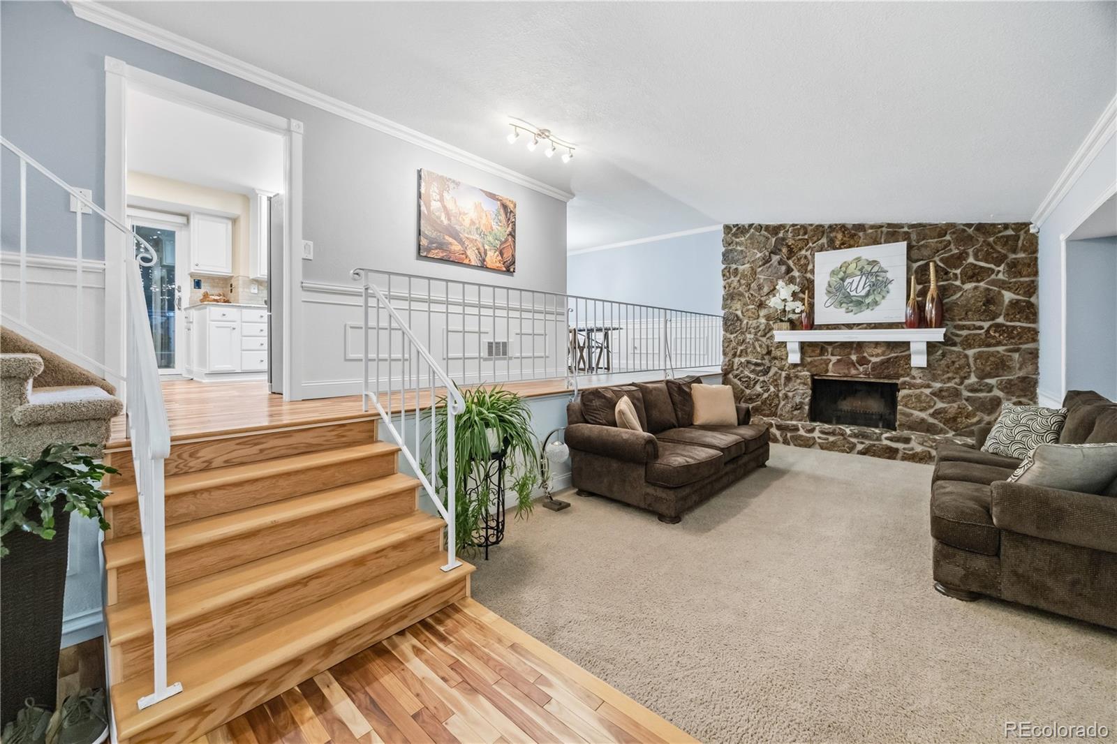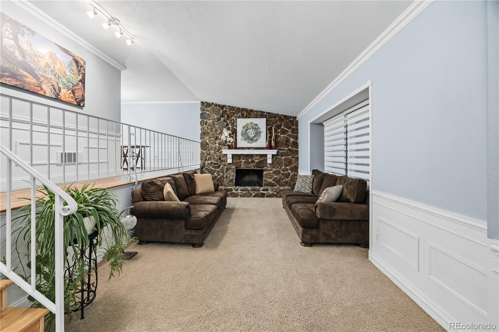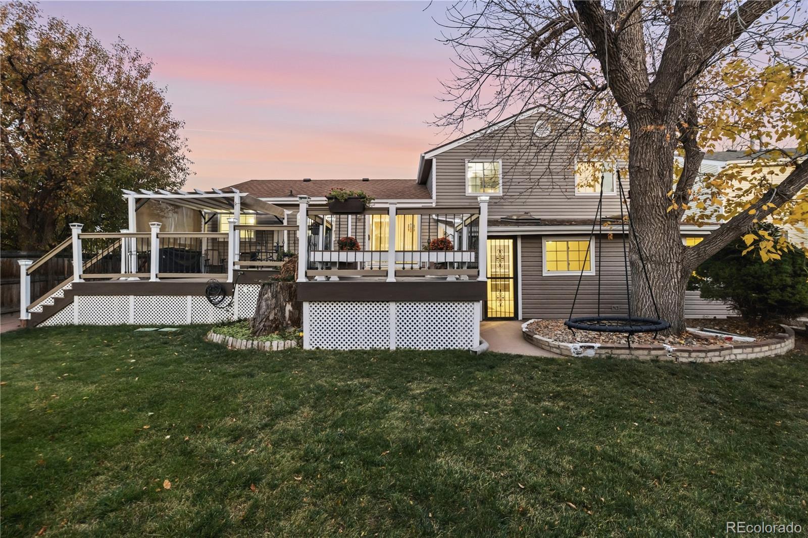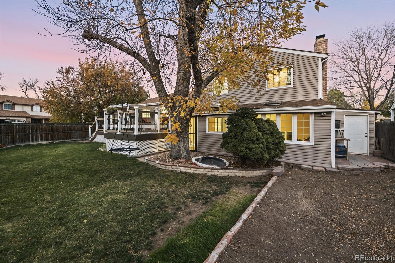 Ask About The Lender Incentives On This House Worth Up To $14,125!! This well cared for multi-level home offers a warm, inviting layout with multiple living areas and thoughtful updates throughout. The main entry opens to a sitting area with a rock-accented fireplace and natural light. From the entry, stairs lead up to the kitchen and dining area, or access to the homes living room. The kitchen features granite countertops, an eat-in breakfast nook, and a sliding door that opens to a large backyard patio. Adjacent to the kitchen is a formal dining space with hardwood floors and open sightlines to the main level. A few steps down, the open living room includes a second fireplace and a built-in niche area ideal for a bar setup. Connected to this space is a bright bonus room addition with skylights, perfect for a playroom, yoga area, or home office with access to the backyard. Upstairs are four bedrooms and two full bathrooms, including a primary suite with a walk-in closet and private bath. The upper hallway bathroom features a skylight that fills the space with natural light. A half bath and laundry area are conveniently located near the garage entry on the lower level. The finished basement adds a third living area with vinyl flooring, shelving, and a separate storage room. Outside, the corner lot is beautifully landscaped with a custom walkway, mature plants, and a front yard water feature with a small pond. The backyard offers a spacious patio with multiple seating areas, a designated barbecue space, and an open lawn surrounded by well maintained landscaping. Additional features include RV parking, an attached workshop/shed, and fully paid-off solar panels. Located near Columbine High School, parks, golf courses, and with easy access to the mountains and highways, this home combines comfort, craftsmanship, and convenience.