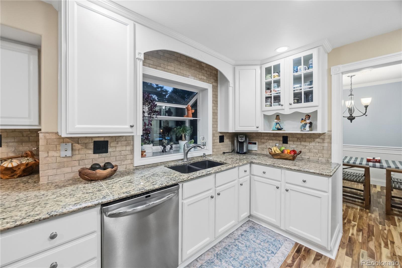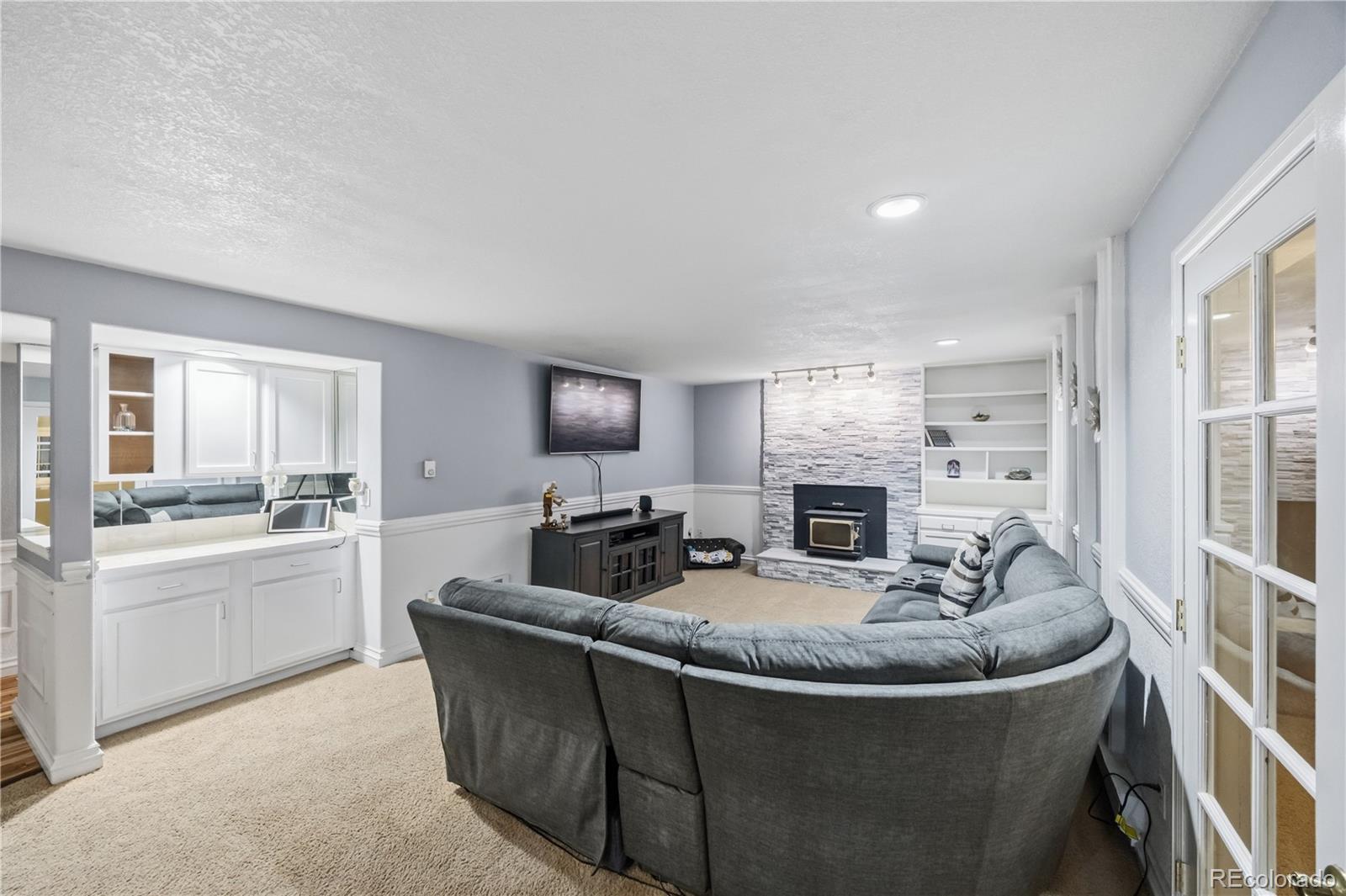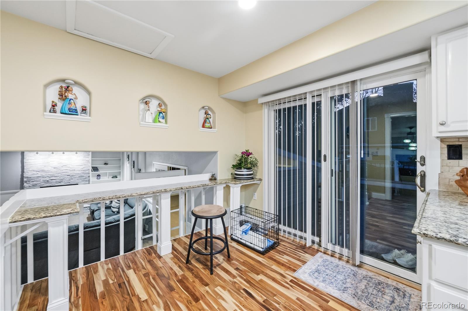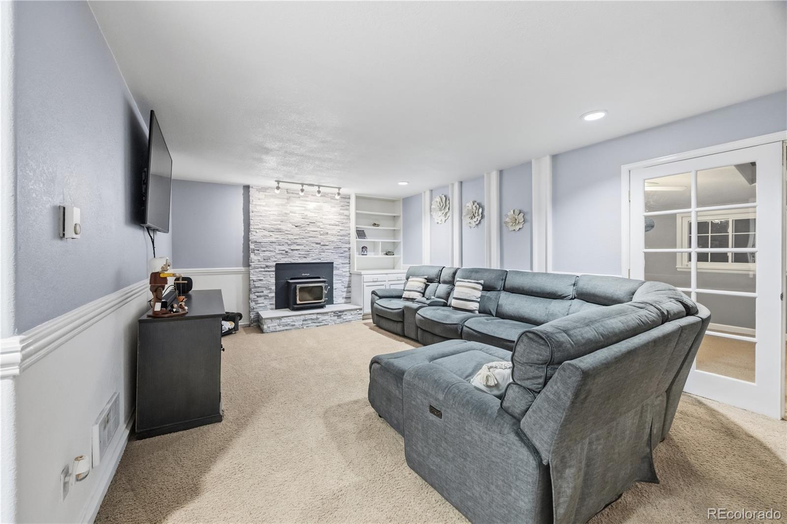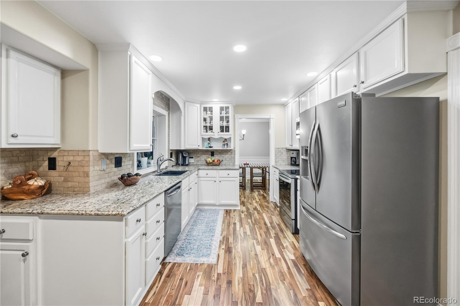 Ask About The Lender Incentives On This House Worth Up To $14,125!! This well cared for multi-level home offers a warm, inviting layout with multiple living areas and thoughtful updates throughout. The main entry opens to a sitting area with a rock-accented fireplace and natural light. From the entry, stairs lead up to the kitchen and dining area, or access to the homes living room. The kitchen features granite countertops, an eat-in breakfast nook, and a sliding door that opens to a large backyard patio. Adjacent to the kitchen is a formal dining space with hardwood floors and open sightlines to the main level. A few steps down, the open living room includes a second fireplace and a built-in niche area ideal for a bar setup. Connected to this space is a bright bonus room addition with skylights, perfect for a playroom, yoga area, or home office with access to the backyard. Upstairs are four bedrooms and two full bathrooms, including a primary suite with a walk-in closet and private bath. The upper hallway bathroom features a skylight that fills the space with natural light. A half bath and laundry area are conveniently located near the garage entry on the lower level. The finished basement adds a third living area with vinyl flooring, shelving, and a separate storage room. Outside, the corner lot is beautifully landscaped with a custom walkway, mature plants, and a front yard water feature with a small pond. The backyard offers a spacious patio with multiple seating areas, a designated barbecue space, and an open lawn surrounded by well maintained landscaping. Additional features include RV parking, an attached workshop/shed, and fully paid-off solar panels. Located near Columbine High School, parks, golf courses, and with easy access to the mountains and highways, this home combines comfort, craftsmanship, and convenience.