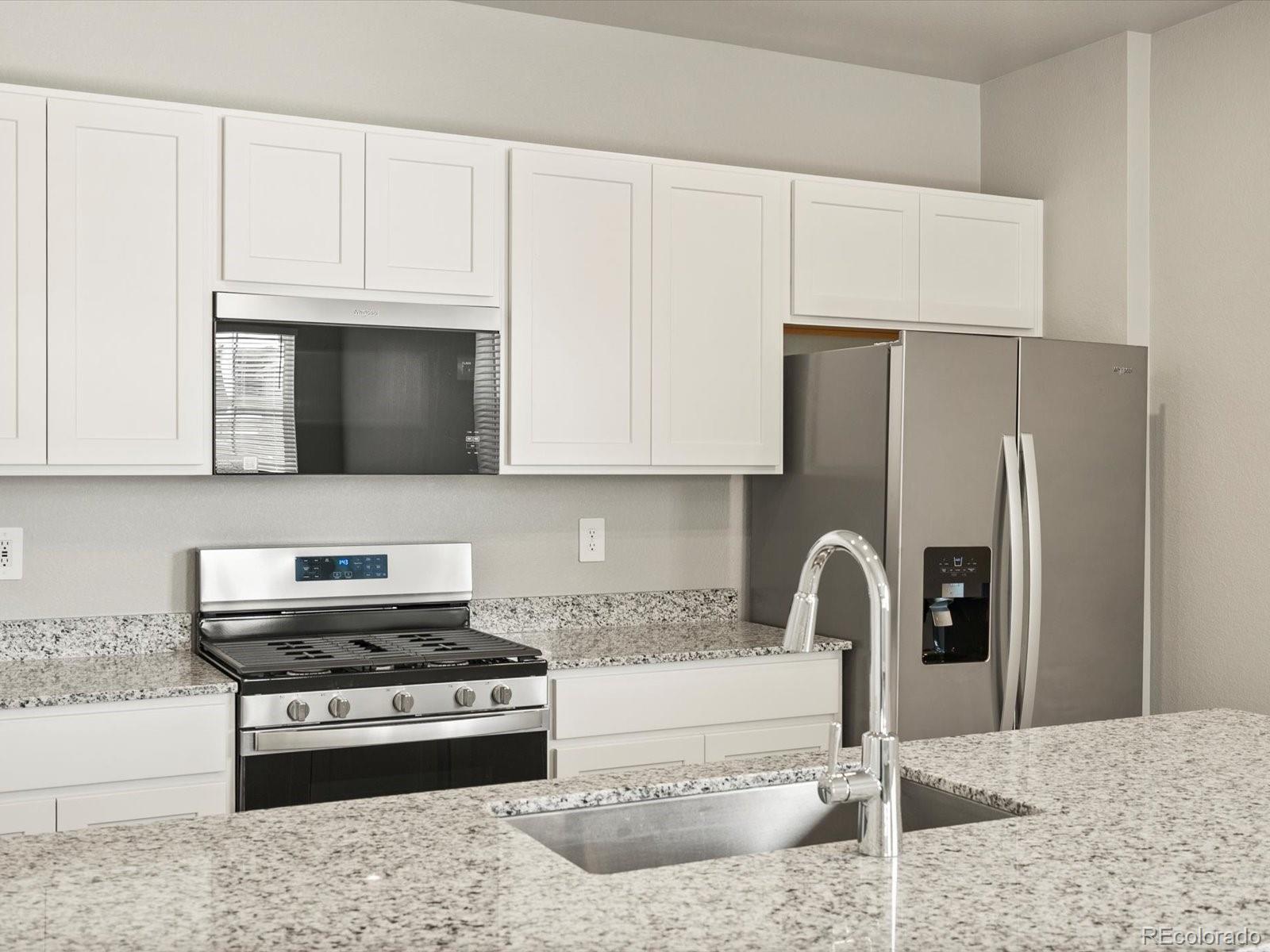 Open concept kitchen with granite countertops and white cabinets! The Woodland is a stylish end-unit townhome featuring an open-concept main floor and a welcoming covered front porch. Upstairs offers a private primary suite with walk-in closet, plus two additional bedrooms and a versatile landing space. With 2.5 baths and a two-bay garage, this design blends comfort and functionality. The Meritage Home difference includes spray-foam insulation, advanced air filtration for year-round comfort and healthier air, and durable cementitious siding known for its strength, fire-resistance, and long-lasting performance. A Whirlpool appliance package, and full home blinds are also included for move-in convenience. Welcome home where every detail is built for comfort, efficiency, and LIFE. BUILT. BETTER. Horizon Uptown is a walkable, master-planned community in Aurora featuring parks, a dog park, and tennis courts. Located at I-70 and E-470, it offers quick access to Denver International Airport, downtown Denver, the Fitzsimons Innovation Community, the Denver Tech Center, and major entertainment destinations. *This home qualifies for special incentives through builder preferred lender for a limited time. Terms and conditions apply. See sales counselor for details!