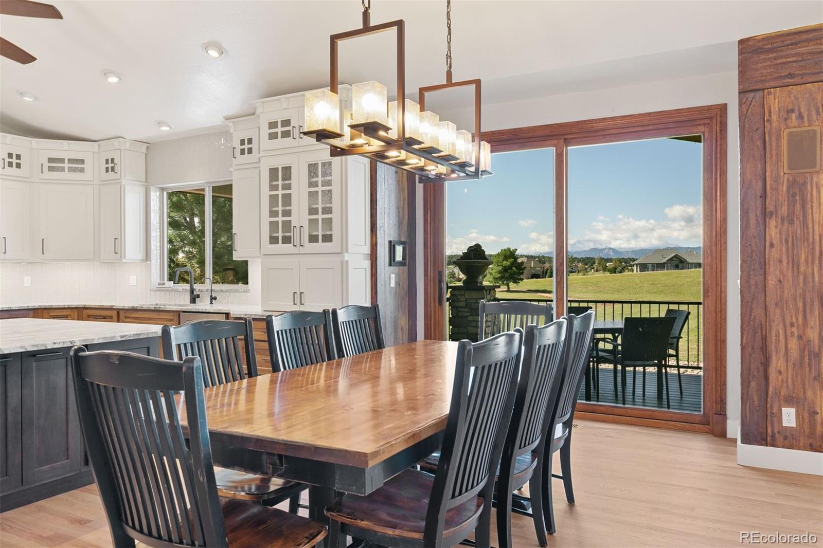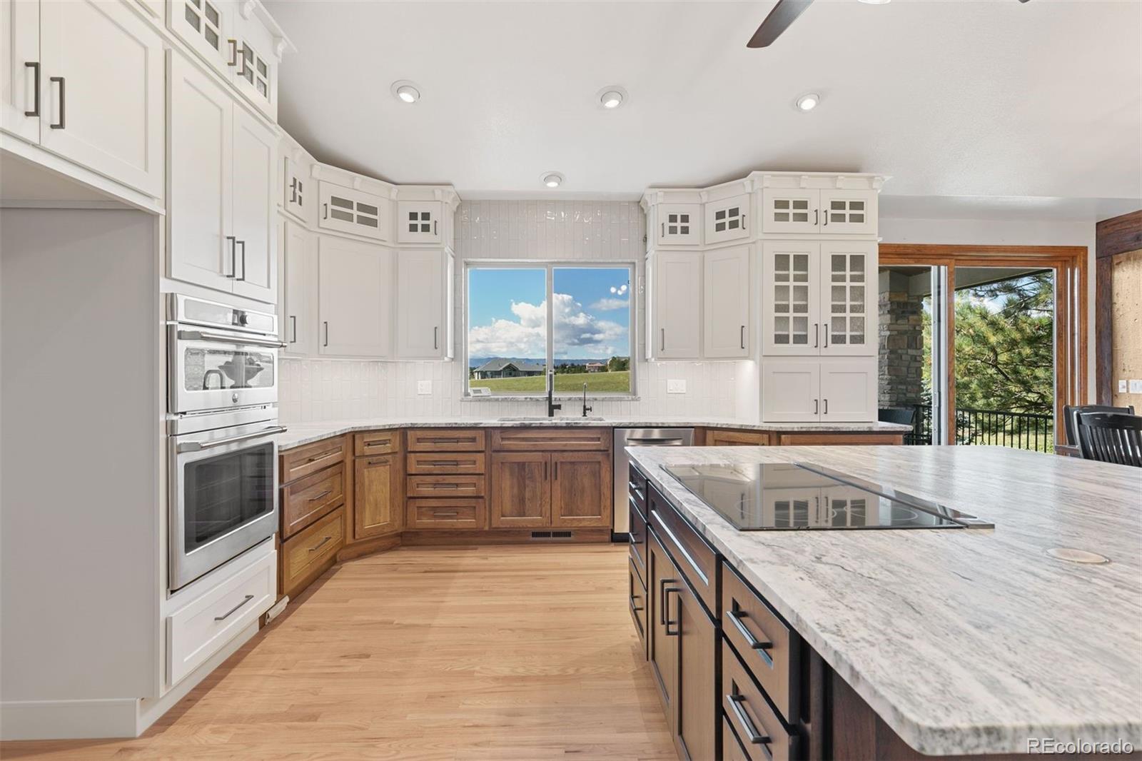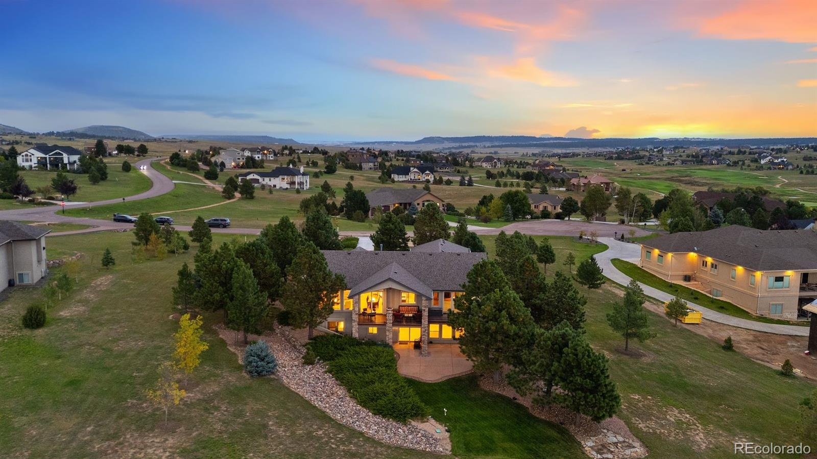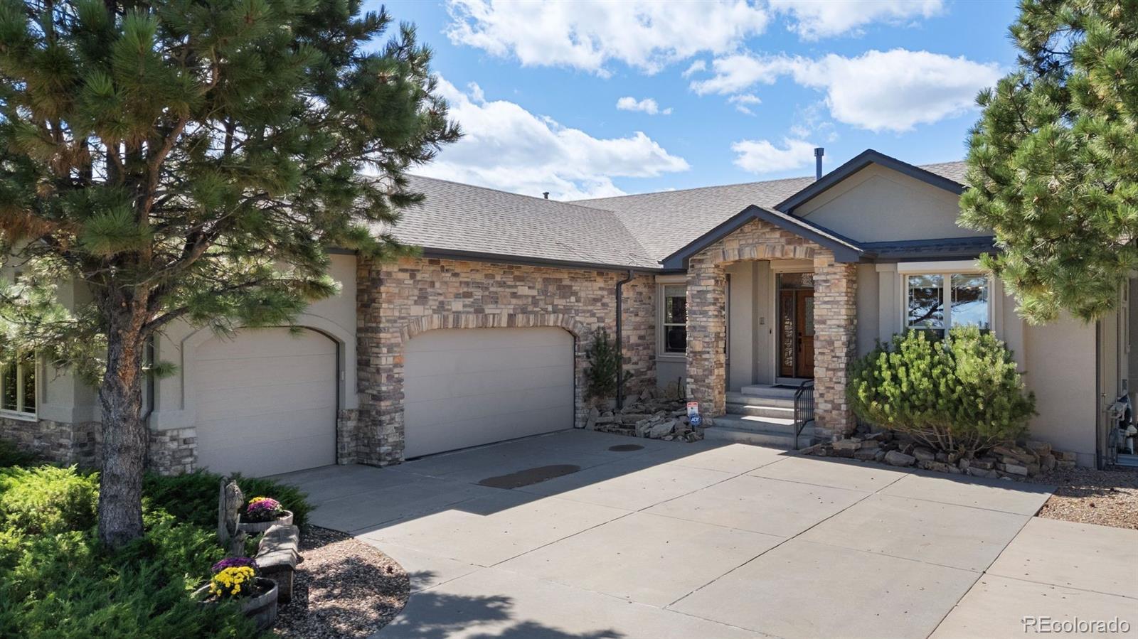 Stunning ranch home with walkout basement & impressive Pikes Peak and Front Range views. Welcome to this beautifully appointed home located in King’s Deer Highlands, offering 4,608 sq. ft. of thoughtfully designed living space, including a walk-out basement. With 5 beds, 4 baths, and an abundance of custom features, this home blends comfort, function, and style. The heart of the home is the remodeled gourmet kitchen, showcasing leathered granite counters, custom soft-close cabinetry with dovetailed drawers, lower roll-out shelves, and under-cabinet LED lighting. A spacious butler’s pantry with custom cabinetry adds convenience and elegance. Stunning hardwood floors flow throughout the main level, enhancing the open and inviting feel. The primary suite offers access to the rear deck, a generous walk-in closet, and a spa-like 5-piece bath. Also on the main level are a second bedroom and full bath, a flex space perfect for a dining room, home office, or library, and a well-appointed laundry room with granite counters, a sink with spray faucet, and abundant storage. Custom iron railings lead to the finished walk-out basement, designed for entertaining. Here you’ll find a full wet bar with granite counters, tile backsplash, sink with spray faucet, as well as a large family room with a wood-burning stove. Three additional bedrooms and two baths provide comfort and privacy for all. Outdoor living is just as impressive. Enjoy Pikes Peak and Front Range views from the covered composite deck, relax by the water feature on the lower patio, or take in the serenity of the 2.5-acre homesite. Additional highlights include an oversized 3-car garage with commercial-grade steel doors, added shelving, insulated aluminum security shutters on all doors and windows, a whole-house surge protector, and a Generac generator providing peace of mind year-round, new roof and so much more. Meticulously cared for, this home reflects true pride of ownership and is ready to welcome its next owner.