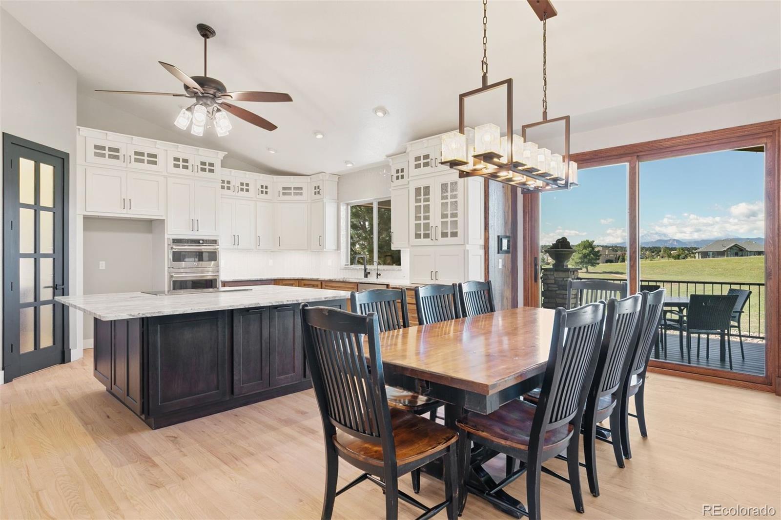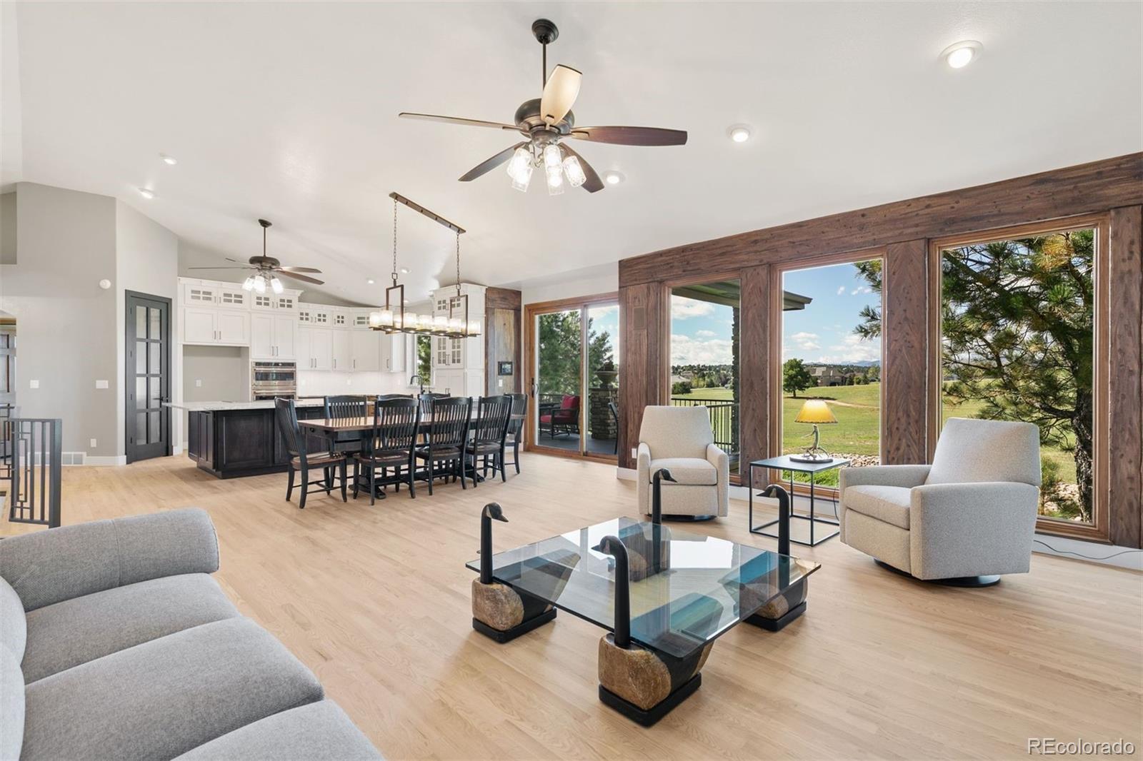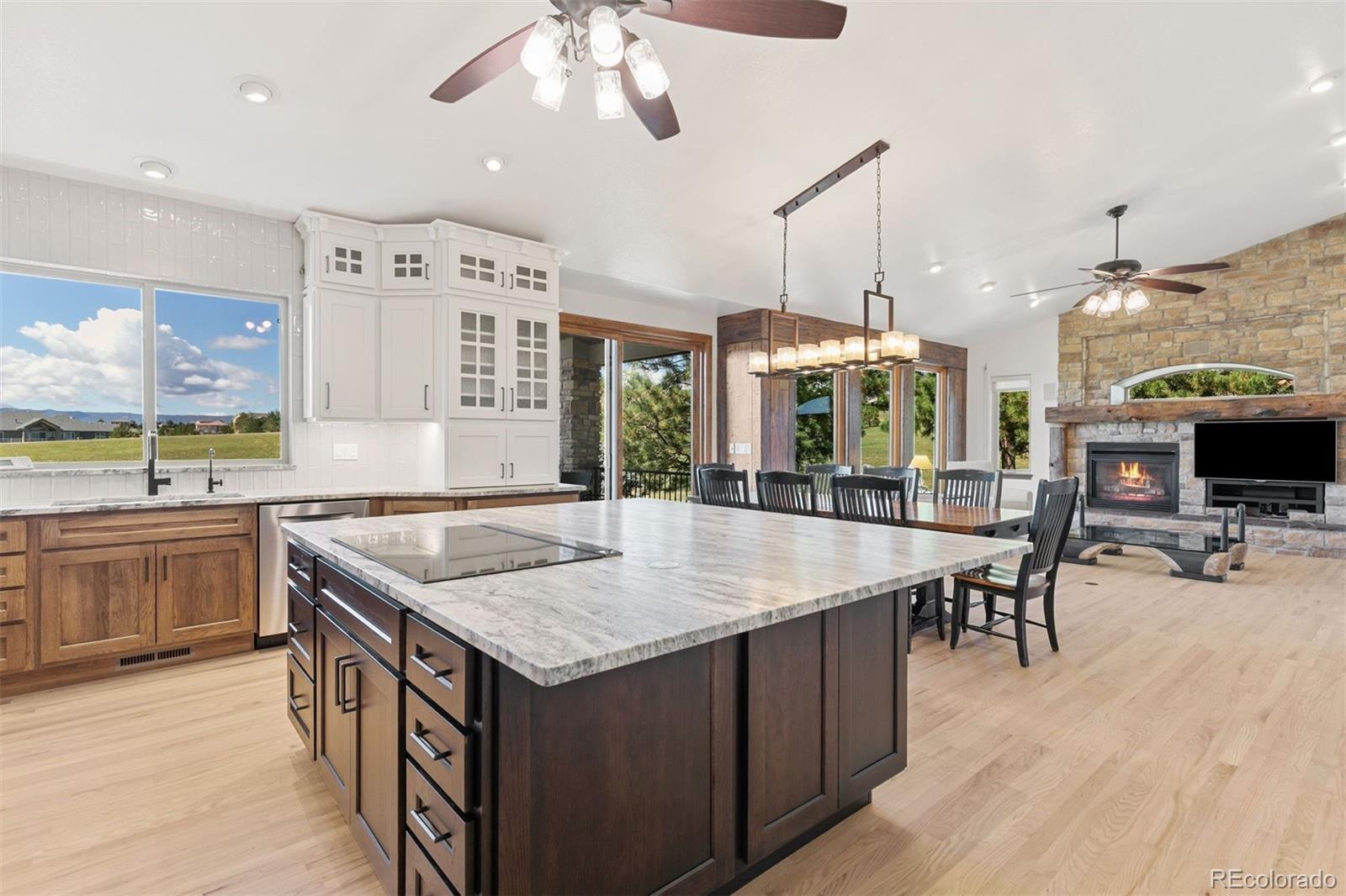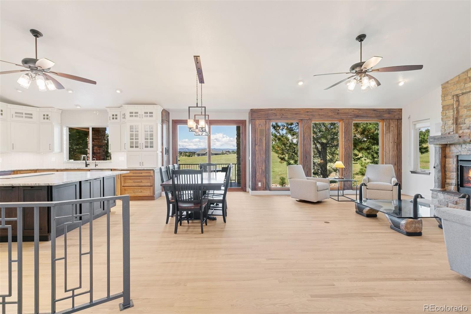 Stunning ranch home with walkout basement & impressive Pikes Peak and Front Range views. Welcome to this beautifully appointed home located in King’s Deer Highlands, offering 4,608 sq. ft. of thoughtfully designed living space, including a walk-out basement. With 5 beds, 4 baths, and an abundance of custom features, this home blends comfort, function, and style. The heart of the home is the remodeled gourmet kitchen, showcasing leathered granite counters, custom soft-close cabinetry with dovetailed drawers, lower roll-out shelves, and under-cabinet LED lighting. A spacious butler’s pantry with custom cabinetry adds convenience and elegance. Stunning hardwood floors flow throughout the main level, enhancing the open and inviting feel. The primary suite offers access to the rear deck, a generous walk-in closet, and a spa-like 5-piece bath. Also on the main level are a second bedroom and full bath, a flex space perfect for a dining room, home office, or library, and a well-appointed laundry room with granite counters, a sink with spray faucet, and abundant storage. Custom iron railings lead to the finished walk-out basement, designed for entertaining. Here you’ll find a full wet bar with granite counters, tile backsplash, sink with spray faucet, as well as a large family room with a wood-burning stove. Three additional bedrooms and two baths provide comfort and privacy for all. Outdoor living is just as impressive. Enjoy Pikes Peak and Front Range views from the covered composite deck, relax by the water feature on the lower patio, or take in the serenity of the 2.5-acre homesite. Additional highlights include an oversized 3-car garage with commercial-grade steel doors, added shelving, insulated aluminum security shutters on all doors and windows, a whole-house surge protector, and a Generac generator providing peace of mind year-round, new roof and so much more. Meticulously cared for, this home reflects true pride of ownership and is ready to welcome its next owner.