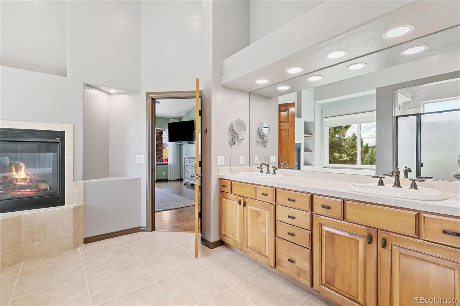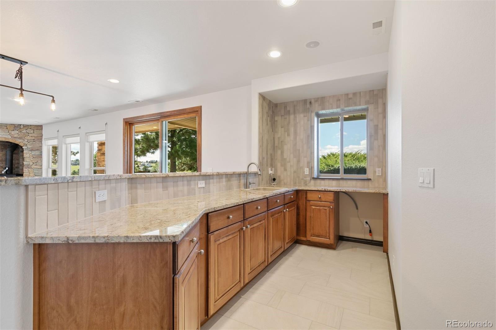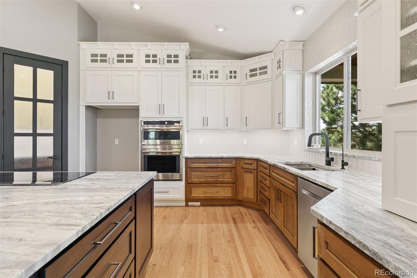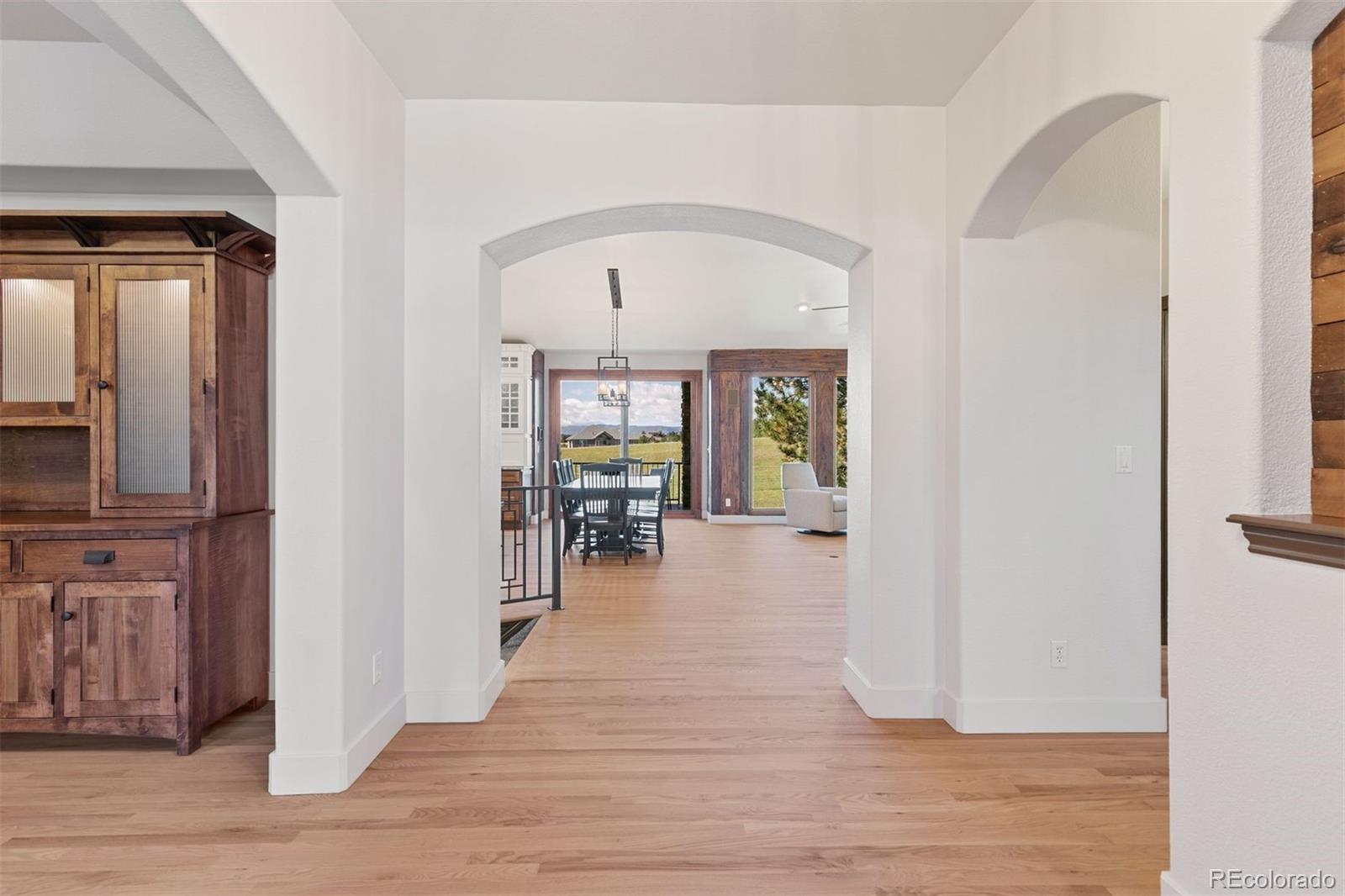 Stunning ranch home with walkout basement & impressive Pikes Peak and Front Range views. Welcome to this beautifully appointed home located in King’s Deer Highlands, offering 4,608 sq. ft. of thoughtfully designed living space, including a walk-out basement. With 5 beds, 4 baths, and an abundance of custom features, this home blends comfort, function, and style. The heart of the home is the remodeled gourmet kitchen, showcasing leathered granite counters, custom soft-close cabinetry with dovetailed drawers, lower roll-out shelves, and under-cabinet LED lighting. A spacious butler’s pantry with custom cabinetry adds convenience and elegance. Stunning hardwood floors flow throughout the main level, enhancing the open and inviting feel. The primary suite offers access to the rear deck, a generous walk-in closet, and a spa-like 5-piece bath. Also on the main level are a second bedroom and full bath, a flex space perfect for a dining room, home office, or library, and a well-appointed laundry room with granite counters, a sink with spray faucet, and abundant storage. Custom iron railings lead to the finished walk-out basement, designed for entertaining. Here you’ll find a full wet bar with granite counters, tile backsplash, sink with spray faucet, as well as a large family room with a wood-burning stove. Three additional bedrooms and two baths provide comfort and privacy for all. Outdoor living is just as impressive. Enjoy Pikes Peak and Front Range views from the covered composite deck, relax by the water feature on the lower patio, or take in the serenity of the 2.5-acre homesite. Additional highlights include an oversized 3-car garage with commercial-grade steel doors, added shelving, insulated aluminum security shutters on all doors and windows, a whole-house surge protector, and a Generac generator providing peace of mind year-round, new roof and so much more. Meticulously cared for, this home reflects true pride of ownership and is ready to welcome its next owner.