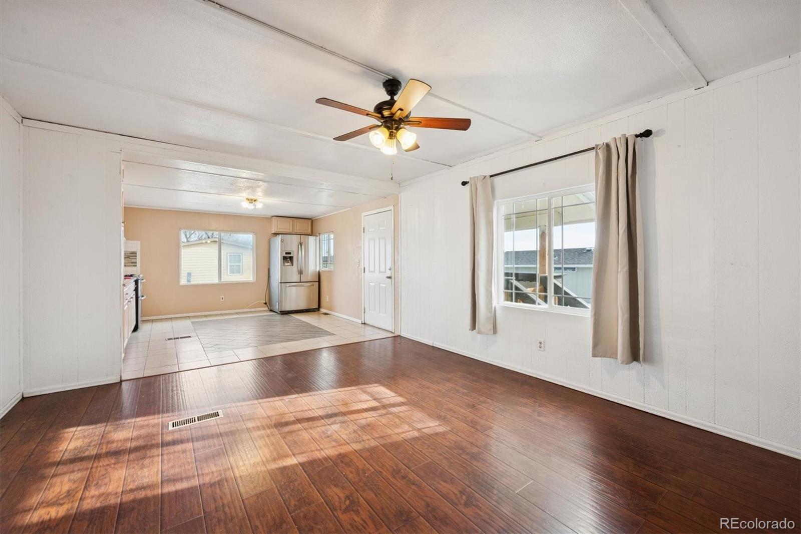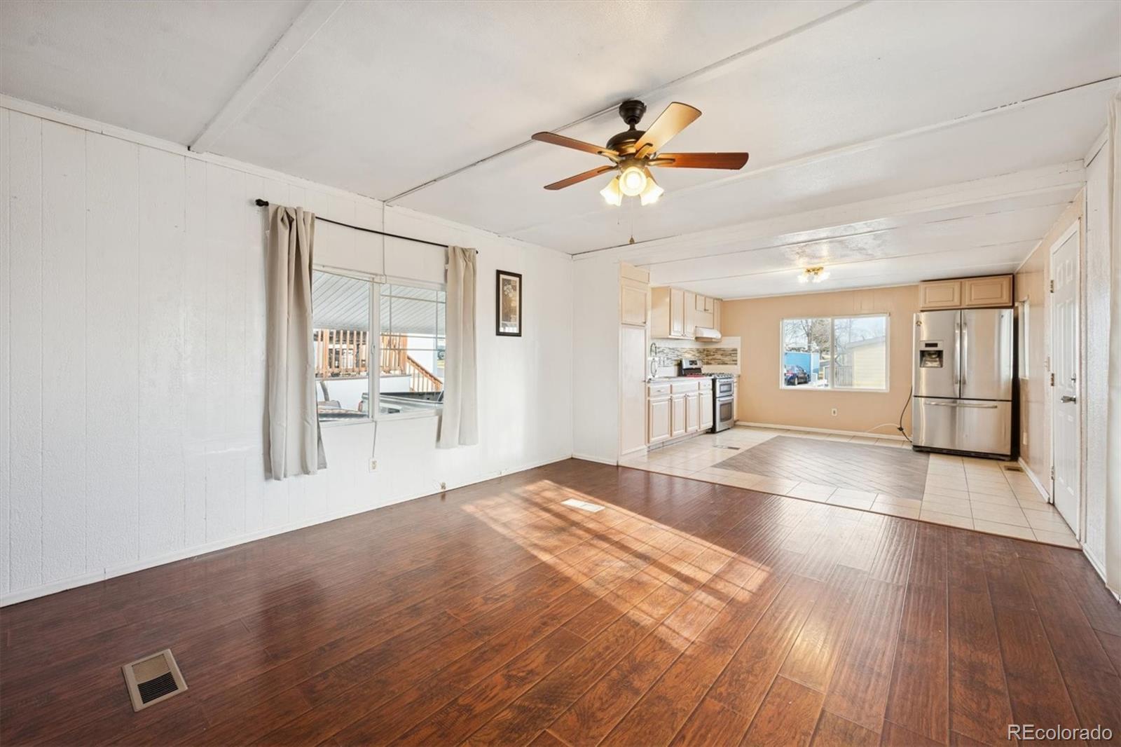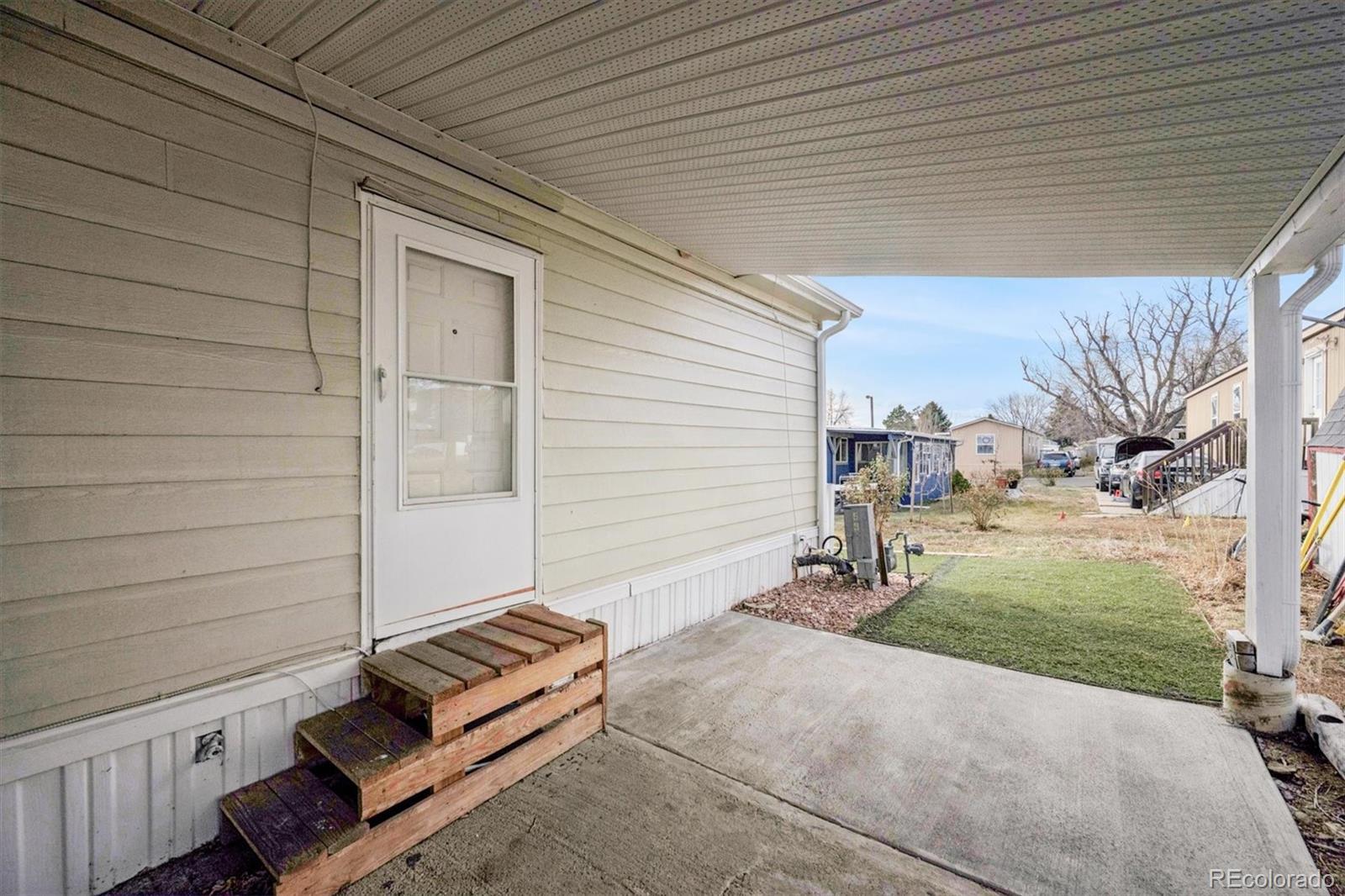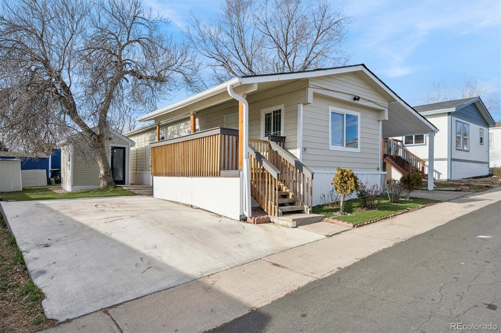 Situated in the Friendly Village of the Rockies, this move-in-ready 2-bedroom, 1-bath home offers tasteful updates and a comfortable, functional layout. The exterior has been thoughtfully improved with fresh siding, skirting, paint, new windows, and new gutters. A pitched roof and brand-new Trex deck enhance both durability and curb appeal, creating the perfect space to relax or entertain. Parking is a standout feature, with a carport accommodating up to three vehicles, plus additional space on the opposite side of the home for a fourth vehicle. A new 10x12 insulated storage shed with electric adds exceptional versatility, and exterior electrical outlets provide added convenience for tools, lighting, or seasonal décor. Inside, the open and bright family room features large windows and a ceiling fan for year-round comfort. The eat-in kitchen offers beautiful tile flooring, like-new stainless steel appliances, and a refrigerator only three years old, with ample space for dining. Major system upgrades include a brand-new A/C unit and water heater, offering peace of mind. The secondary bedroom features laminate flooring and a built-in light fixture, while the primary bedroom serves as a comfortable retreat with laminate flooring, fresh white paint, a built-in light fixture, and direct access to the en-suite bathroom. The bathroom is light and airy with a spacious single-sink vanity and a shower/tub combo. This well-maintained home is truly move-in ready. CALL TO SCHEDULE A SHOWING TODAY.