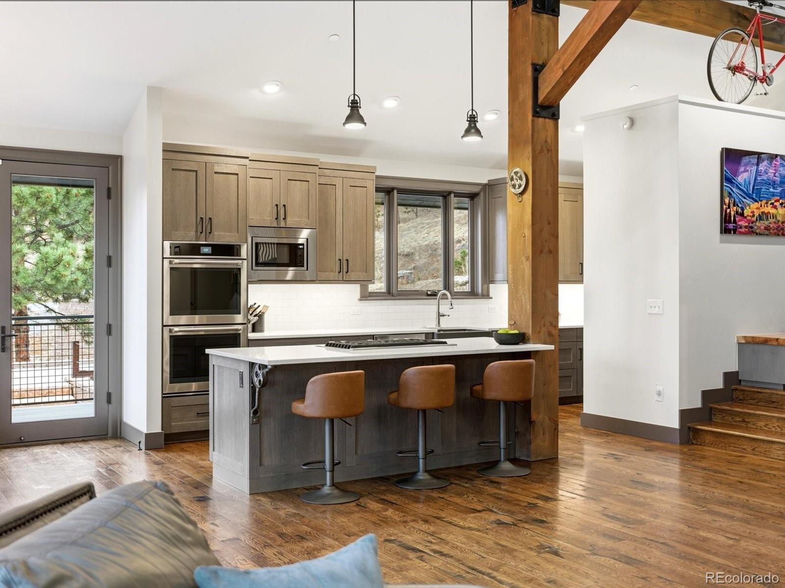 Every detail reflects intentional design and mountain character. Custom finishes include built-ins in the expansive mudroom and countertops crafted from trees originally cleared from the lot, creating a warm, authentic feel throughout. Large wooden beams draw your eye to the soaring ceilings and stunning views from nearly every room. Metal finishes accent the staircase, illuminated across all three levels, along with a custom bathroom vanity designed for the outdoor enthusiast. Expansive windows and skylights fill the main living spaces with natural light and foothills views. Radiant heat warms the first and second floors, with the third floor heat/AC ready. A high-end boiler powers the heated driveway and 115-gallon hot water tank, complemented by a whole-home circulator pump for near-instant hot water. Two gas fireplaces and a fire suppression system add comfort and peace of mind.Outdoor living shines with two expansive deck levels ideal for entertaining or relaxing in the mountain air. The epoxy-coated 3-car garage offers generous storage, while the bike shop features an 8-foot door with direct deck access. A spacious mudroom and attached oversized shed provide excellent storage, while comprehensive fire mitigation, newly built cistern for community fire mitigation and, a backup generator ensure year-round reliability.The chef’s kitchen features custom cabinetry, a walk-in pantry, and JennAir appliances. Washer and dryer are included, plus an additional upstairs washer/dryer combo. Endless storage and an on-property climbing wall complete this refined mountain basecamp blending rugged beauty, modern comfort, and inspired design.