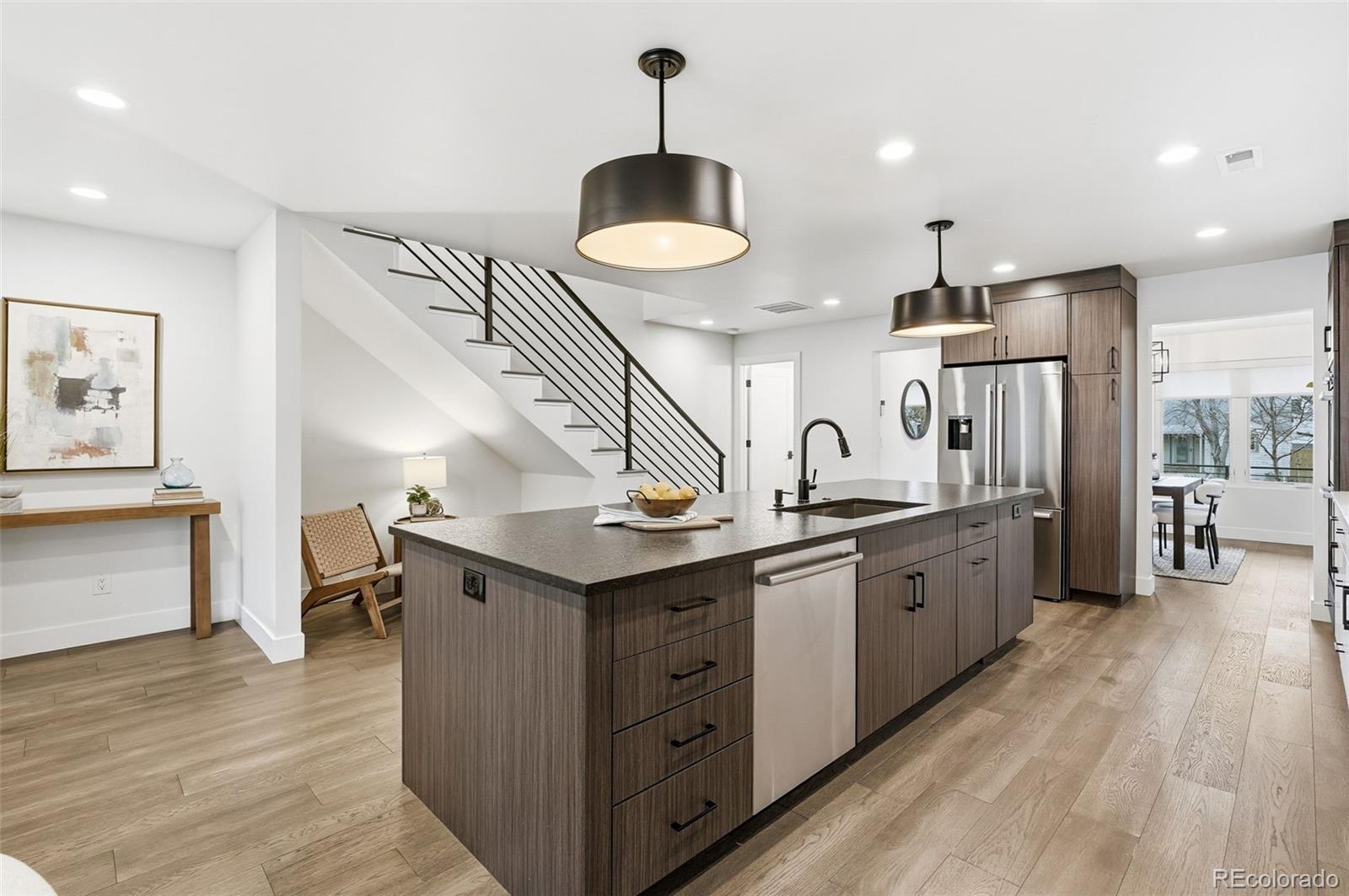 Built in 2021 and ideally positioned just a block from the shops and restaurants along Downing Street, this modern 3-bedroom, 2.5-bath residence offers 2,008 square feet of thoughtfully designed living space in one of Denver’s most desirable neighborhoods. Located near the University of Denver and Porter Hospital, the home combines walkability, convenience, and contemporary style. The open main level features a spacious kitchen with Bosch stainless steel appliances, quartz countertops, and a large center island, ideal for everyday living and entertaining. The low-maintenance turf backyard creates a private outdoor retreat, while the detached 2-car garage adds flexibility and convenience. It also is EV charging ready. Upstairs, the primary suite includes a generous walk-in closet and a private balcony. A dedicated laundry closet accommodates a full-size washer and dryer, both included. With modern finishes, efficient design, and an unbeatable location near parks, dining, and major corridors, this home offers a rare opportunity for low-maintenance living in central Denver.