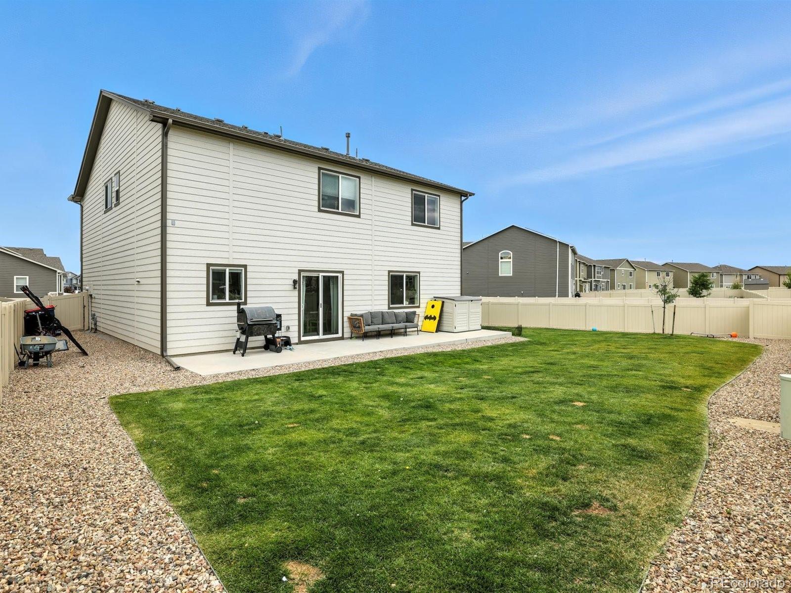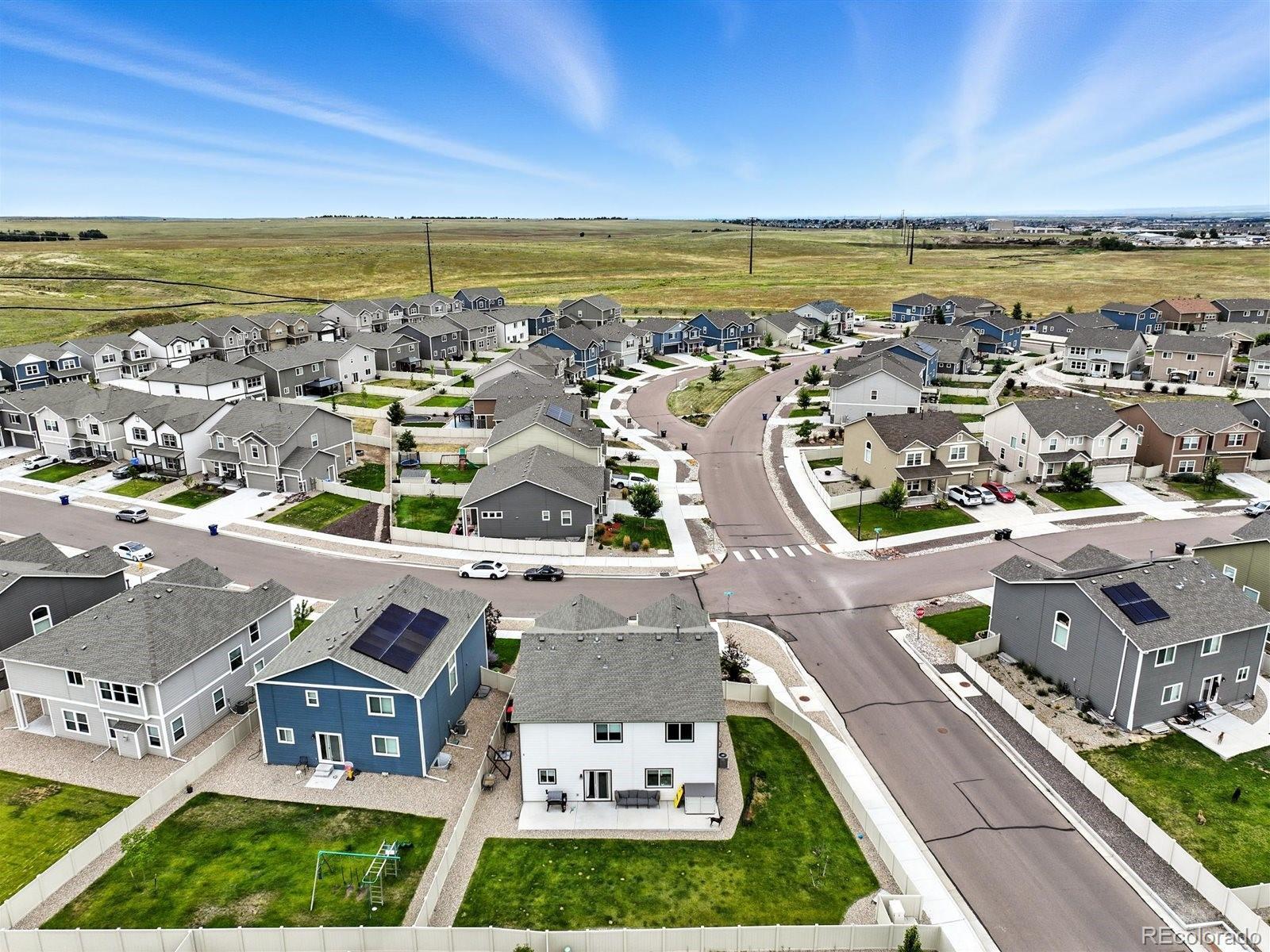 Where style meets comfort — welcome to your next chapter in the Enclaves at Mountain Vista Ranch! Built in 2023 on a corner lot with mountain views, this 2-story home blends designer finishes with everyday functionality. Step inside to a sunlit entry and dedicated office accented with a custom feature wall. The open main level flows effortlessly from the living room to a gourmet kitchen boasting granite counters, a spacious island, custom soft-close cabinetry, stainless steel appliances with gas range, and a walk-in pantry. The dining area opens to a fully fenced backyard equipped with a sprinkler system, and a 38’ x 8’ patio—perfect for Colorado evenings. Upstairs, retreat to a luxurious primary suite with a spa-inspired 5-piece bath, and oversized walk-in closet. Two additional bedrooms each feature walk-in closets, while a versatile loft offers space for a second living area, playroom, or home gym. A full bath with dual sinks and an upstairs laundry room add convenience. Every detail has been thought of—Normann blackout custom blinds throughout, newer furnace and water heater, whole-home humidifier, central A/C, ceiling fans, and a finished 2-car garage. Community perks include parks, playgrounds, and quick access to shopping, dining, schools, and commuter routes. Move-in ready, thoughtfully designed, and packed with upgrades—this home is ready to impress.