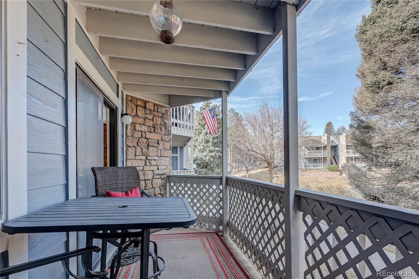 Beautifully remodeled one bedroom one bathroom ground-floor corner unit — just steps from the beloved Highline Canal trails and everything this vibrant community has to offer. Step inside to an open floor plan with rich Brazilian Koa flooring beneath your feet, setting a warm, sophisticated tone from the moment you arrive. Gourmet kitchen, featuring a full suite of Bosch stainless steel appliances, granite countertops — elegant details that make everyday living feel elevated. Dedicated dining area, covered balcony, beside a tranquil pond view framed by mature greenery. The balcony is large enough for a bistro table or two, and includes a secure storage closet for all your gear between adventures. The primary bedroom easily accommodates a king-sized bed and features a spacious walk-in closet. The full bath impresses with a walk-in shower finished in floor-to-ceiling tile, while a cozy gas insert fireplace anchors the living space on cooler evenings. Full-size washer and dryer included. Practical peace of mind comes standard: your reserved parking space is just steps from your front door, and an updated electrical panel means one less thing to think about after move-in.