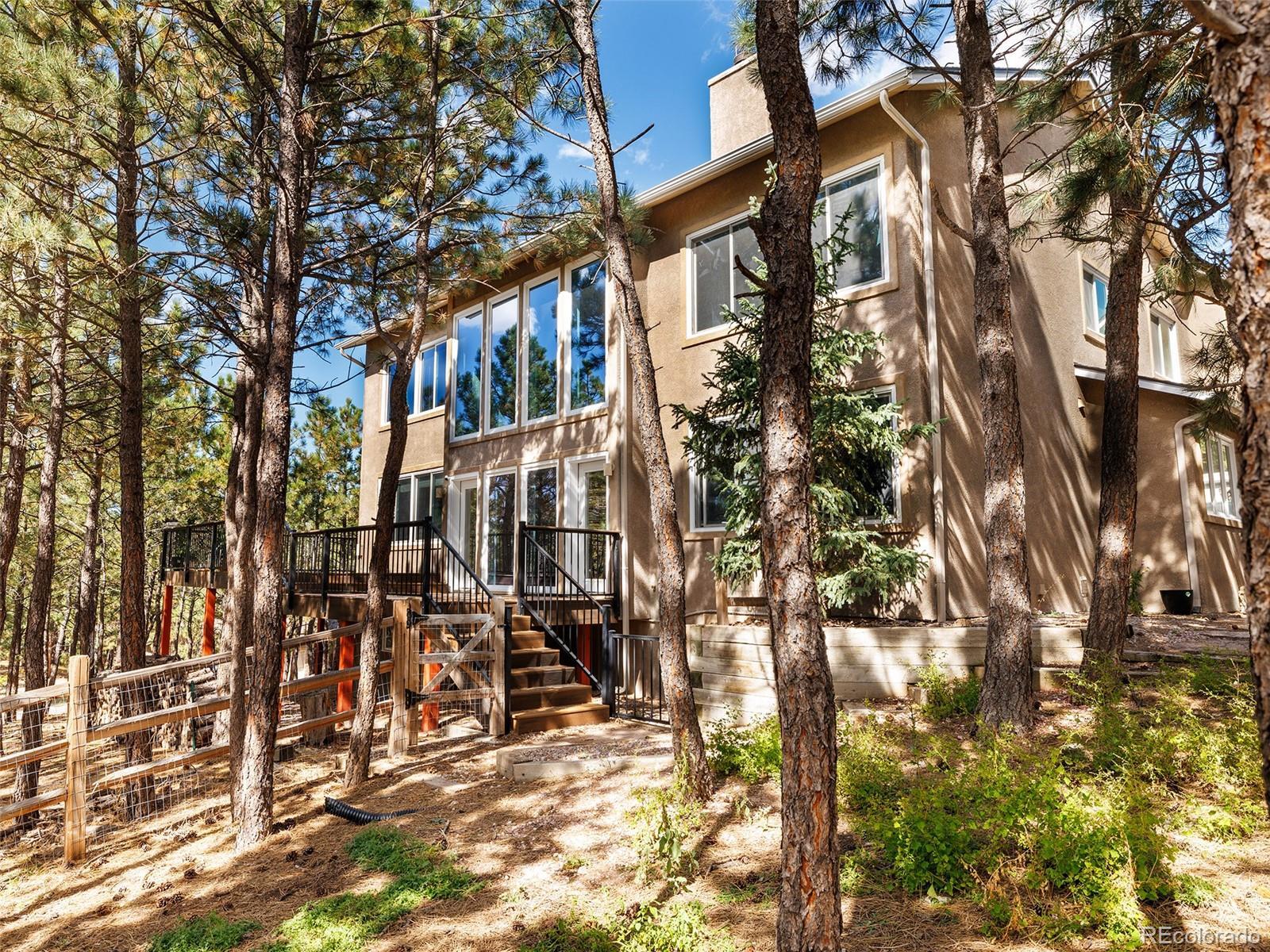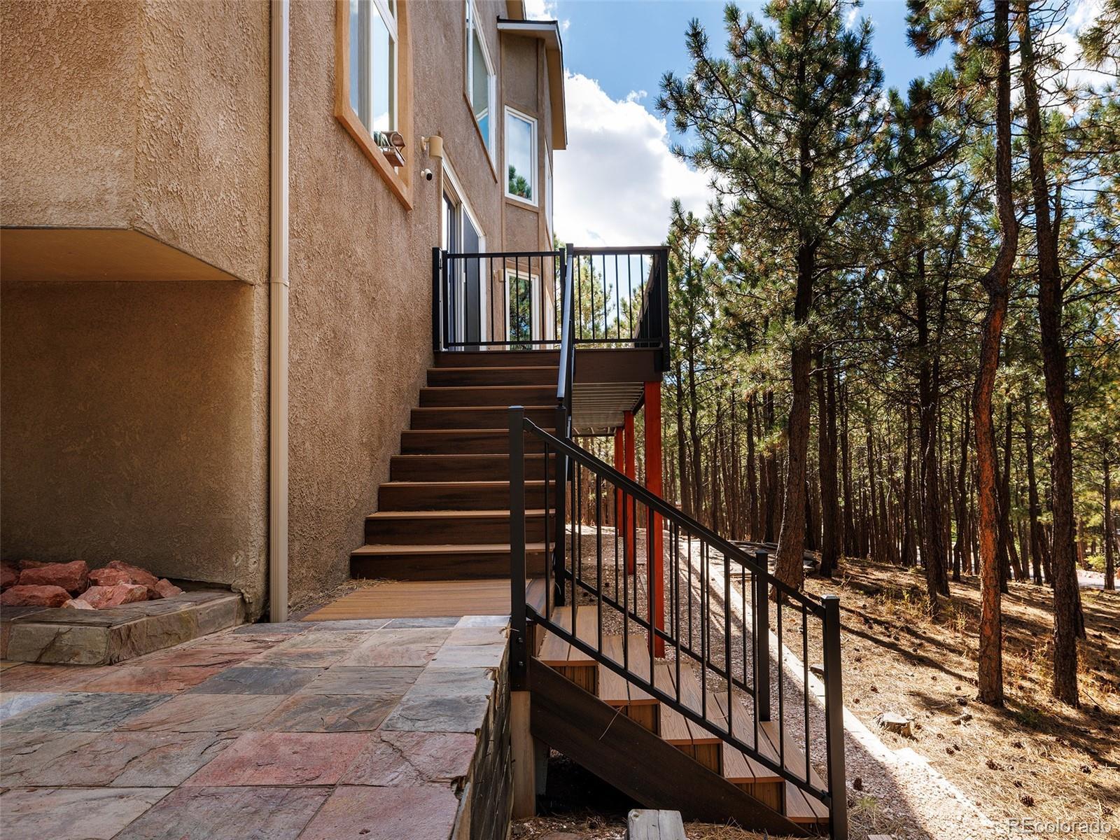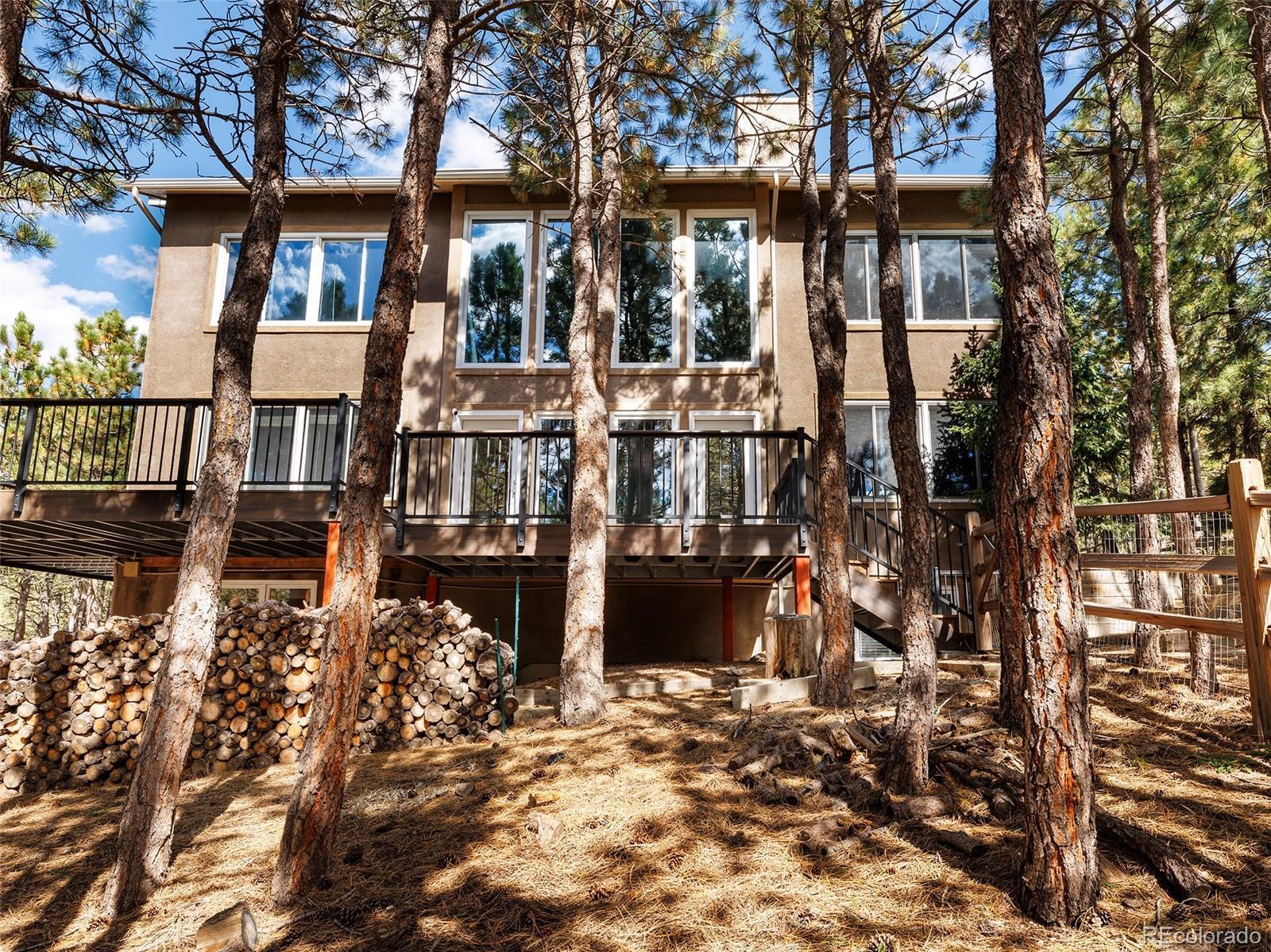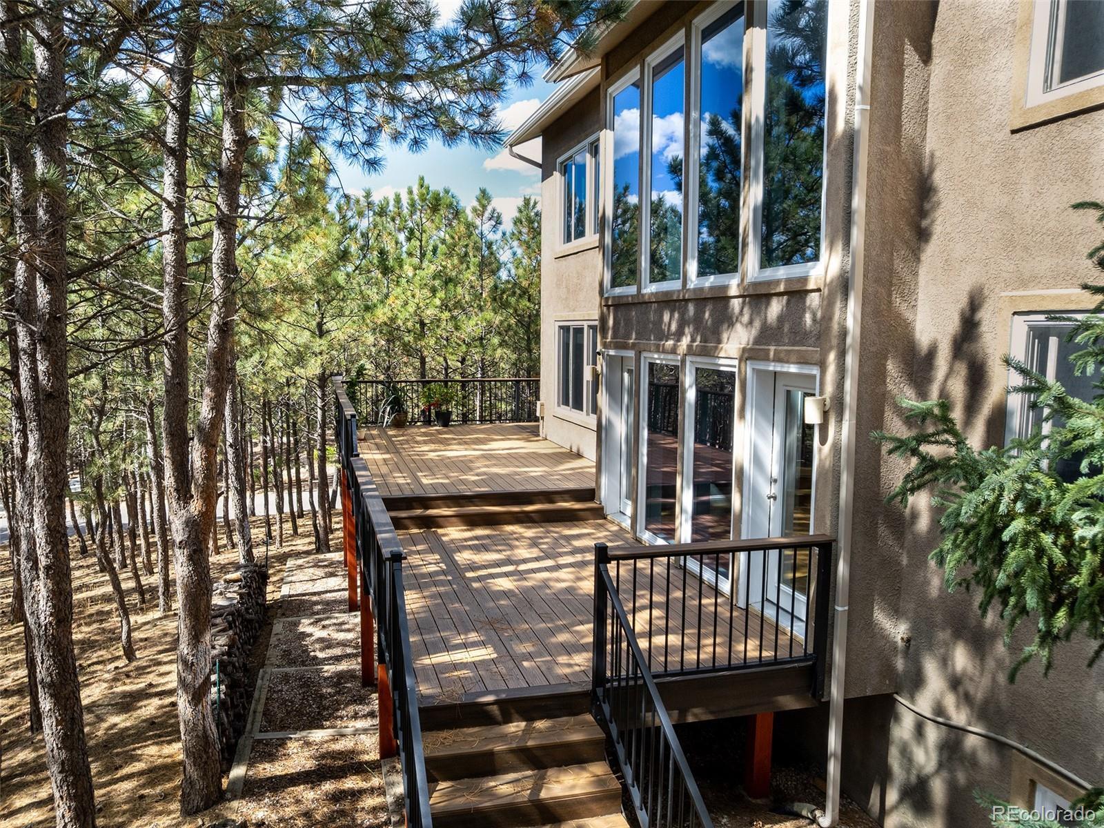 Tucked away in the towering pines of Woodmoor, this stunning 5-bedroom home offers privacy, mountain views and an ideal layout for everyday living and entertaining. Situated on nearly 2/3 of an acre with a brand-new composite wrap-around deck (installed in 2021) featuring Trex decking and all-aluminum framing, perfect for Colorado sunsets and entertaining guests. The roof, replaced just 5 years ago, is a Class 4 high-impact shingle with a 50-year transferable warranty, offering exceptional durability and peace of mind. Inside the main level features hardwood floors, a gourmet kitchen with custom cabinetry, granite countertops, KitchenAid appliances, a built-in refrigerator, and a large island with ample prep space for aspiring chefs. A cozy wood-burning fireplace anchors the family room, while a main-level bedroom with a custom Murphy bed offers flexible use as a guest room or office space. Upstairs, you will find four spacious bedrooms, all with walk-in closets, and a bright loft overlooking the two-story living room framed by a wall of windows and mature ponderosa pines. The primary suite is a true retreat with sweeping views, a 5-piece bath with jetted tub, and a generous walk-in closet. The walkout basement expands the living space with an additional bedroom and full bath, wet bar with live-edge walnut counter, game room, office and recreation space. Additional highlights include two fireplaces (wood and gas), new windows, built-ins throughout, a circular driveway, and a beautiful lot filled with mature ponderosa pines. This is Colorado living at its finest: peaceful, private, and just minutes from everything Monument has to offer.