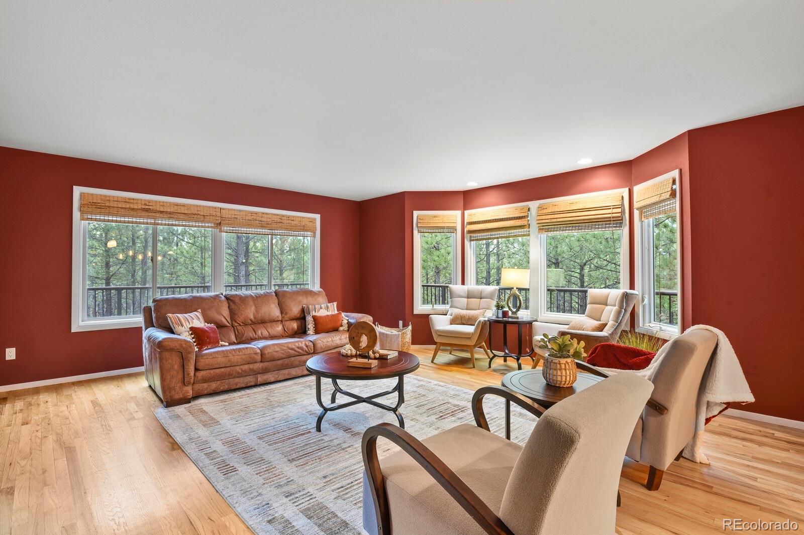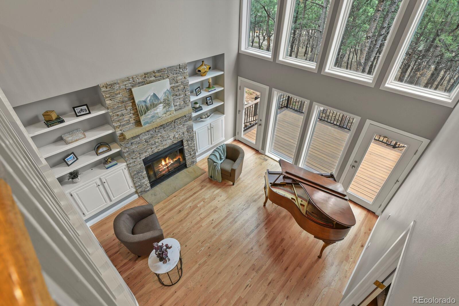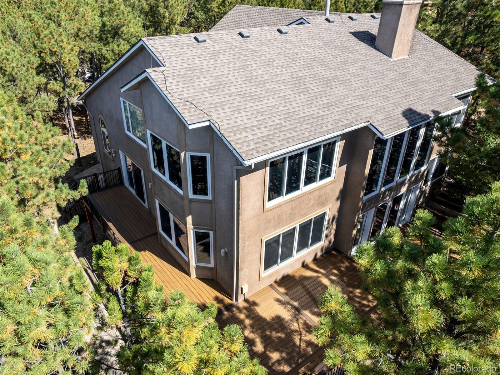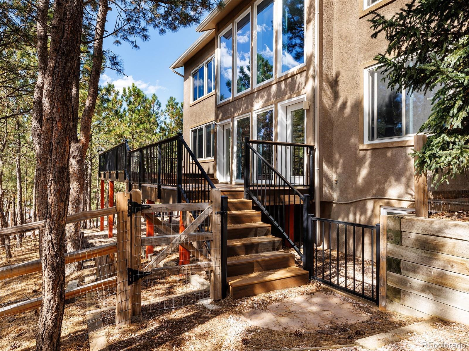 Tucked away in the towering pines of Woodmoor, this stunning 5-bedroom home offers privacy, mountain views and an ideal layout for everyday living and entertaining. Situated on nearly 2/3 of an acre with a brand-new composite wrap-around deck (installed in 2021) featuring Trex decking and all-aluminum framing, perfect for Colorado sunsets and entertaining guests. The roof, replaced just 5 years ago, is a Class 4 high-impact shingle with a 50-year transferable warranty, offering exceptional durability and peace of mind. Inside the main level features hardwood floors, a gourmet kitchen with custom cabinetry, granite countertops, KitchenAid appliances, a built-in refrigerator, and a large island with ample prep space for aspiring chefs. A cozy wood-burning fireplace anchors the family room, while a main-level bedroom with a custom Murphy bed offers flexible use as a guest room or office space. Upstairs, you will find four spacious bedrooms, all with walk-in closets, and a bright loft overlooking the two-story living room framed by a wall of windows and mature ponderosa pines. The primary suite is a true retreat with sweeping views, a 5-piece bath with jetted tub, and a generous walk-in closet. The walkout basement expands the living space with an additional bedroom and full bath, wet bar with live-edge walnut counter, game room, office and recreation space. Additional highlights include two fireplaces (wood and gas), new windows, built-ins throughout, a circular driveway, and a beautiful lot filled with mature ponderosa pines. This is Colorado living at its finest: peaceful, private, and just minutes from everything Monument has to offer.