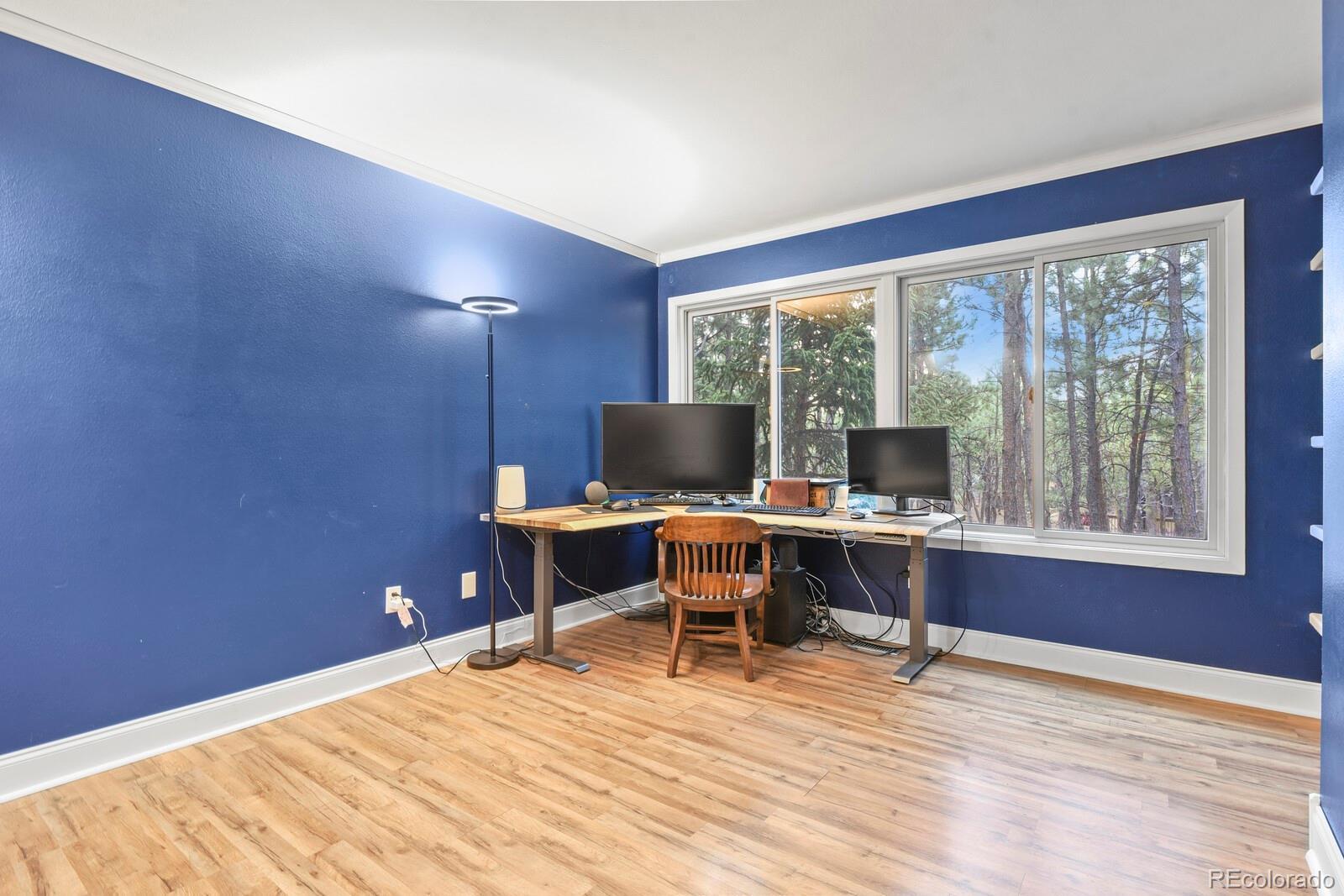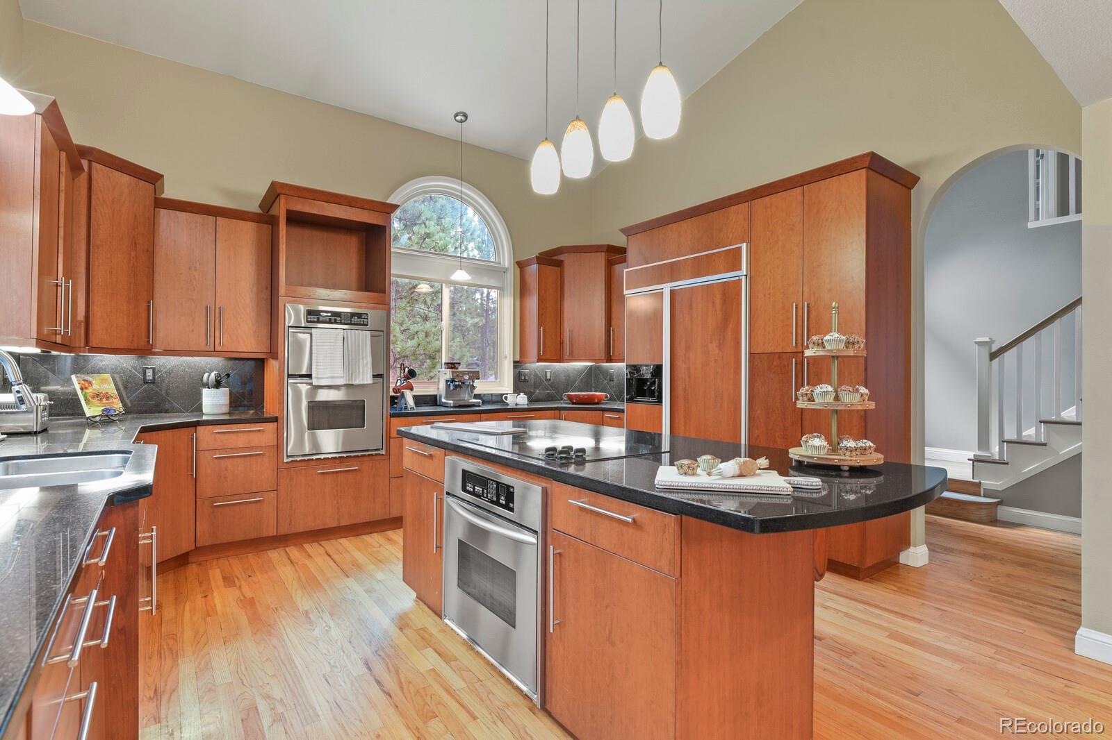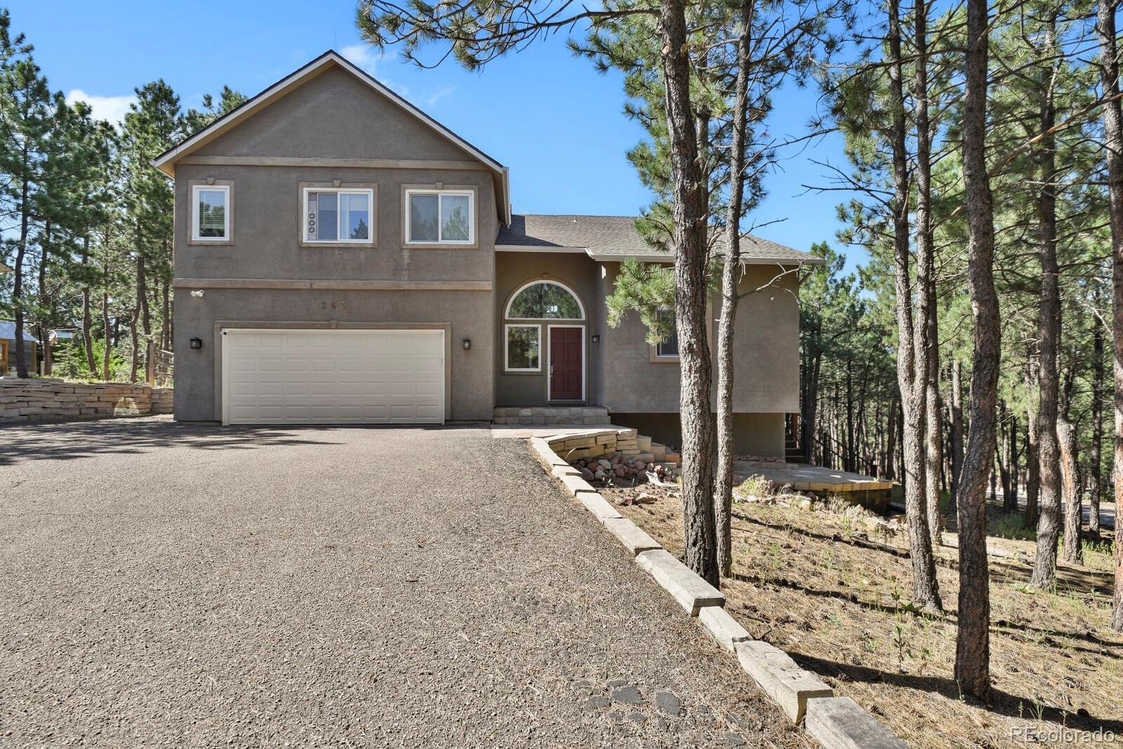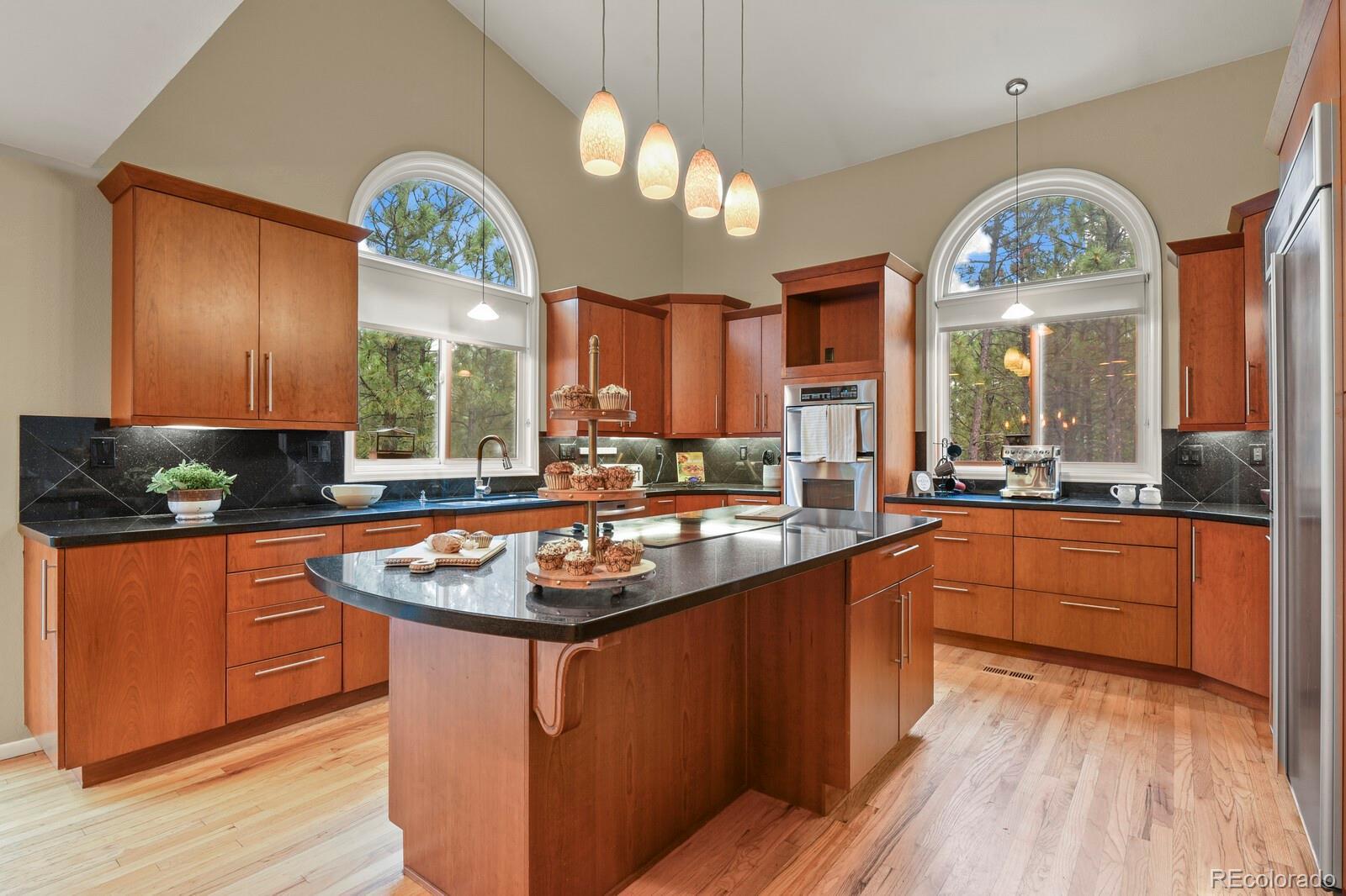 Tucked away in the towering pines of Woodmoor, this stunning 5-bedroom home offers privacy, mountain views and an ideal layout for everyday living and entertaining. Situated on nearly 2/3 of an acre with a brand-new composite wrap-around deck (installed in 2021) featuring Trex decking and all-aluminum framing, perfect for Colorado sunsets and entertaining guests. The roof, replaced just 5 years ago, is a Class 4 high-impact shingle with a 50-year transferable warranty, offering exceptional durability and peace of mind. Inside the main level features hardwood floors, a gourmet kitchen with custom cabinetry, granite countertops, KitchenAid appliances, a built-in refrigerator, and a large island with ample prep space for aspiring chefs. A cozy wood-burning fireplace anchors the family room, while a main-level bedroom with a custom Murphy bed offers flexible use as a guest room or office space. Upstairs, you will find four spacious bedrooms, all with walk-in closets, and a bright loft overlooking the two-story living room framed by a wall of windows and mature ponderosa pines. The primary suite is a true retreat with sweeping views, a 5-piece bath with jetted tub, and a generous walk-in closet. The walkout basement expands the living space with an additional bedroom and full bath, wet bar with live-edge walnut counter, game room, office and recreation space. Additional highlights include two fireplaces (wood and gas), new windows, built-ins throughout, a circular driveway, and a beautiful lot filled with mature ponderosa pines. This is Colorado living at its finest: peaceful, private, and just minutes from everything Monument has to offer.