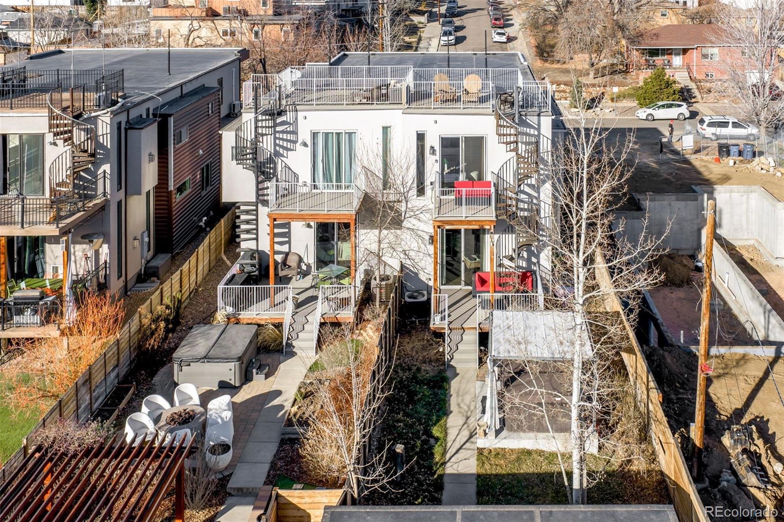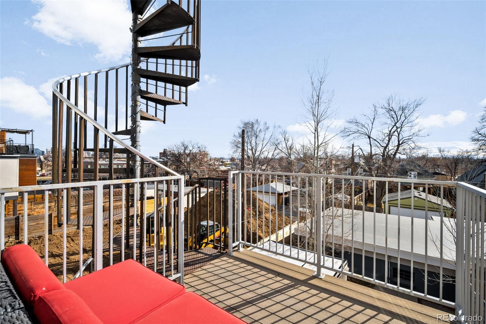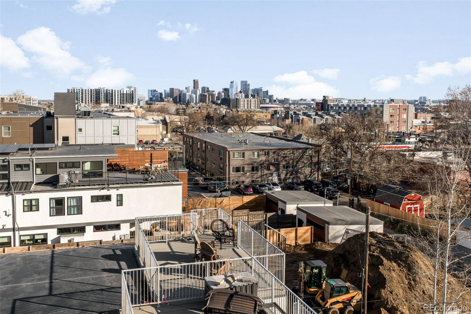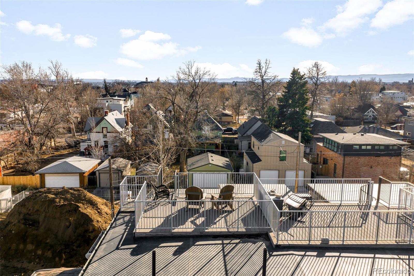 Stunning modern half-duplex ideally located in Sloan’s Lake, just steps away from all of the cafes restaurants and shopping in Highlands and Jefferson Park. From the moment you enter, you'll notice the soaring ceilings, hardwood floors, and an expansive, light-filled open floor plan. The main level features a convenient bedroom with en suite bath—perfect as a private retreat or a dedicated home office. The living area with high ceilings features a gas fireplace and flows seamlessly to the backyard through large sliding doors. A chef’s kitchen completes the space, outfitted with high-end stainless steel appliances, a gas range, and sleek finishes ideal for entertaining. The second level features a luxurious primary suite with its own fireplace, a spa-like bathroom with granite countertops, soaking tub, and glass-enclosed shower, plus a massive walk-in closet with a custom shelving. The second level also has 2 other generous bedrooms, laundry room and a full bathroom. Above, a rooftop deck delivers breathtaking mountain and city views. The finished basement with high ceilings adds exceptional versatility, a wet bar ideal for movie nights, and a large fifth bedroom with walk-in closet and full bathroom. Additional highlights include an oversized two-car garage, fenced backyard landscaped areas, brick patio, and deck. Just steps from grocery stores, coffee shops, and neighborhood restaurants, this home combines modern luxury, thoughtful design, and unbeatable walkability in one exceptional package.