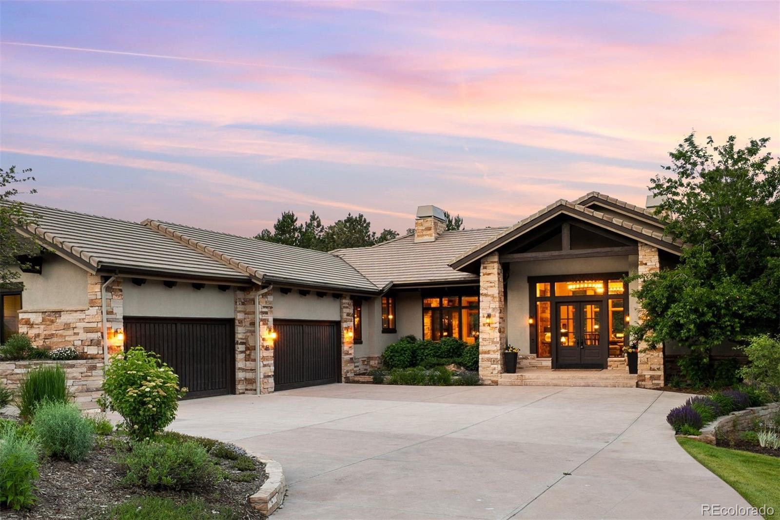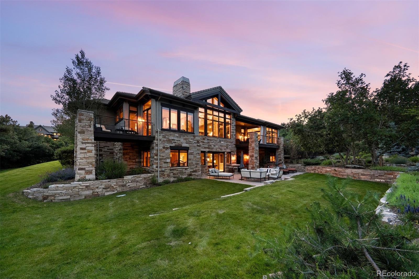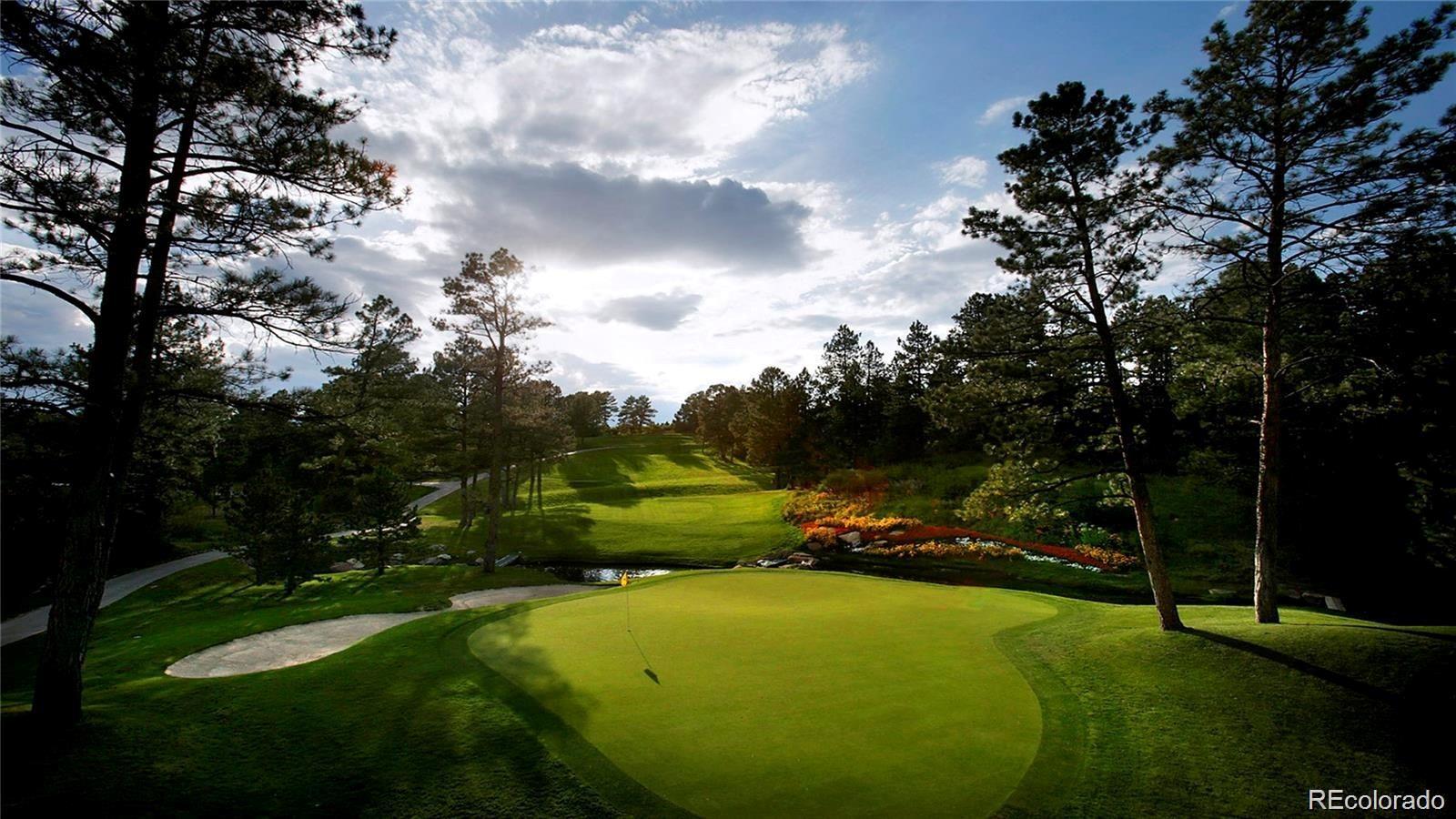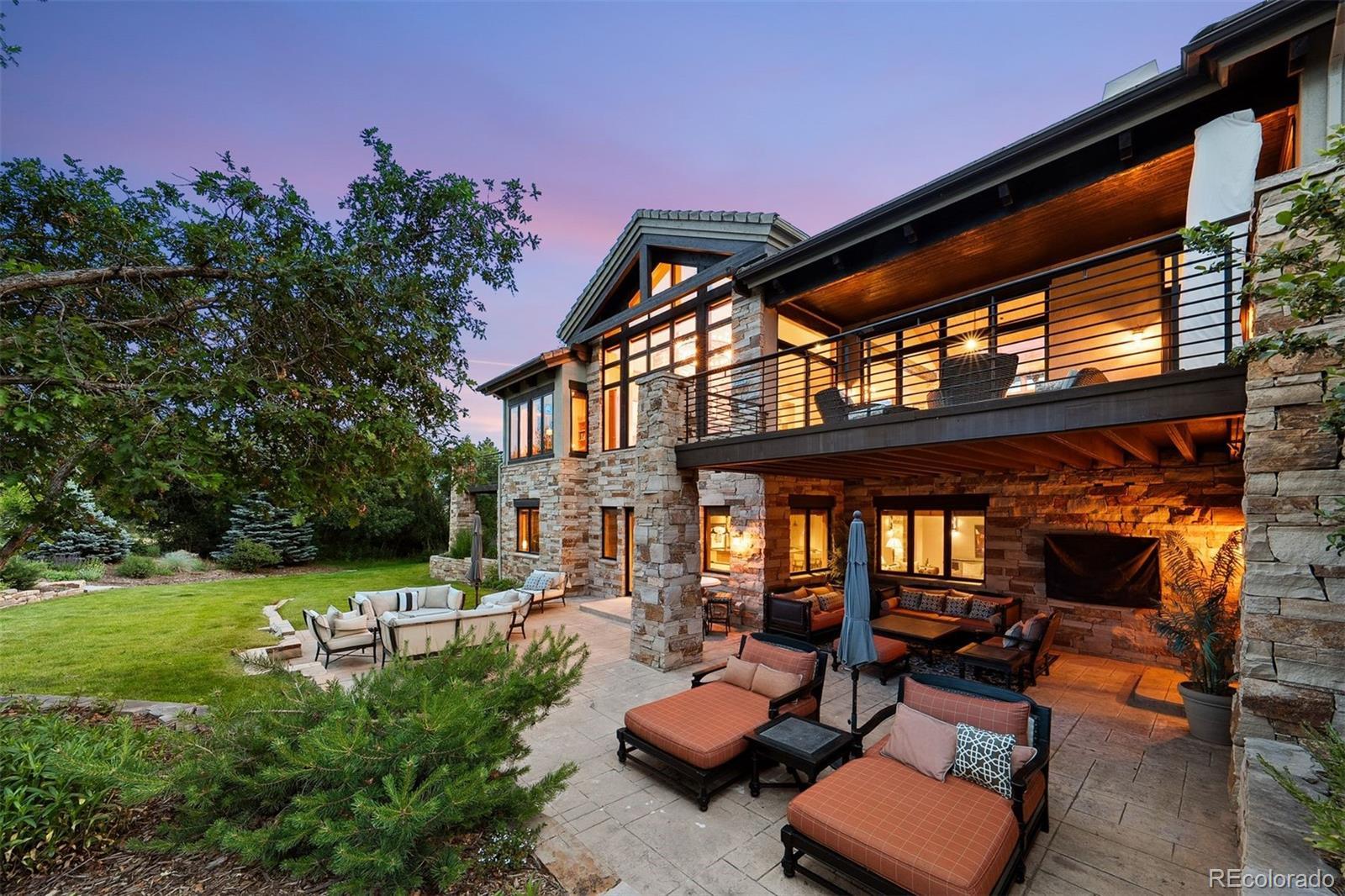 Situated on the 7th green of the private Castle Pines Golf Club, home of the 2024 BMW Championship, this exceptional 5 bedroom | 7 bathroom residence in the Village at Castle Pines features timeless craftsmanship and showcases gorgeous stacked stone accents throughout. Located on a premier lot, exterior highlights include rare course views, a lushly manicured lawn, and a soothing waterfall - an ideal backdrop for endless entertaining from the expansive upper level deck, complete with built-in outdoor kitchen, and lower level patio. On entry, a dramatic great room greets you with vaulted ceilings, stacked stone fireplace, and a window wall framing the expansive greenery outside. The gourmet kitchen, with custom stonework, tile floors, and premium cabinets includes a hearth room with a gas fireplace, and a breakfast nook highlighted by a crystal chandelier and wood-paneled ceiling. The huge primary suite is a true retreat and connects to a bright study with private deck access and remodeled spa-like bath with an oversized steam shower, freestanding soaking tub, and dual marble-topped vanities. A chic powder room, renovated laundry room, and an updated 2nd office nook, located adjacent to the 4-car garage, complete the main level. The lower level extends your entertainment flow with an open media|family room, a spacious game area, walk-out patio access, and a well-appointed wet bar featuring sleek black stone countertops, beverage fridge, dishwasher, and pendant lighting. Four en suite lower-level bedrooms add ample opportunities to host family and guests alike: one with a gas fireplace and outdoor patio access; another currently used as a fitness room; a third with large windows and plush carpet; and a fourth with a tray ceiling and views of the verdant back yard. A stylish powder room and storage room finish the space. Perfectly placed for those who love timeless luxury, this home offers an exceptional opportunity to enjoy a relaxed yet refined Colorado lifestyle.