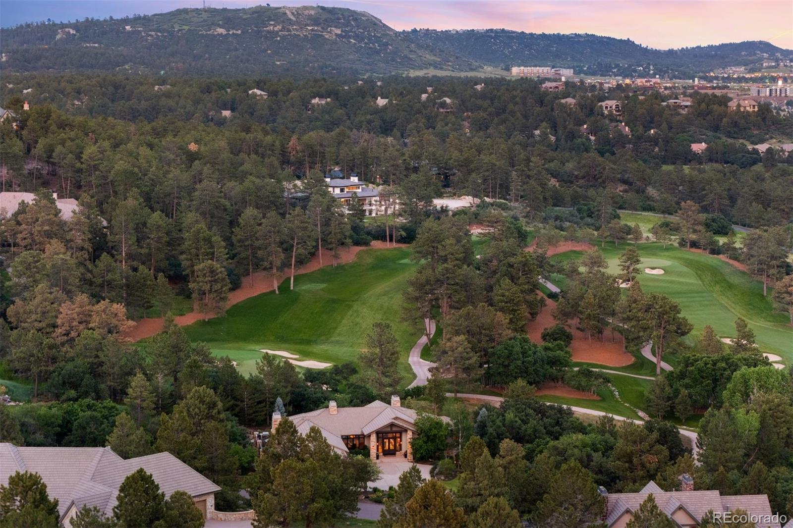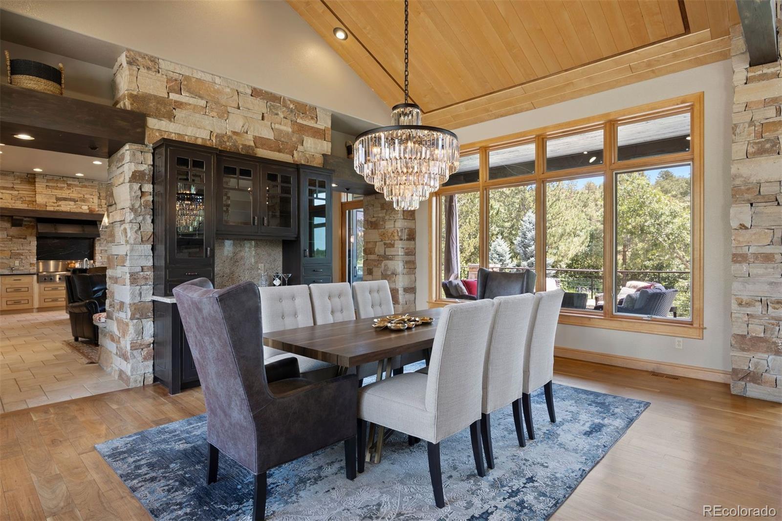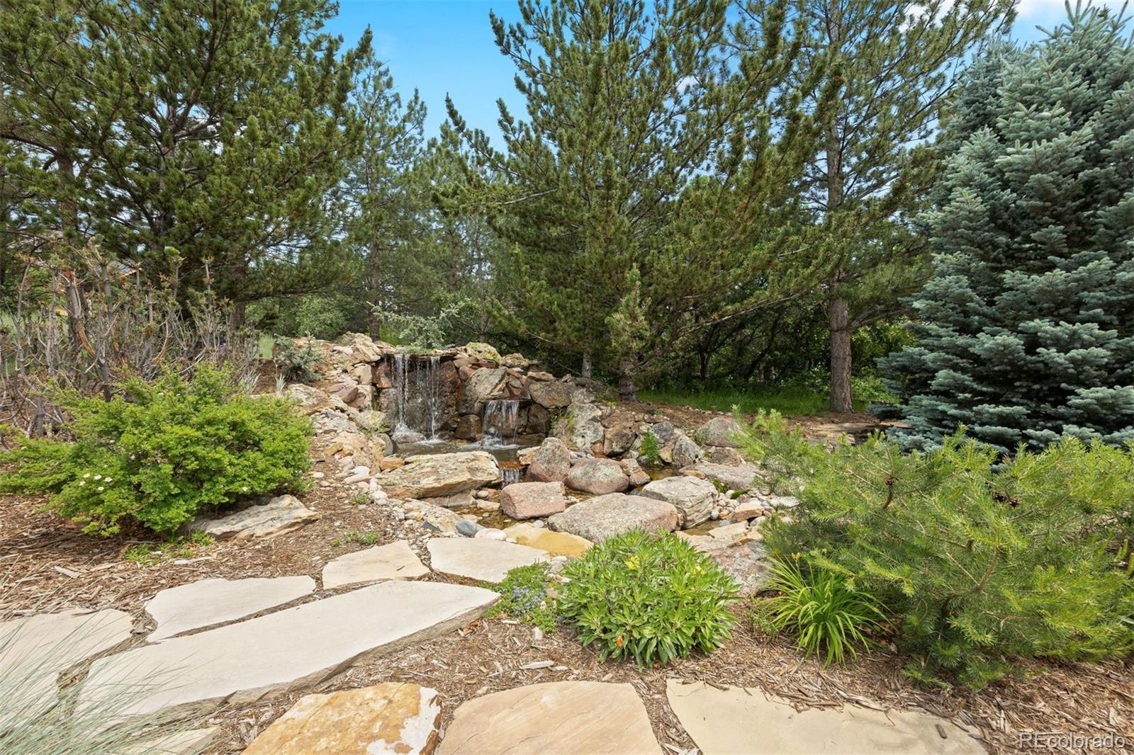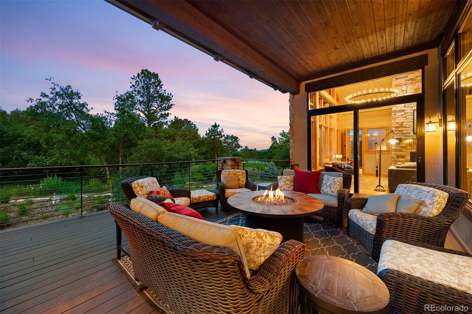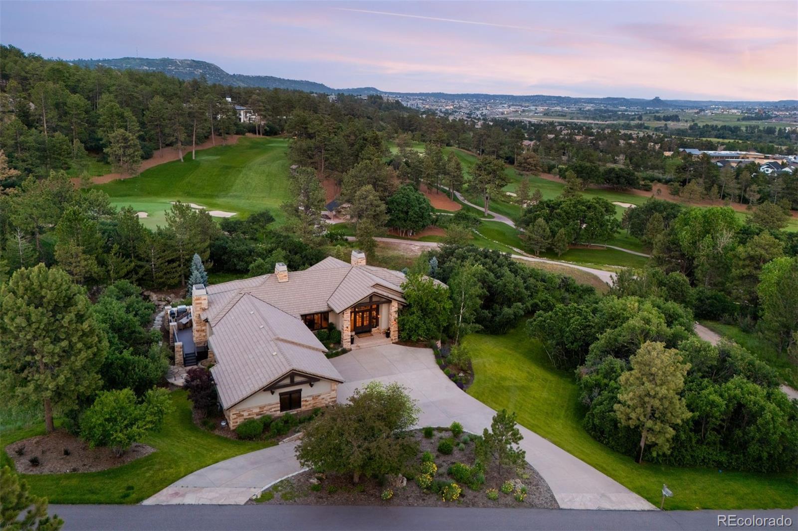 Situated on the 7th green of the private Castle Pines Golf Club, home of the 2024 BMW Championship, this exceptional 5 bedroom | 7 bathroom residence in the Village at Castle Pines features timeless craftsmanship and showcases gorgeous stacked stone accents throughout. Located on a premier lot, exterior highlights include rare course views, a lushly manicured lawn, and a soothing waterfall - an ideal backdrop for endless entertaining from the expansive upper level deck, complete with built-in outdoor kitchen, and lower level patio. On entry, a dramatic great room greets you with vaulted ceilings, stacked stone fireplace, and a window wall framing the expansive greenery outside. The gourmet kitchen, with custom stonework, tile floors, and premium cabinets includes a hearth room with a gas fireplace, and a breakfast nook highlighted by a crystal chandelier and wood-paneled ceiling. The huge primary suite is a true retreat and connects to a bright study with private deck access and remodeled spa-like bath with an oversized steam shower, freestanding soaking tub, and dual marble-topped vanities. A chic powder room, renovated laundry room, and an updated 2nd office nook, located adjacent to the 4-car garage, complete the main level. The lower level extends your entertainment flow with an open media|family room, a spacious game area, walk-out patio access, and a well-appointed wet bar featuring sleek black stone countertops, beverage fridge, dishwasher, and pendant lighting. Four en suite lower-level bedrooms add ample opportunities to host family and guests alike: one with a gas fireplace and outdoor patio access; another currently used as a fitness room; a third with large windows and plush carpet; and a fourth with a tray ceiling and views of the verdant back yard. A stylish powder room and storage room finish the space. Perfectly placed for those who love timeless luxury, this home offers an exceptional opportunity to enjoy a relaxed yet refined Colorado lifestyle.