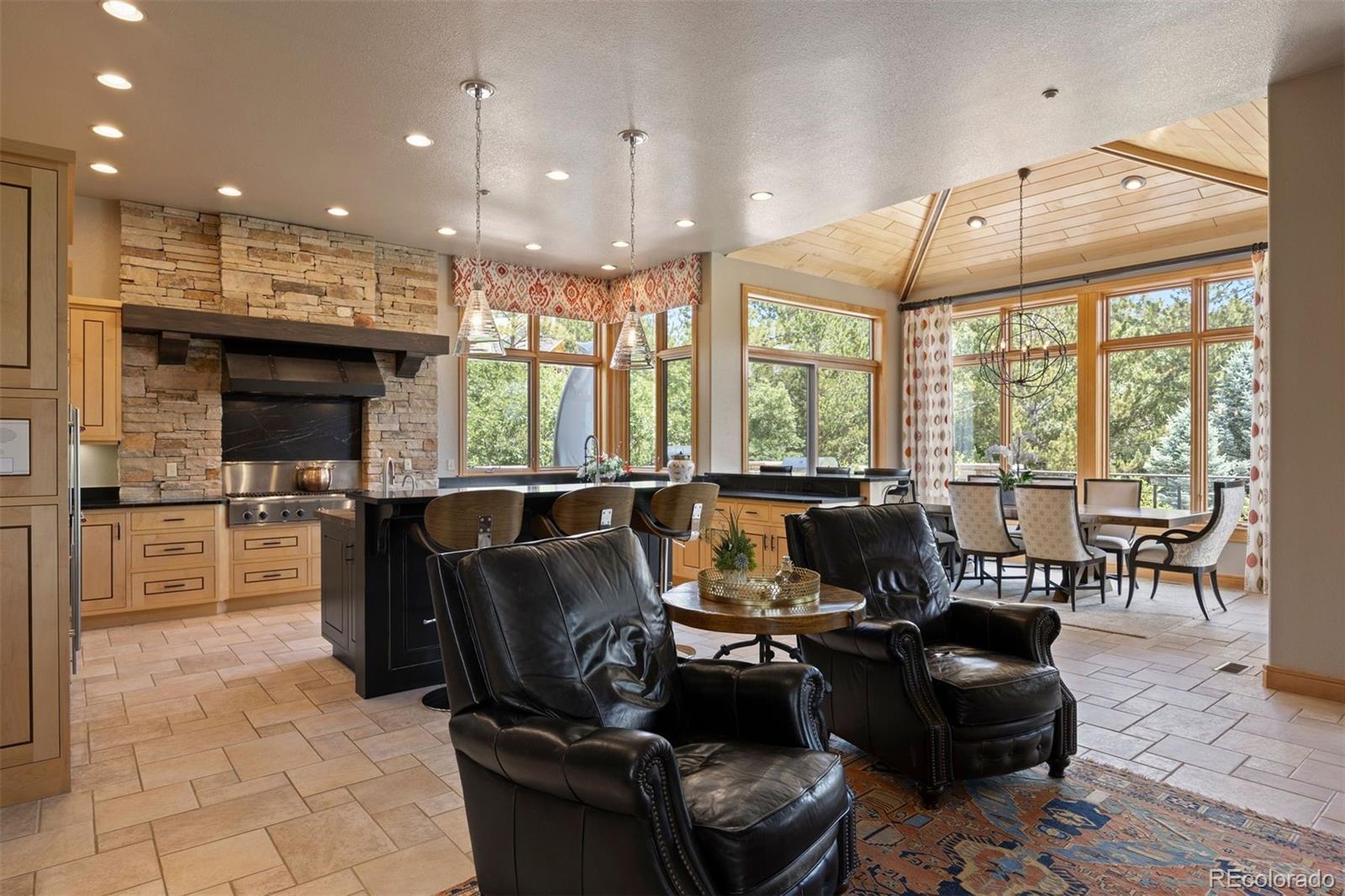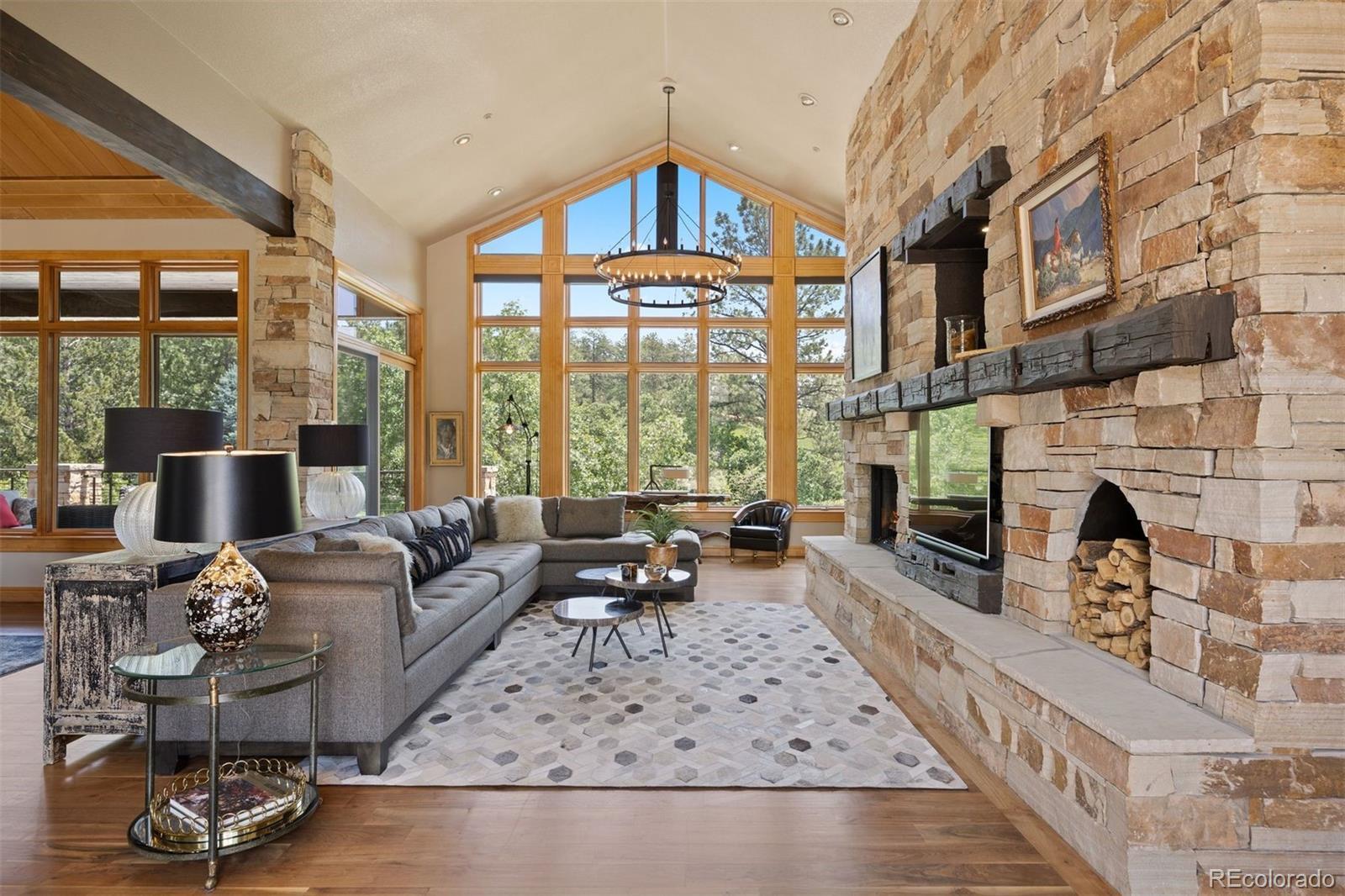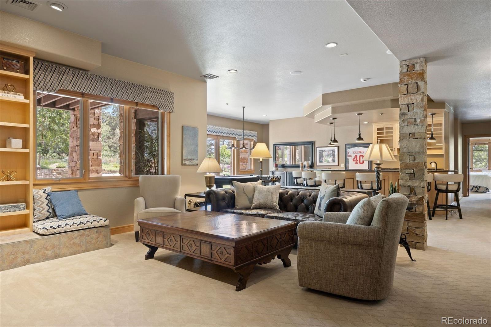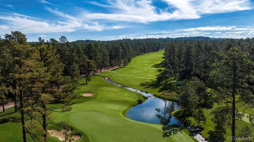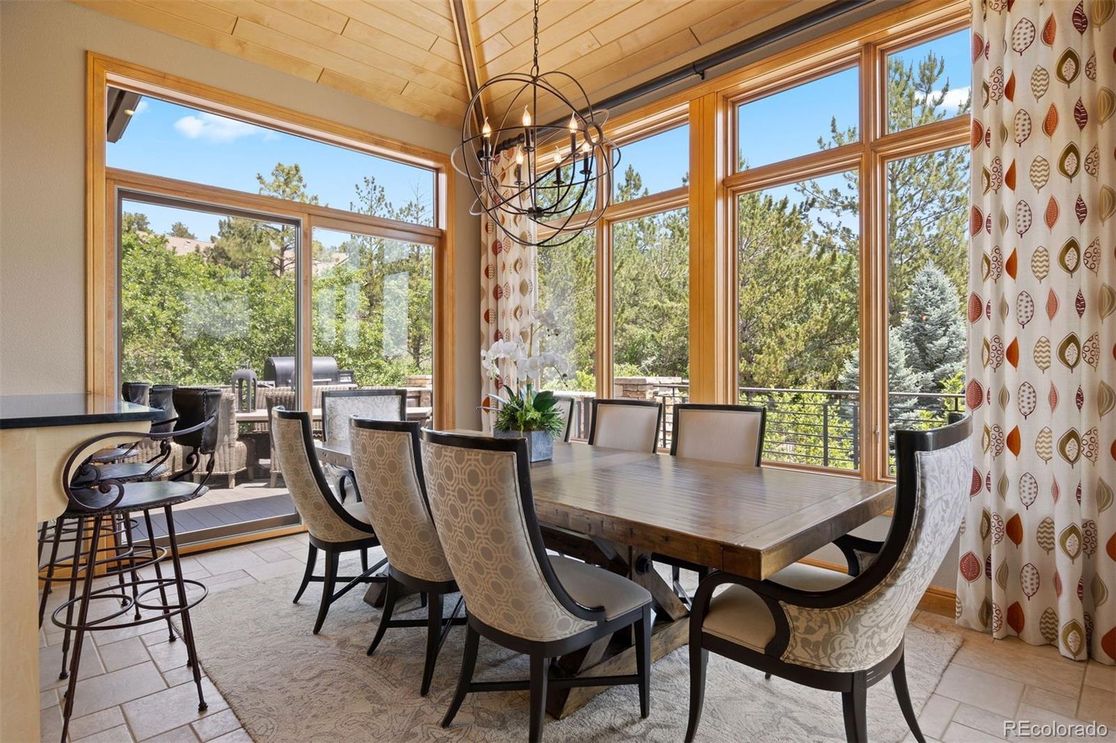Situated on the 7th green of the private Castle Pines Golf Club, home of the 2024 BMW Championship, this exceptional 5 bedroom | 7 bathroom residence in the Village at Castle Pines features timeless craftsmanship and showcases gorgeous stacked stone accents throughout. Located on a premier lot, exterior highlights include rare course views, a lushly manicured lawn, and a soothing waterfall - an ideal backdrop for endless entertaining from the expansive upper level deck, complete with built-in outdoor kitchen, and lower level patio. On entry, a dramatic great room greets you with vaulted ceilings, stacked stone fireplace, and a window wall framing the expansive greenery outside. The gourmet kitchen, with custom stonework, tile floors, and premium cabinets includes a hearth room with a gas fireplace, and a breakfast nook highlighted by a crystal chandelier and wood-paneled ceiling. The huge primary suite is a true retreat and connects to a bright study with private deck access and remodeled spa-like bath with an oversized steam shower, freestanding soaking tub, and dual marble-topped vanities. A chic powder room, renovated laundry room, and an updated 2nd office nook, located adjacent to the 4-car garage, complete the main level. The lower level extends your entertainment flow with an open media|family room, a spacious game area, walk-out patio access, and a well-appointed wet bar featuring sleek black stone countertops, beverage fridge, dishwasher, and pendant lighting. Four en suite lower-level bedrooms add ample opportunities to host family and guests alike: one with a gas fireplace and outdoor patio access; another currently used as a fitness room; a third with large windows and plush carpet; and a fourth with a tray ceiling and views of the verdant back yard. A stylish powder room and storage room finish the space. Perfectly placed for those who love timeless luxury, this home offers an exceptional opportunity to enjoy a relaxed yet refined Colorado lifestyle.