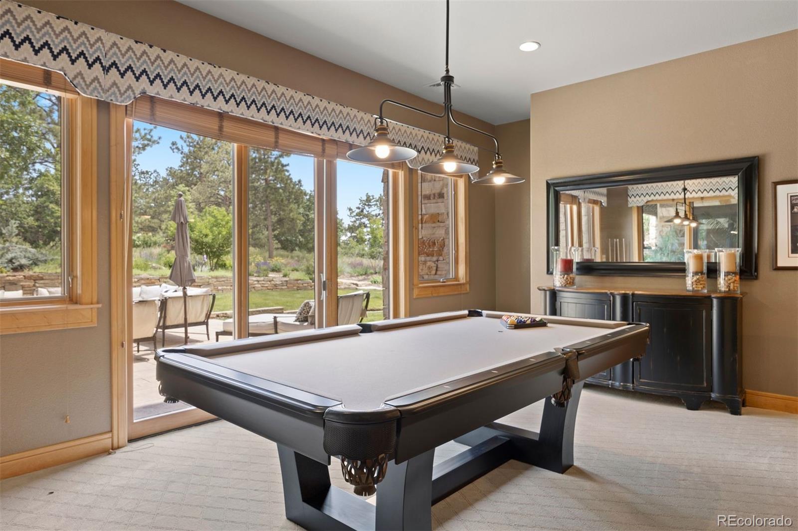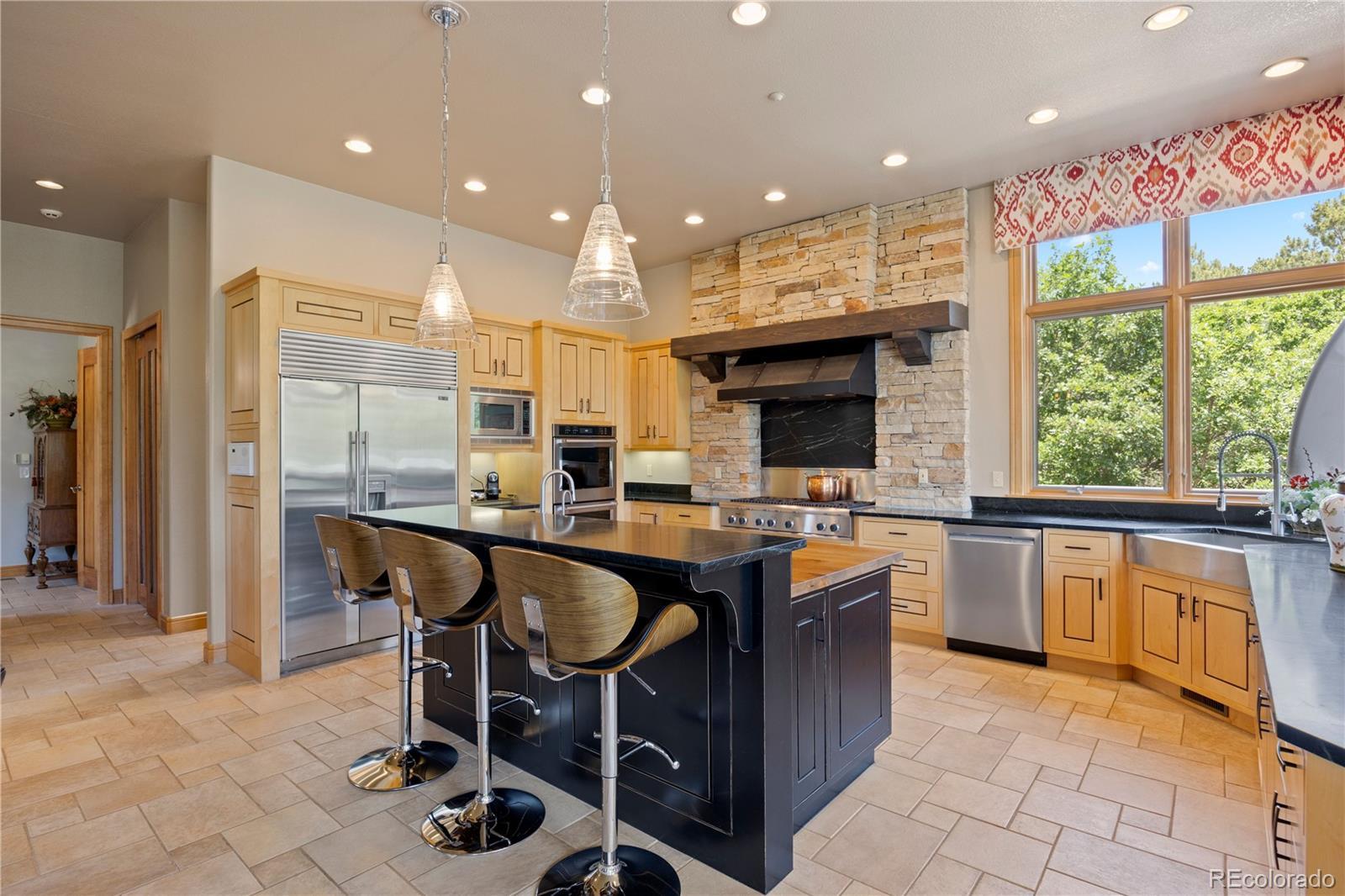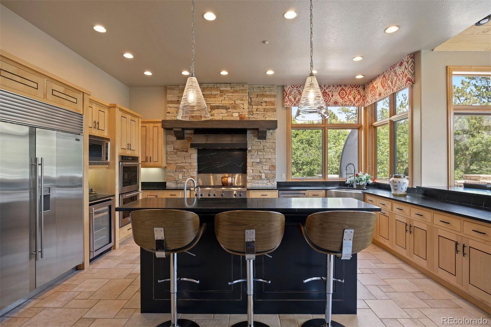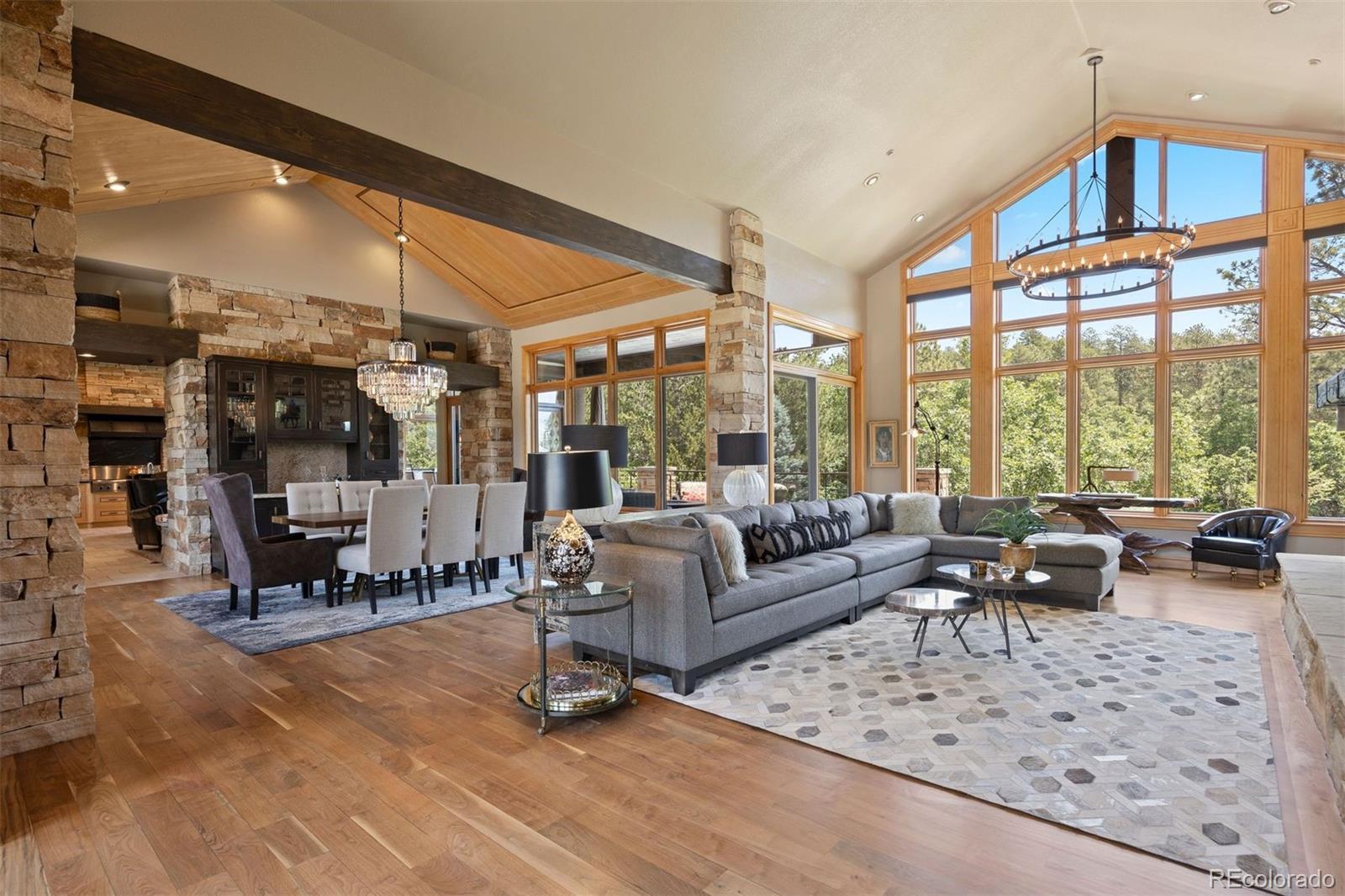Situated on the 7th green of the private Castle Pines Golf Club, home of the 2024 BMW Championship, this exceptional 5 bedroom | 7 bathroom residence in the Village at Castle Pines features timeless craftsmanship and showcases gorgeous stacked stone accents throughout. Located on a premier lot, exterior highlights include rare course views, a lushly manicured lawn, and a soothing waterfall - an ideal backdrop for endless entertaining from the expansive upper level deck, complete with built-in outdoor kitchen, and lower level patio. On entry, a dramatic great room greets you with vaulted ceilings, stacked stone fireplace, and a window wall framing the expansive greenery outside. The gourmet kitchen, with custom stonework, tile floors, and premium cabinets includes a hearth room with a gas fireplace, and a breakfast nook highlighted by a crystal chandelier and wood-paneled ceiling. The huge primary suite is a true retreat and connects to a bright study with private deck access and remodeled spa-like bath with an oversized steam shower, freestanding soaking tub, and dual marble-topped vanities. A chic powder room, renovated laundry room, and an updated 2nd office nook, located adjacent to the 4-car garage, complete the main level. The lower level extends your entertainment flow with an open media|family room, a spacious game area, walk-out patio access, and a well-appointed wet bar featuring sleek black stone countertops, beverage fridge, dishwasher, and pendant lighting. Four en suite lower-level bedrooms add ample opportunities to host family and guests alike: one with a gas fireplace and outdoor patio access; another currently used as a fitness room; a third with large windows and plush carpet; and a fourth with a tray ceiling and views of the verdant back yard. A stylish powder room and storage room finish the space. Perfectly placed for those who love timeless luxury, this home offers an exceptional opportunity to enjoy a relaxed yet refined Colorado lifestyle.