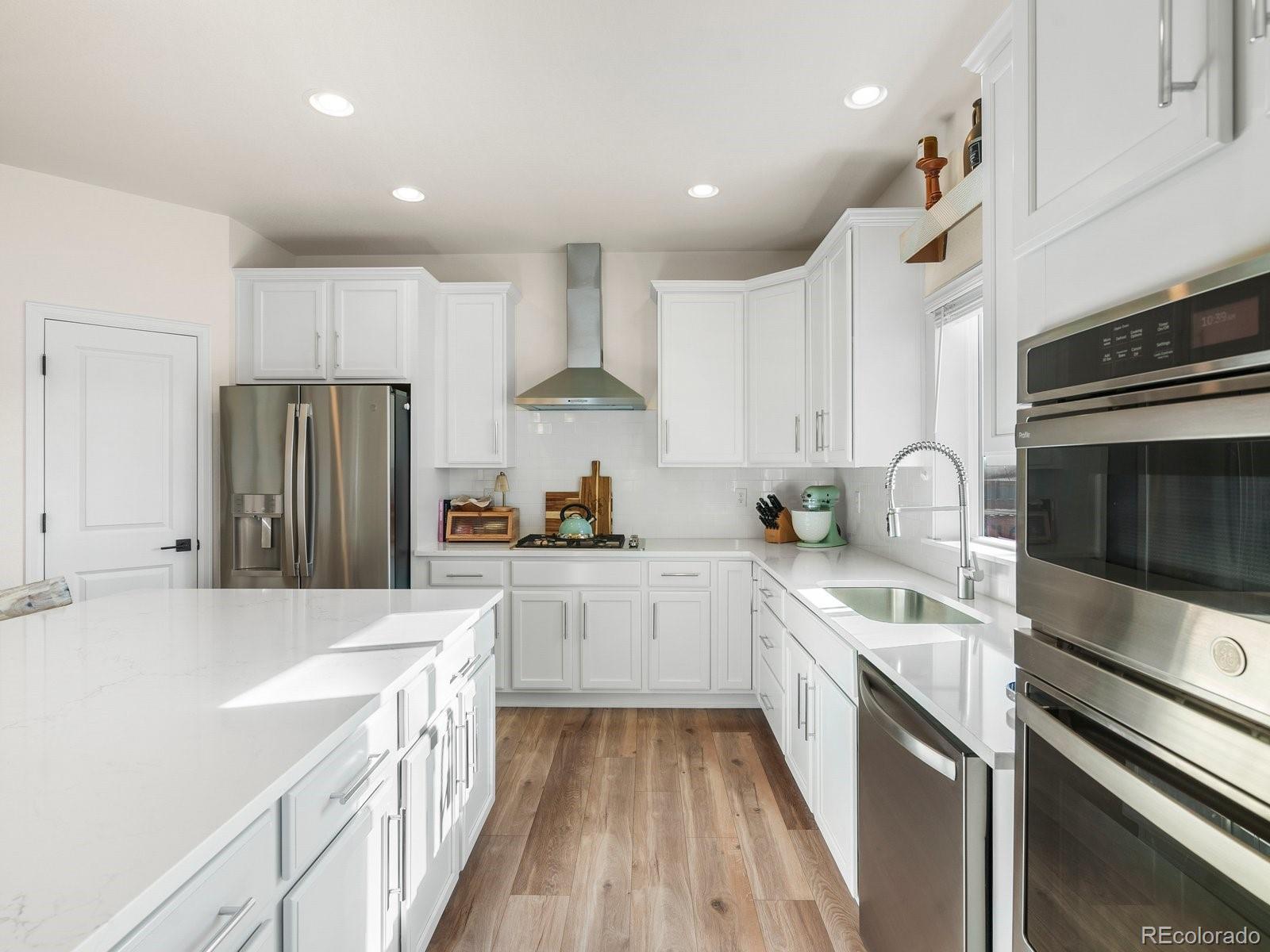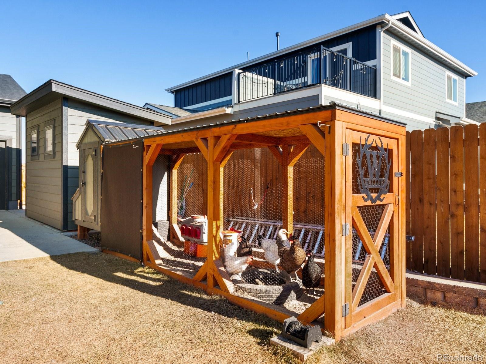 This stunning 5-year-old residence offers the rare combination of modern luxury, thoughtful design, and pristine condition—truly feeling brand new from the moment you arrive. Just off the entry, a versatile den provides the perfect space for a private office, library, or play space for the kids. The heart of the home is the open-concept gourmet kitchen, beautifully appointed with double ovens, granite countertops, and an expansive island ideal for both entertaining and everyday living. The sellers have enhanced the home with shiplap accents at the fireplace and in the main-level half bath, complemented by gorgeous custom shelving throughout for both style and function. The upper level features a luxurious primary retreat showcasing upgraded shiplap walls and ceiling, along with an upgraded ceiling fan. Three additional spacious bedrooms complete the upper level, offering exceptional flexibility for family and guests. Backing to serene open space, the home extends outdoors to an oversized covered patio and a professionally landscaped backyard oasis featuring four large metal garden beds, a sleek west-side dog run, and a private east-side chicken run and a new shed—designed for both lifestyle and leisure. Completing this exceptional property is the oversized 3-car attached garage, fully finished, drywalled, and insulated with 220 power and a full basement that has rough-in's, ready for your creative touch. With the Charter school across the street offering free admissions to residents and the community water park and pool, this would be a great family home! Get it before it's gone!