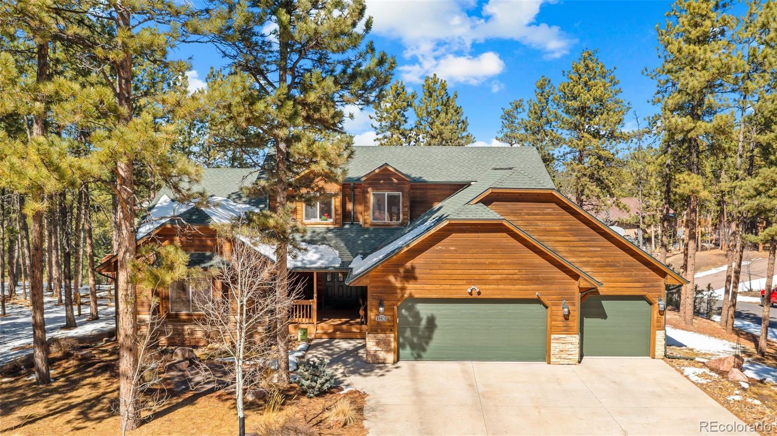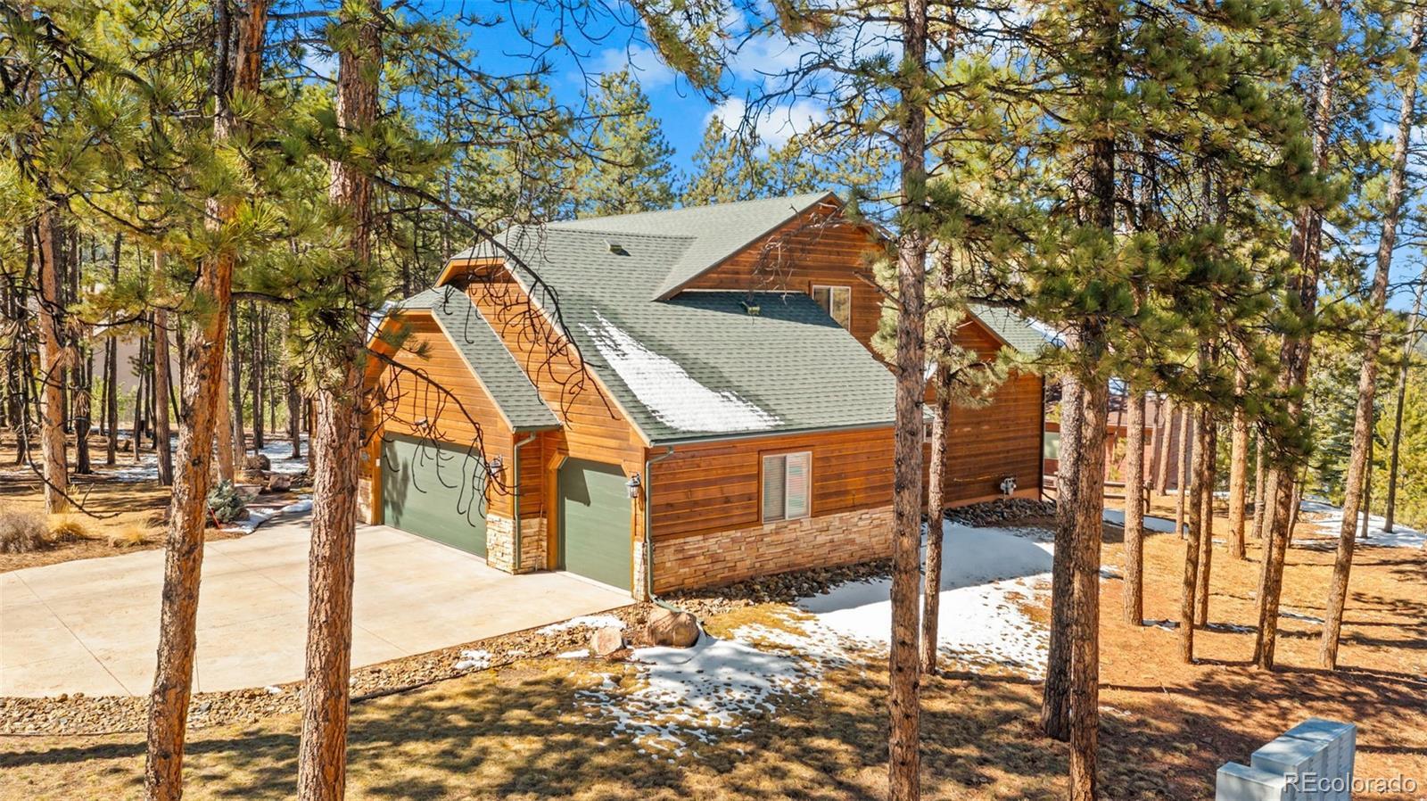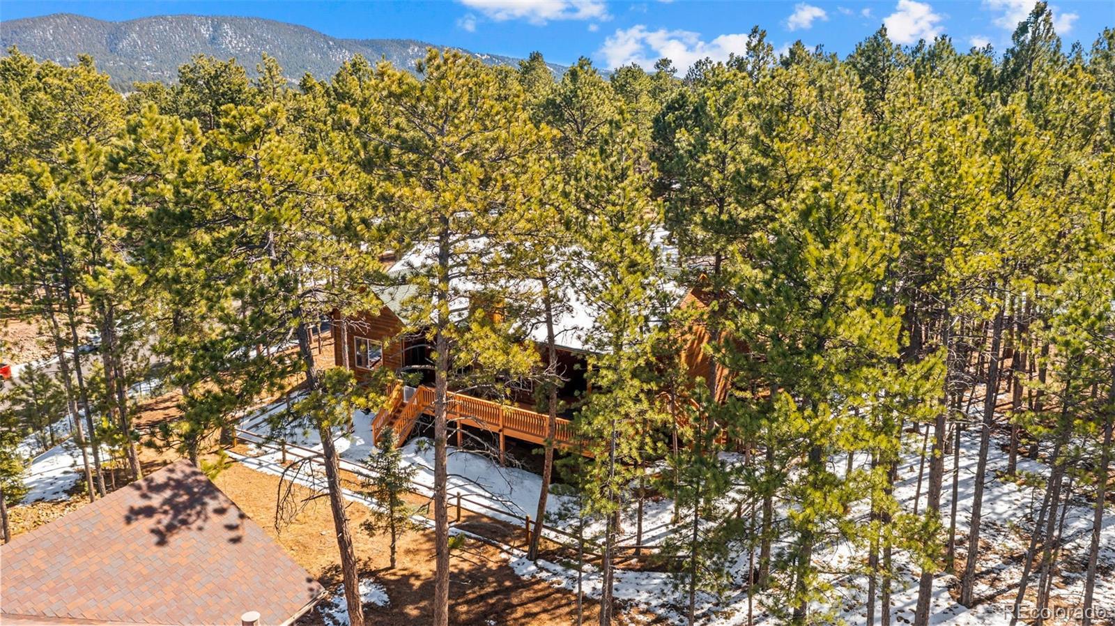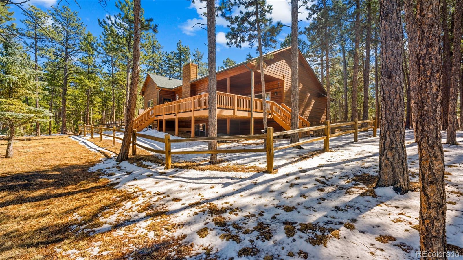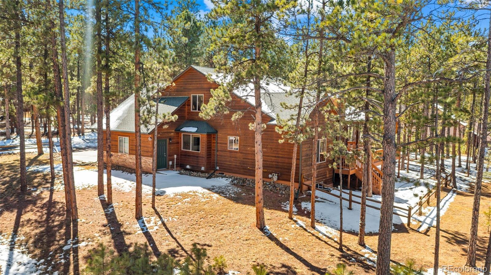 Tucked away on a quiet, wooded corner lot in desirable Woodland Park, this inviting mountain home offers the perfect blend of comfort, space, and Colorado lifestyle. Surrounded by mature pines and set in a peaceful residential neighborhood, the property provides privacy while still offering convenient access to shopping, restaurants, and everyday amenities. A spacious wraparound deck creates the ideal outdoor retreat—perfect for morning coffee, evening cookouts, or simply taking in spectacular Colorado sunsets. The home’s covered front porch welcomes guests and adds to the relaxed mountain charm. Inside, the main level living area is warm and inviting, featuring genuine hardwood floors, abundant natural light, and a cozy gas fireplace that creates a comfortable gathering space year-round. The thoughtfully designed layout includes both a breakfast area and a separate dining room, providing flexible options for everyday living and entertaining. The recently updated kitchen showcases solid granite countertops, newer appliances, and enhanced storage, making it both functional and stylish. The main level primary suite offers a peaceful retreat with private walkout access to the wraparound deck, a beautifully remodeled ensuite bathroom with walk-in shower, and spacious his-and-hers walk-in closets. The finished lower level expands the home’s living space with plenty of room for family entertainment, exercise, hobbies, or hosting guests. A versatile flex room offers additional possibilities for a home office, craft space, or media room. Additional highlights include a finished three-car garage, level driveway, fenced backyard, and a bonus lot that adds extra space and value. Located just minutes from Shining Mountain Golf Course and surrounded by endless Colorado recreation opportunities—from hiking and fishing to skiing and mountain biking—this property captures the best of Woodland Park mountain living.