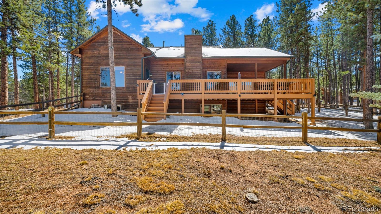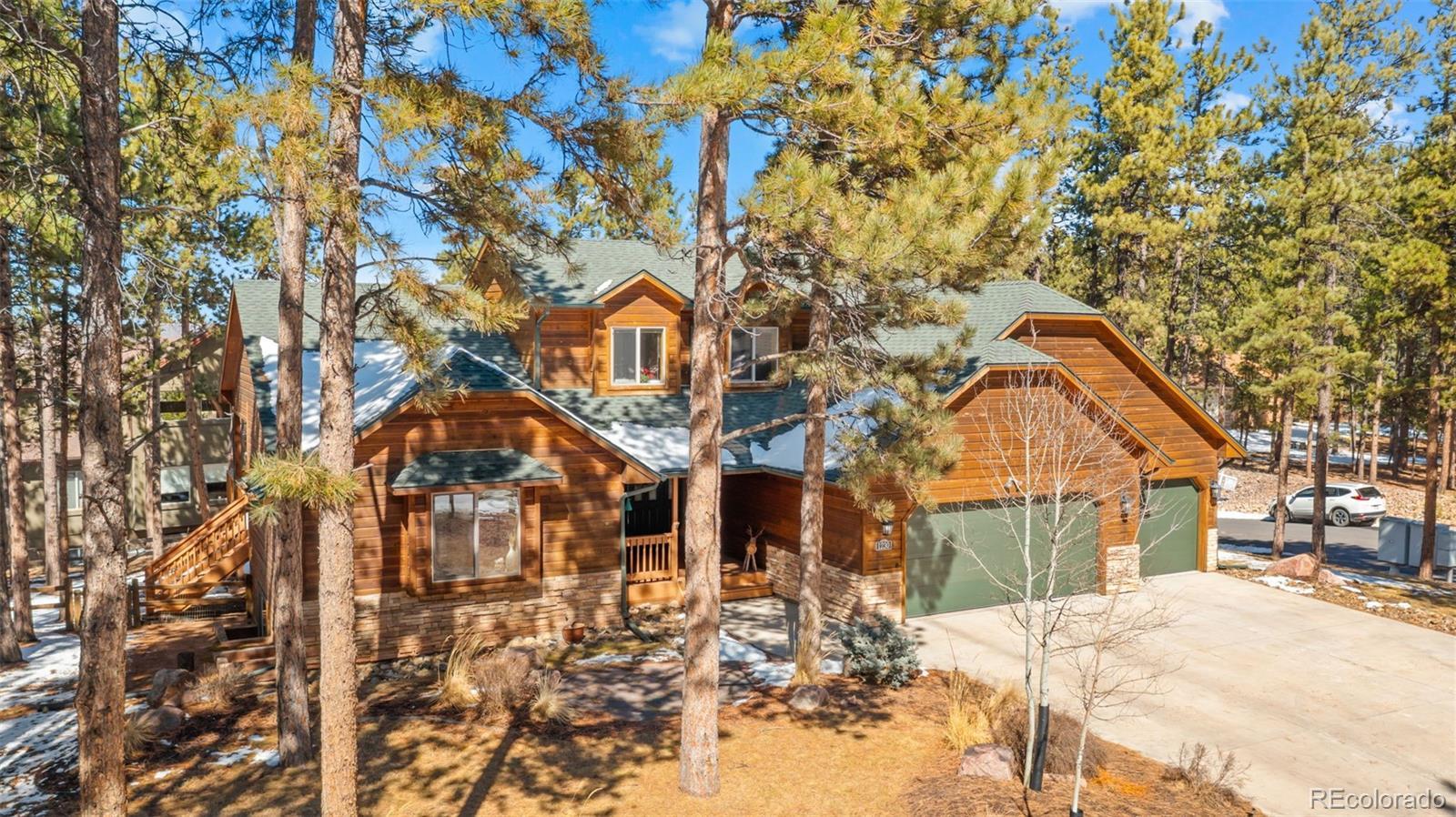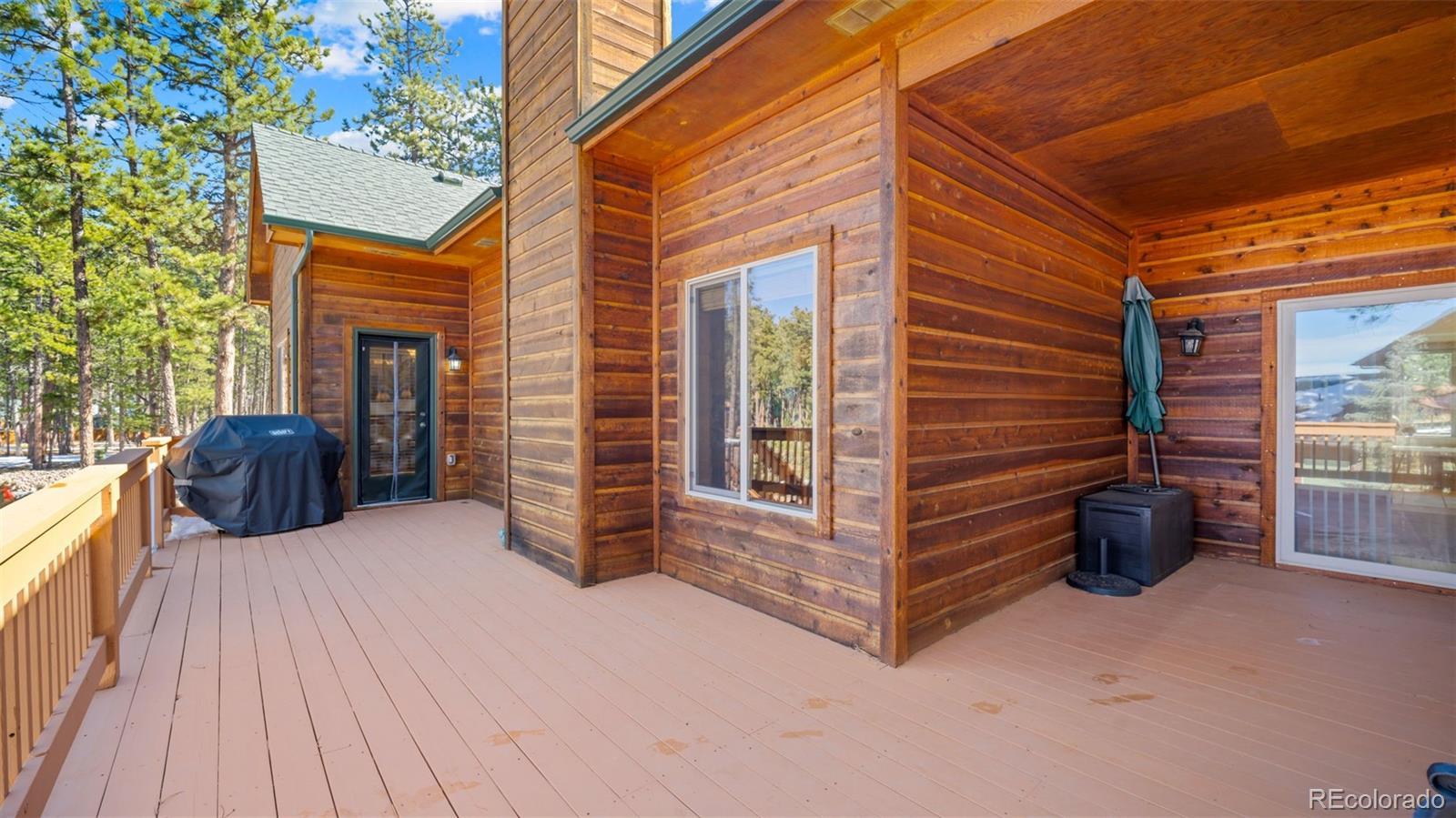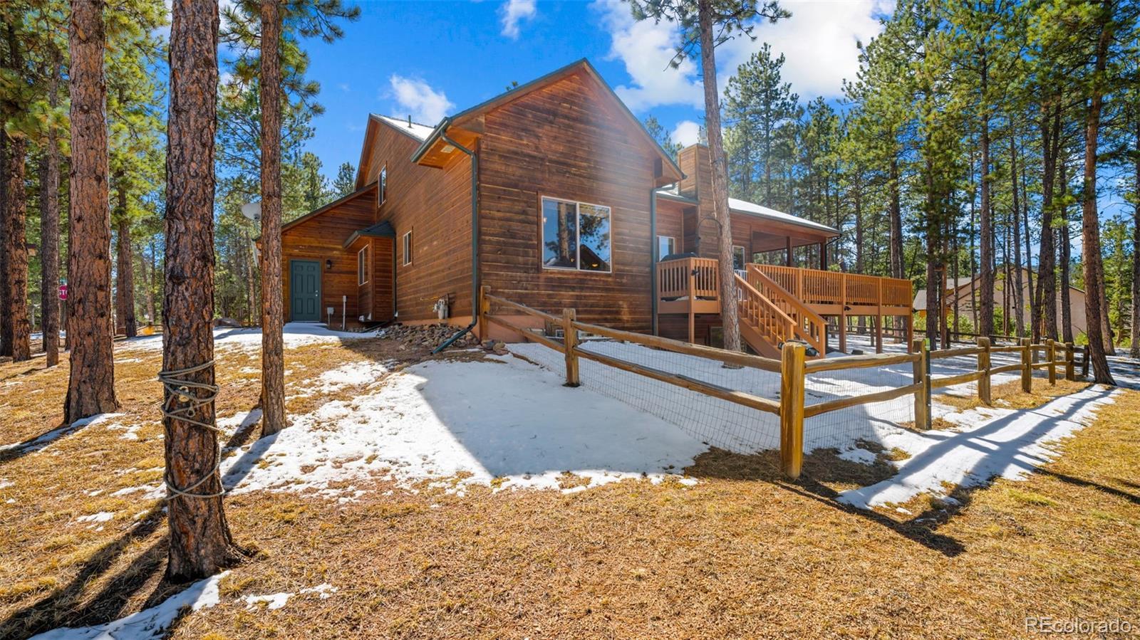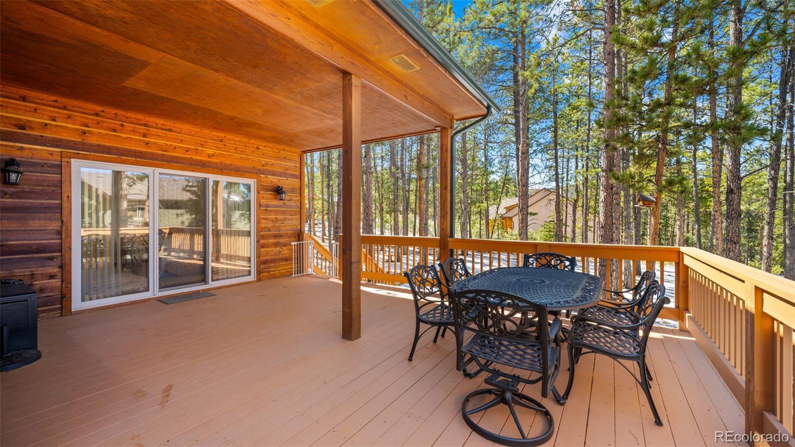 Tucked away on a quiet, wooded corner lot in desirable Woodland Park, this inviting mountain home offers the perfect blend of comfort, space, and Colorado lifestyle. Surrounded by mature pines and set in a peaceful residential neighborhood, the property provides privacy while still offering convenient access to shopping, restaurants, and everyday amenities. A spacious wraparound deck creates the ideal outdoor retreat—perfect for morning coffee, evening cookouts, or simply taking in spectacular Colorado sunsets. The home’s covered front porch welcomes guests and adds to the relaxed mountain charm. Inside, the main level living area is warm and inviting, featuring genuine hardwood floors, abundant natural light, and a cozy gas fireplace that creates a comfortable gathering space year-round. The thoughtfully designed layout includes both a breakfast area and a separate dining room, providing flexible options for everyday living and entertaining. The recently updated kitchen showcases solid granite countertops, newer appliances, and enhanced storage, making it both functional and stylish. The main level primary suite offers a peaceful retreat with private walkout access to the wraparound deck, a beautifully remodeled ensuite bathroom with walk-in shower, and spacious his-and-hers walk-in closets. The finished lower level expands the home’s living space with plenty of room for family entertainment, exercise, hobbies, or hosting guests. A versatile flex room offers additional possibilities for a home office, craft space, or media room. Additional highlights include a finished three-car garage, level driveway, fenced backyard, and a bonus lot that adds extra space and value. Located just minutes from Shining Mountain Golf Course and surrounded by endless Colorado recreation opportunities—from hiking and fishing to skiing and mountain biking—this property captures the best of Woodland Park mountain living.