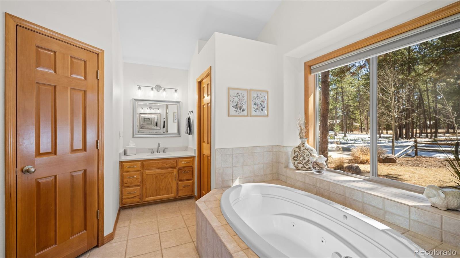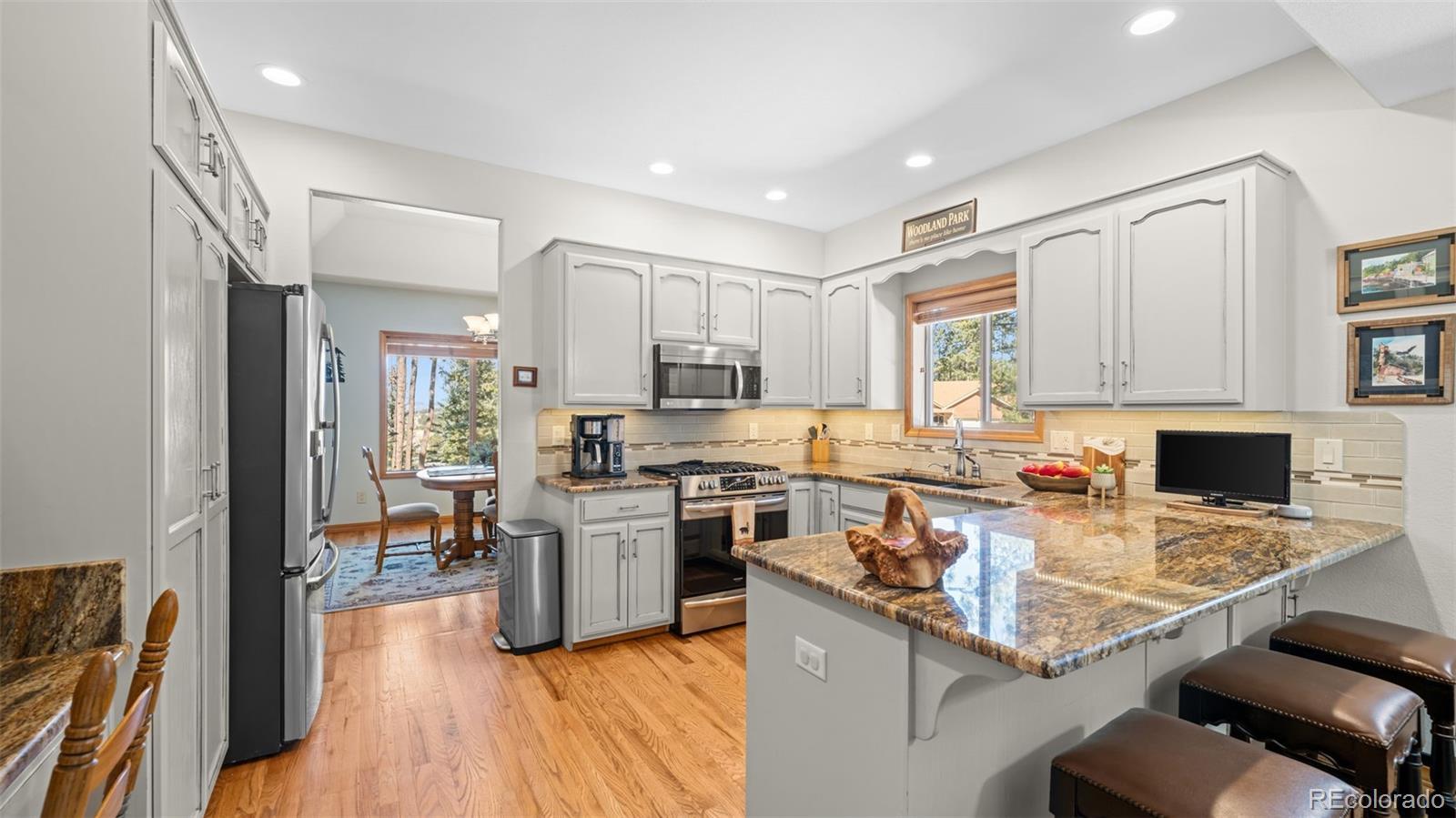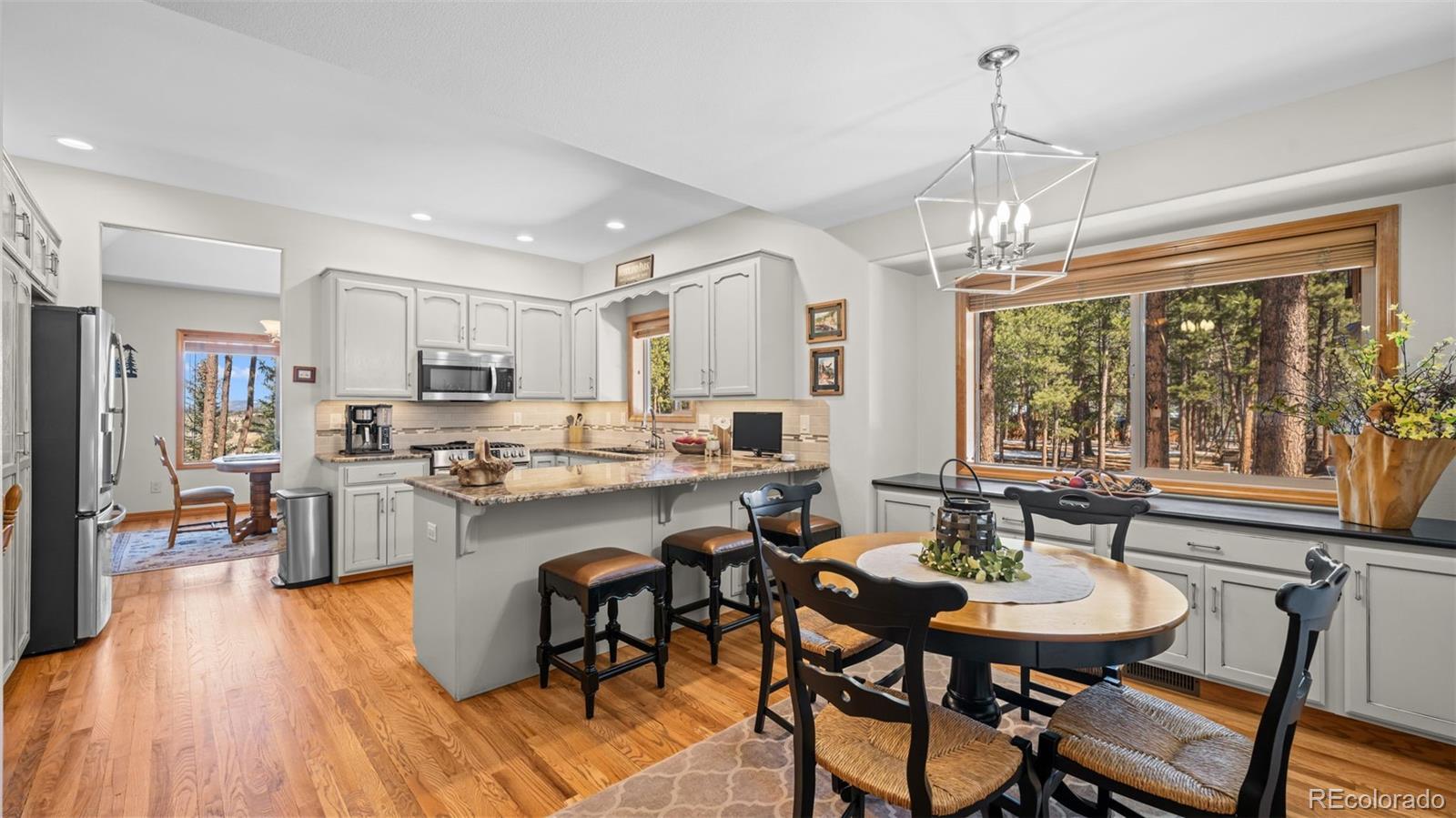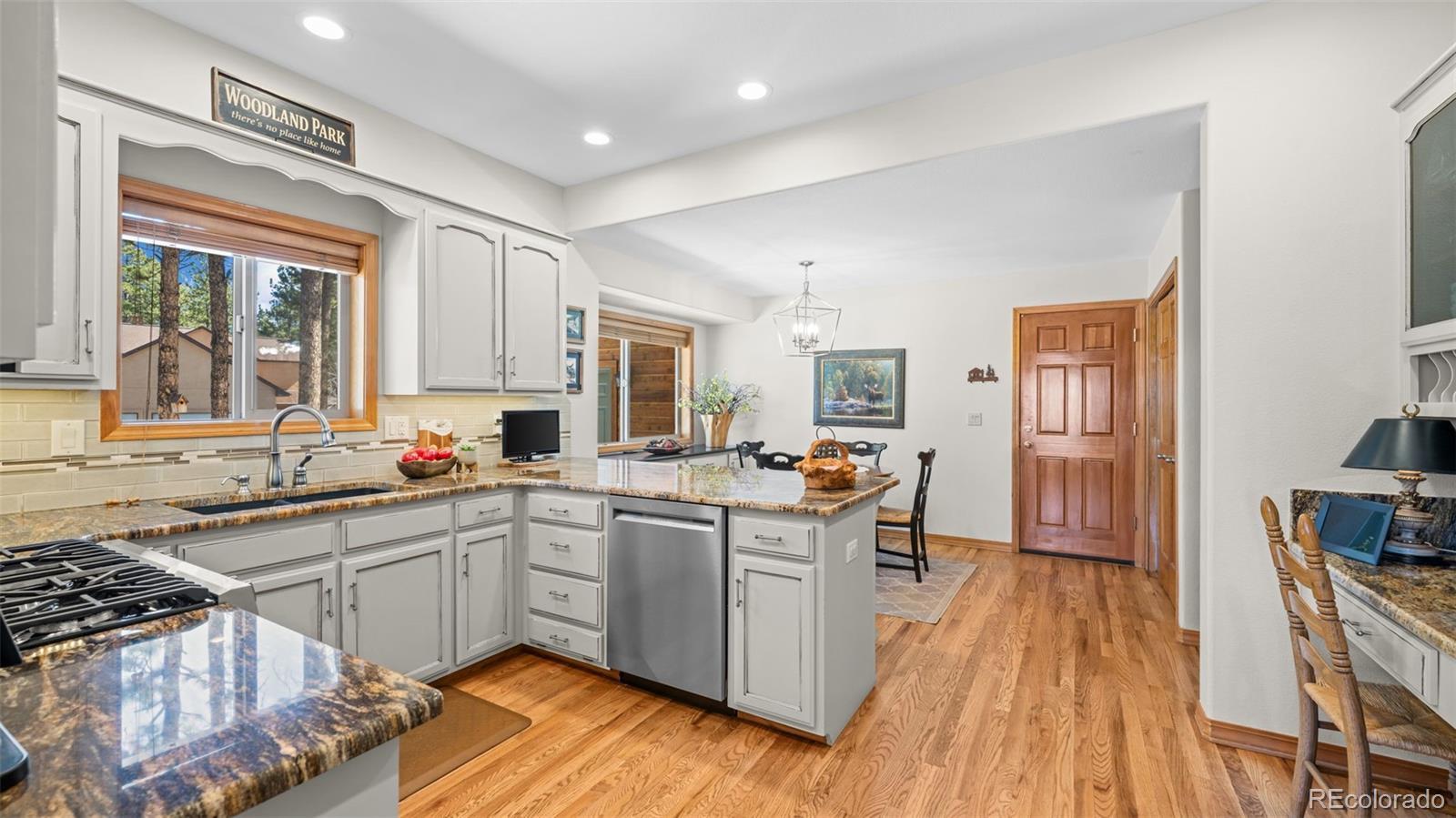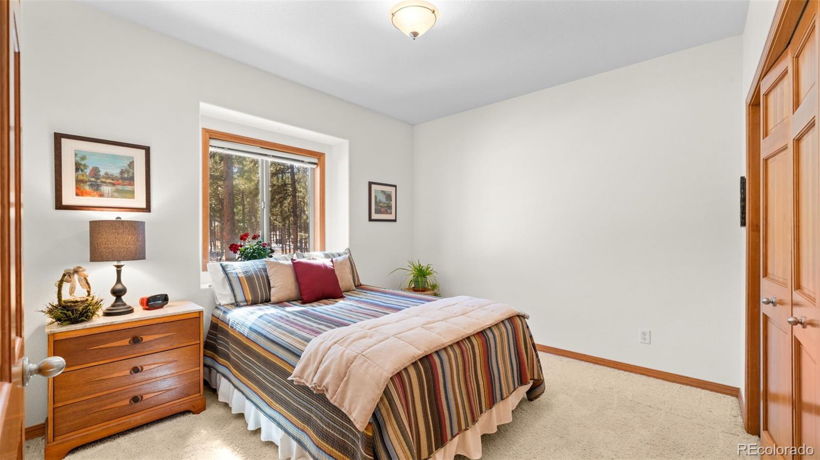 Tucked away on a quiet, wooded corner lot in desirable Woodland Park, this inviting mountain home offers the perfect blend of comfort, space, and Colorado lifestyle. Surrounded by mature pines and set in a peaceful residential neighborhood, the property provides privacy while still offering convenient access to shopping, restaurants, and everyday amenities. A spacious wraparound deck creates the ideal outdoor retreat—perfect for morning coffee, evening cookouts, or simply taking in spectacular Colorado sunsets. The home’s covered front porch welcomes guests and adds to the relaxed mountain charm. Inside, the main level living area is warm and inviting, featuring genuine hardwood floors, abundant natural light, and a cozy gas fireplace that creates a comfortable gathering space year-round. The thoughtfully designed layout includes both a breakfast area and a separate dining room, providing flexible options for everyday living and entertaining. The recently updated kitchen showcases solid granite countertops, newer appliances, and enhanced storage, making it both functional and stylish. The main level primary suite offers a peaceful retreat with private walkout access to the wraparound deck, a beautifully remodeled ensuite bathroom with walk-in shower, and spacious his-and-hers walk-in closets. The finished lower level expands the home’s living space with plenty of room for family entertainment, exercise, hobbies, or hosting guests. A versatile flex room offers additional possibilities for a home office, craft space, or media room. Additional highlights include a finished three-car garage, level driveway, fenced backyard, and a bonus lot that adds extra space and value. Located just minutes from Shining Mountain Golf Course and surrounded by endless Colorado recreation opportunities—from hiking and fishing to skiing and mountain biking—this property captures the best of Woodland Park mountain living.