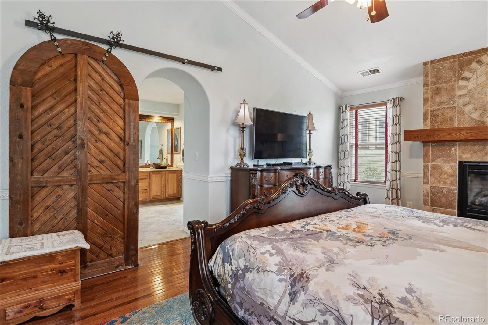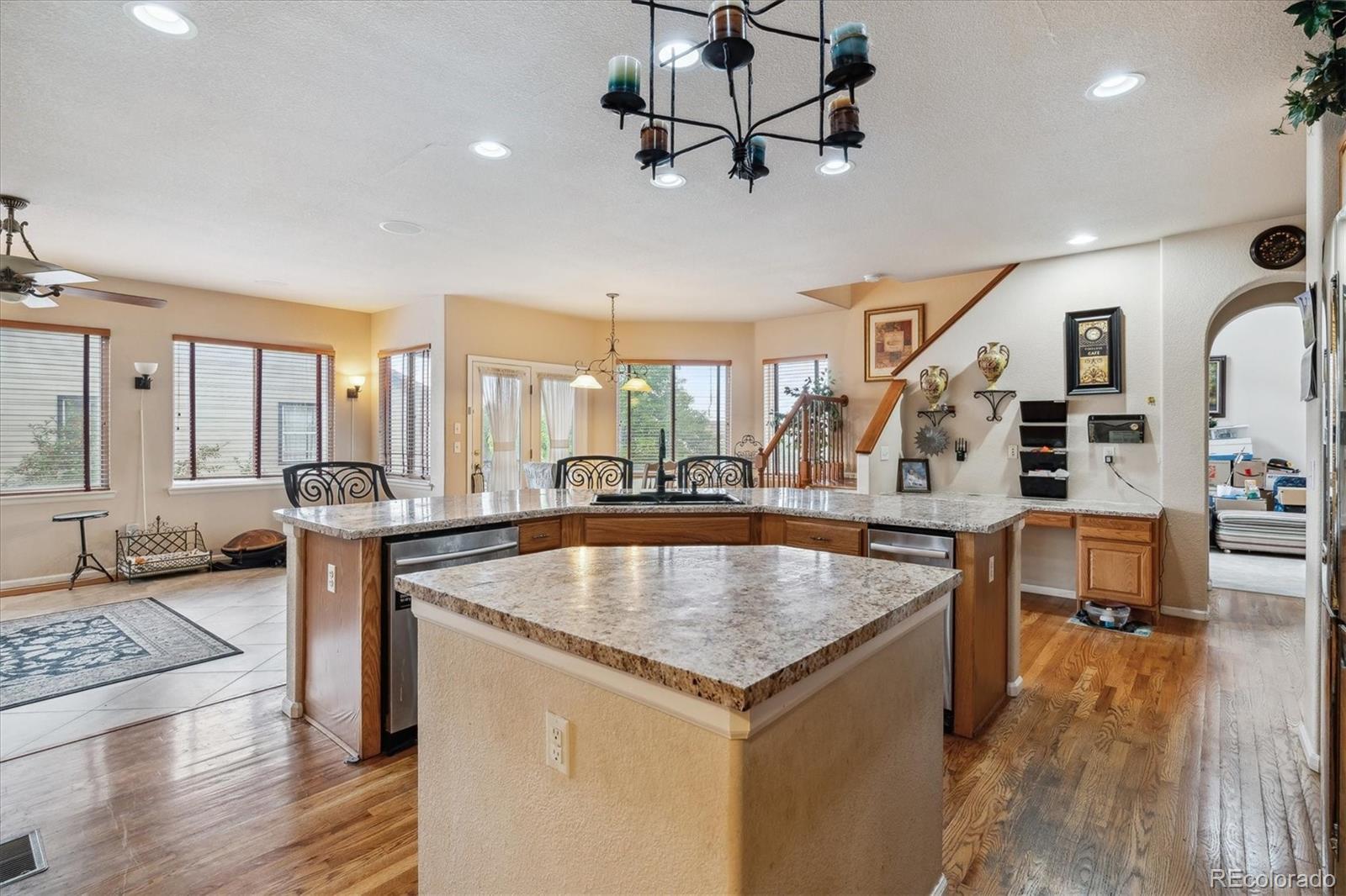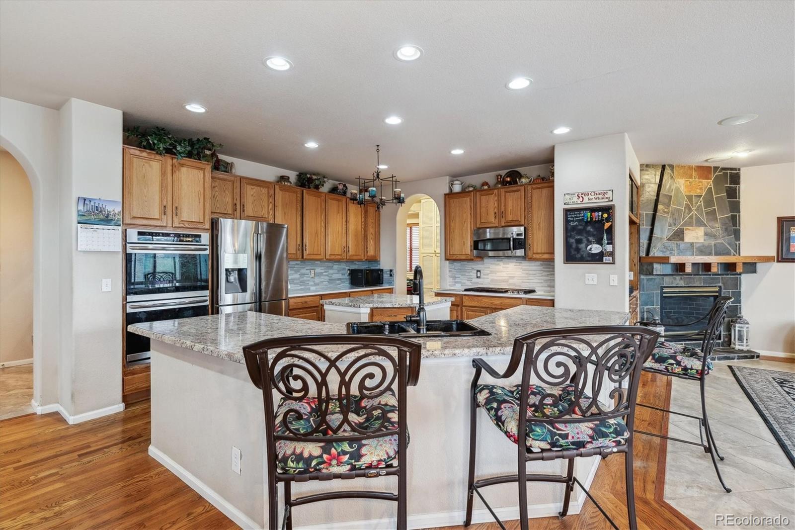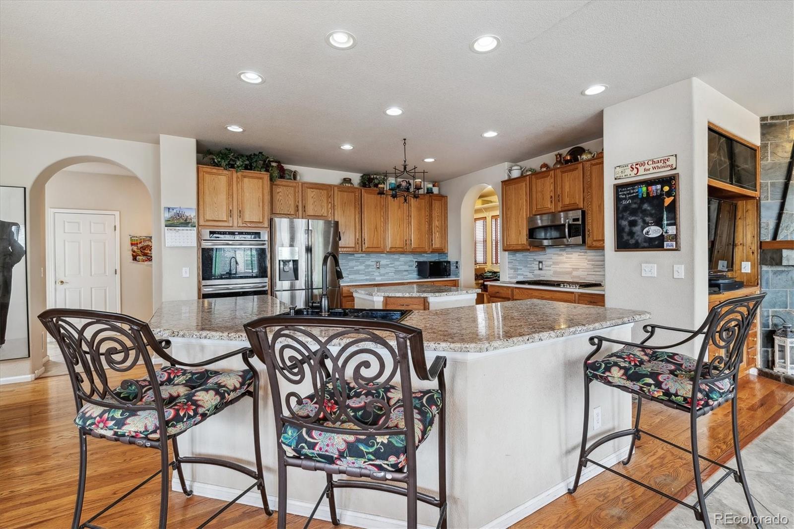 Seller open to all offers — Welcome to this impressive Joyce Homes “Villa Grande” executive residence in Lantern Hill. With 5 bedrooms, 5 baths, and a 3-car garage, this home is built for luxury and livability. You’ll be greeted by a grand two-story entry with vaulted ceilings, tile and hardwood flooring, graceful arches, and stunning stained glass that bathes the foyer in warm, inviting light. The kitchen, heart of the home, flows into the family room with a gas fireplace, and also connects via the back staircase leading upstairs. Dual islands, a built-in desk, breakfast nook, bar seating, plus access to a walk-in pantry and super spacious mudroom give you plenty of function and style. On the main level: a formal dining room and formal living room with custom beamed ceiling, a ¾ guest bath, a quiet office leading to the builder-upgrade private entry into the single-car side of the garage. Upstairs you’ll find the primary suite with vaulted ceiling, romantic gas fireplace, sitting area, access to a private treetop deck, and a luxurious 5-piece bathroom with jetted tub and custom walk-in closet. Three more bedrooms, two more bathrooms, and a cozy hearth room with a gas fireplace give flexibility-a MIL suite, game room, extra office, or whatever best suits your lifestyle. The walk-out finished basement is made for fun: large game room (pool table included), wet bar with brass footrests, a beautiful ¾ bath with a unique walk-in shower, and a custom wine room. A 5th bedroom in this daylight basement ensures privacy. There’s also unfinished space for a workshop, craft room, or media room—ready for your personal touch. Highlands Ranch provides trails, open spaces, and three rec centers so you’ve got something for every age and interest. With this versatile floorplan and premium location, this home has it all.