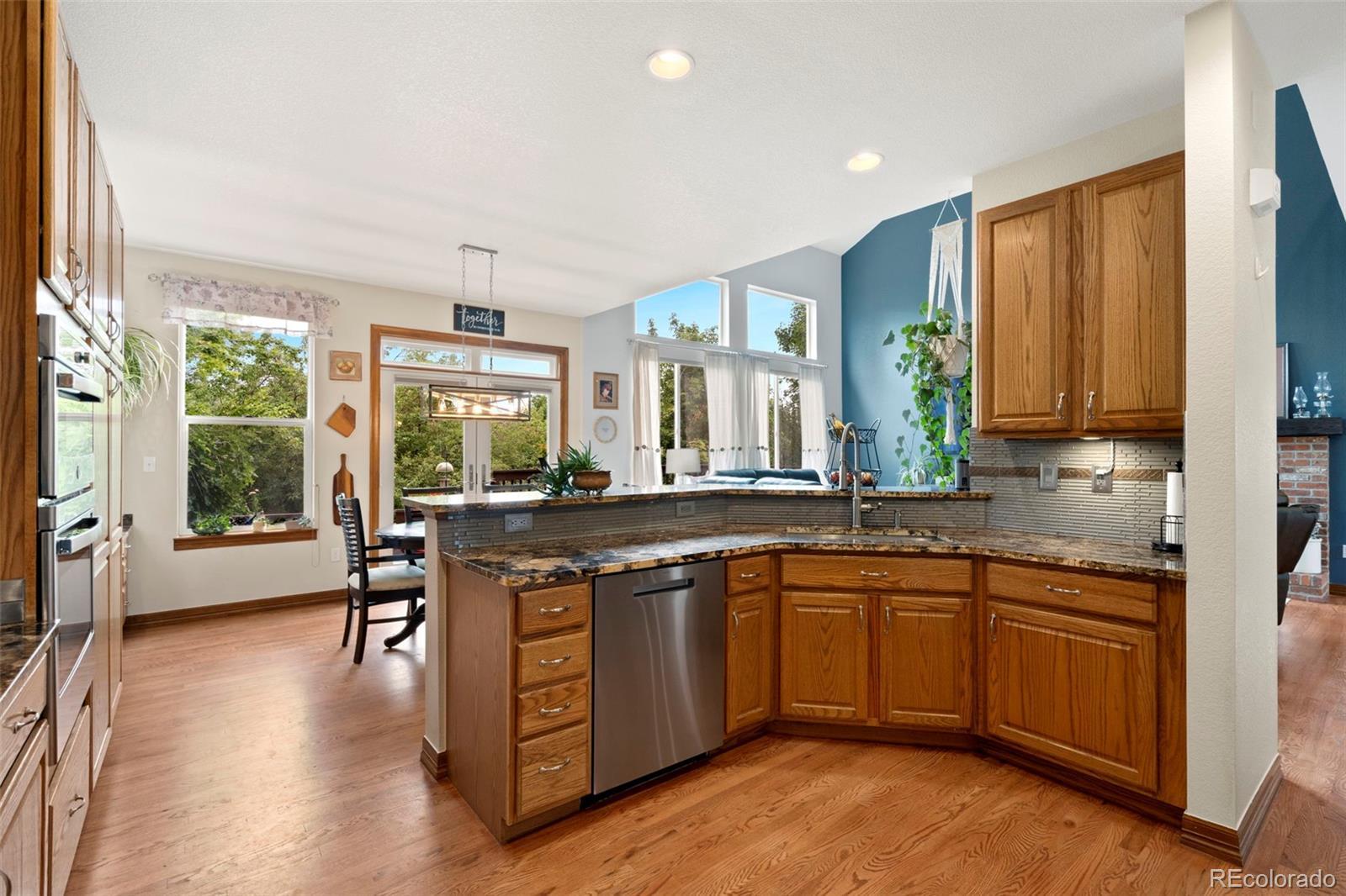 Welcome to your dream home in the highly sought-after Fieldstone community—an oasis nestled beneath towering trees with a tranquil water feature, inviting front porch, and welcoming trex deck located on a quiet cul de sac. This stunning 7-bedroom, 5-bathroom home boasts a bright, open floor plan with soaring ceilings and expansive windows that flood the space with natural light. The spacious gourmet kitchen is a chef’s delight, featuring granite counters, newer appliances, an island with seating, and an adjacent eat-in dining space, plus a formal dining room for special occasions. The main level offers a versatile layout with an office, a bedroom, a remodeled bathroom, and a convenient laundry room. Upstairs, retreat to the luxurious primary suite with a sitting area and a spa-like 5-piece bath, along with three additional bedrooms and two more full bathrooms. The fully finished basement is perfect for entertaining, with a large rec room ideal for movie nights or game tables, a small kitchenette plus two more bedrooms, a nice bathroom, and a generous storage area. Enjoy the beautifully landscaped backyard, a true retreat with vibrant flowers, multi-level decks, a garden area, fire pit, storage shed, shaded lounge with hammock, and an outdoor kitchen on a flagstone patio—perfect for year-round relaxation and gatherings. The oversized 3-car garage includes tandem spaces, ample storage, and a MyQ smart opener. All of this with easy access to Boulder and just minutes from downtown Golden. Enjoy nearby shopping and restaurants, along with bike paths, parks and Table Mountain trails. This is more than a home—it’s a lifestyle.