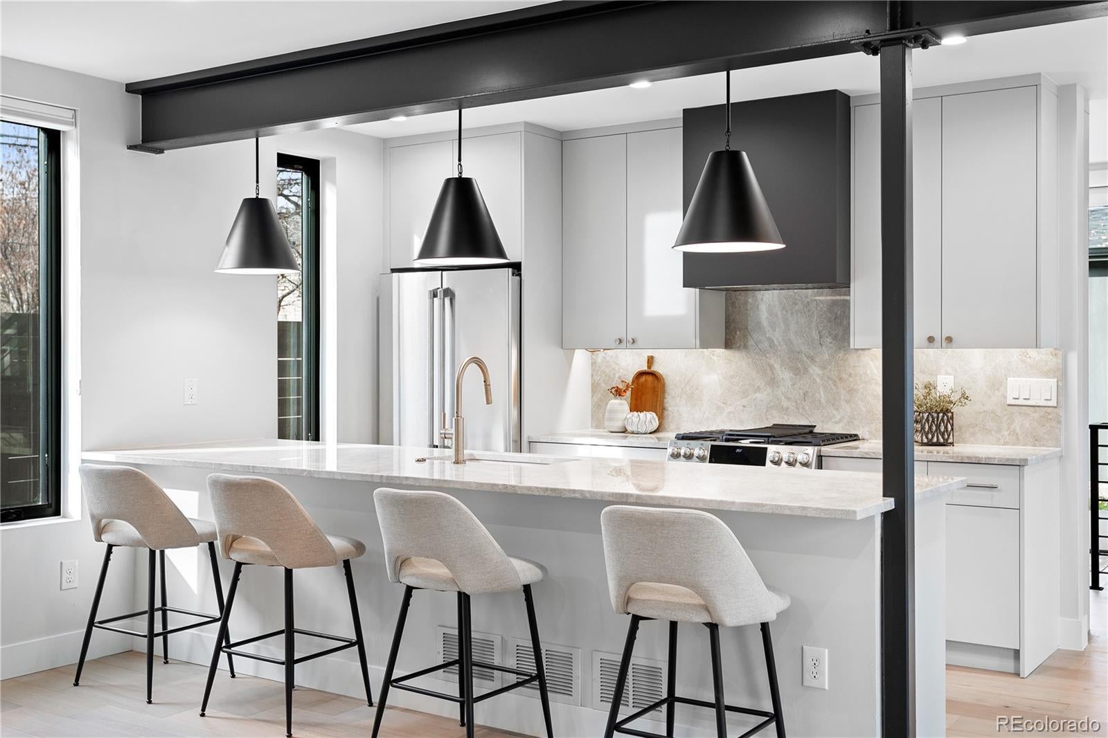 Architectural design meets everyday comfort in this luxury modern townhome, tucked away on a quiet street in Denver’s coveted LoHi neighborhood. Thoughtfully designed with contemporary style and functional living in mind, this 4-bedroom, 4.5-bath residence offers generous hangout spaces, refined finishes, and stunning downtown skyline and mountain views within one of Denver’s most sought-after communities. High-end finishes and clean architectural lines define the open-concept floor plan, designed for effortless entertaining and comfortable daily living. Living and dining areas flow seamlessly and are filled with natural light, offering flexibility and style for gatherings or quiet evenings at home. Each bedroom is generously sized and thoughtfully positioned, featuring ensuite or adjacent baths that provide privacy and convenience. The primary suite offers a peaceful retreat, ideal for unwinding after a day in the city. An expansive rooftop deck creates an exceptional outdoor living space—perfect for hosting, relaxing, or enjoying morning coffee—and is reinforced and ready for a hot tub with sweeping views of the downtown Denver skyline. A rare, fenced private backyard adds valuable outdoor space for pets, gardening, or relaxing outdoors. Located just steps from LoHi’s renowned cafés, restaurants, breweries, and neighborhood favorites, this home offers outstanding walkability with easy access to downtown Denver and major routes. Less than 15 minutes from Broncos, Nuggets, and Avalanche games, concerts, and major city events, this is modern urban living at its finest.