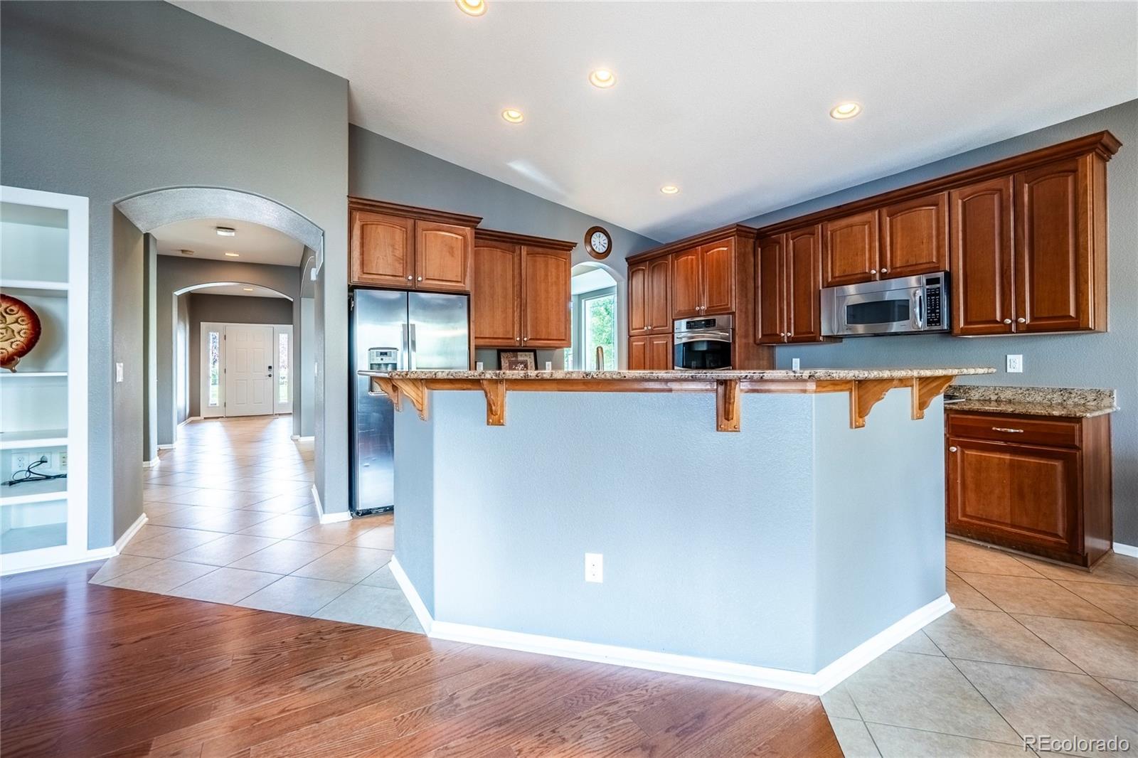 Rare Ranch Home in Murphy Creek – Main Floor Living! Welcome to this beautiful ranch-style home in the highly desirable Murphy Creek community! From the charming curb appeal and large front porch to the warm and inviting interior, this property offers both comfort and convenience. Step inside to a welcoming foyer that opens to an office with built-in shelving and a formal dining room featuring a bay window. The gourmet kitchen is a chef’s delight with a gas cooktop, double ovens, granite countertops, a large island, and an eat-in dining space. French doors lead out to a spacious Trex deck—perfect for outdoor living and entertaining. The main floor boasts a large family room with a cozy gas fireplace, a private primary suite, and two additional bedrooms, all with convenient access to the laundry room (complete with cabinets and utility sink) and the oversized 3-car garage. The finished basement offers even more living space with a bar (featuring a built-in keg and wine/beverage refrigerator), a media room with its own gas fireplace, and built-in niches. Guests will love the private suite with a full bath, while the bonus/wine room could easily serve as a 5th bedroom (non-conforming). A large storage area includes a finished craft/workshop. Stop over to the Murphy Creek Tavern restaurant, the community amenities include a pool, playground, tennis courts, trails, and more all within walking distance. Murphy Creek K-8 School, too! Drivable conveniences include Buckley Air Force Base, Southlands Mall, E-470, I- 70, and DIA. Handicap accessibility throughout the home. This home truly combines main-floor living, functional design, and an active community lifestyle—all in one rare find!