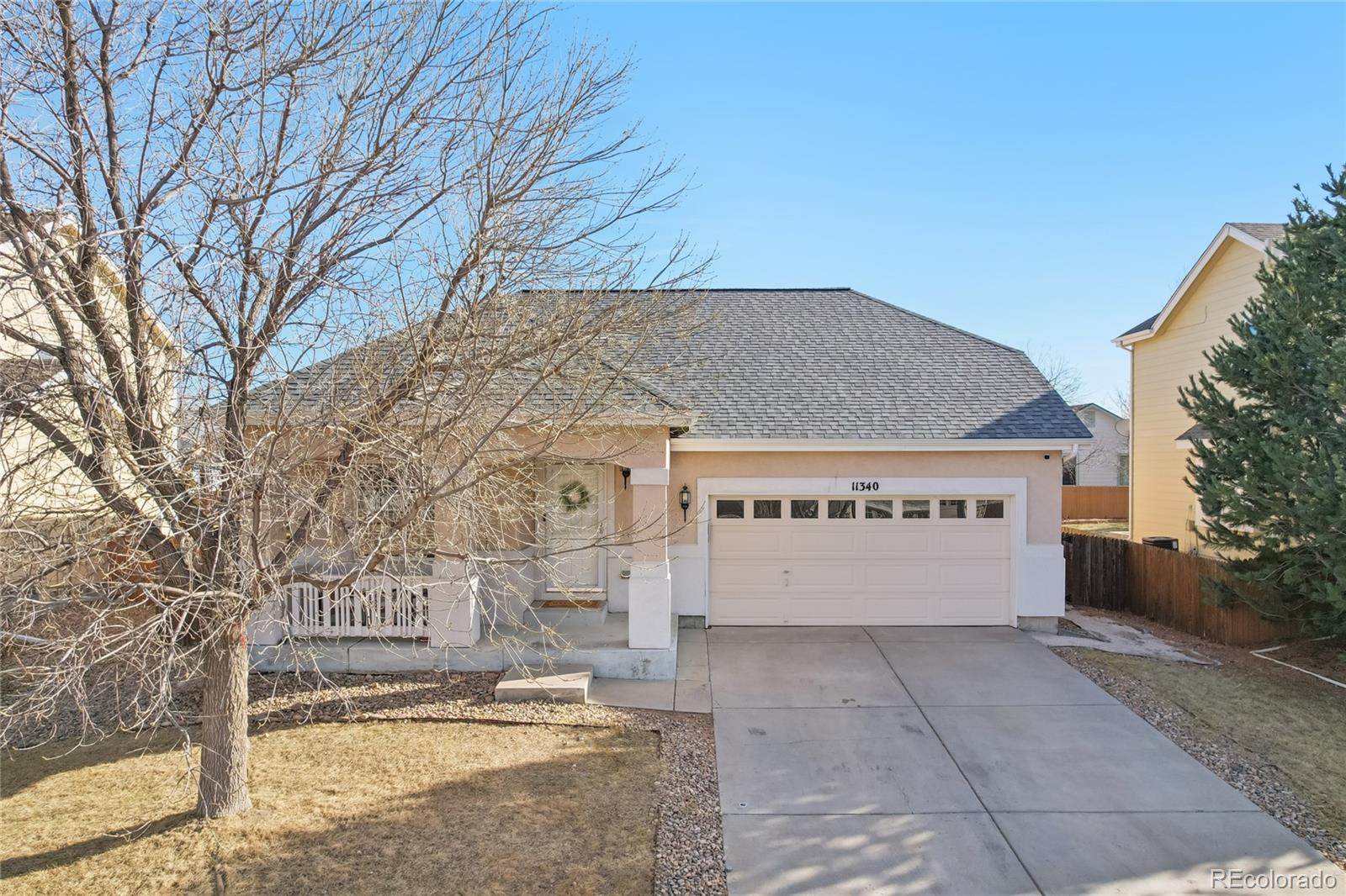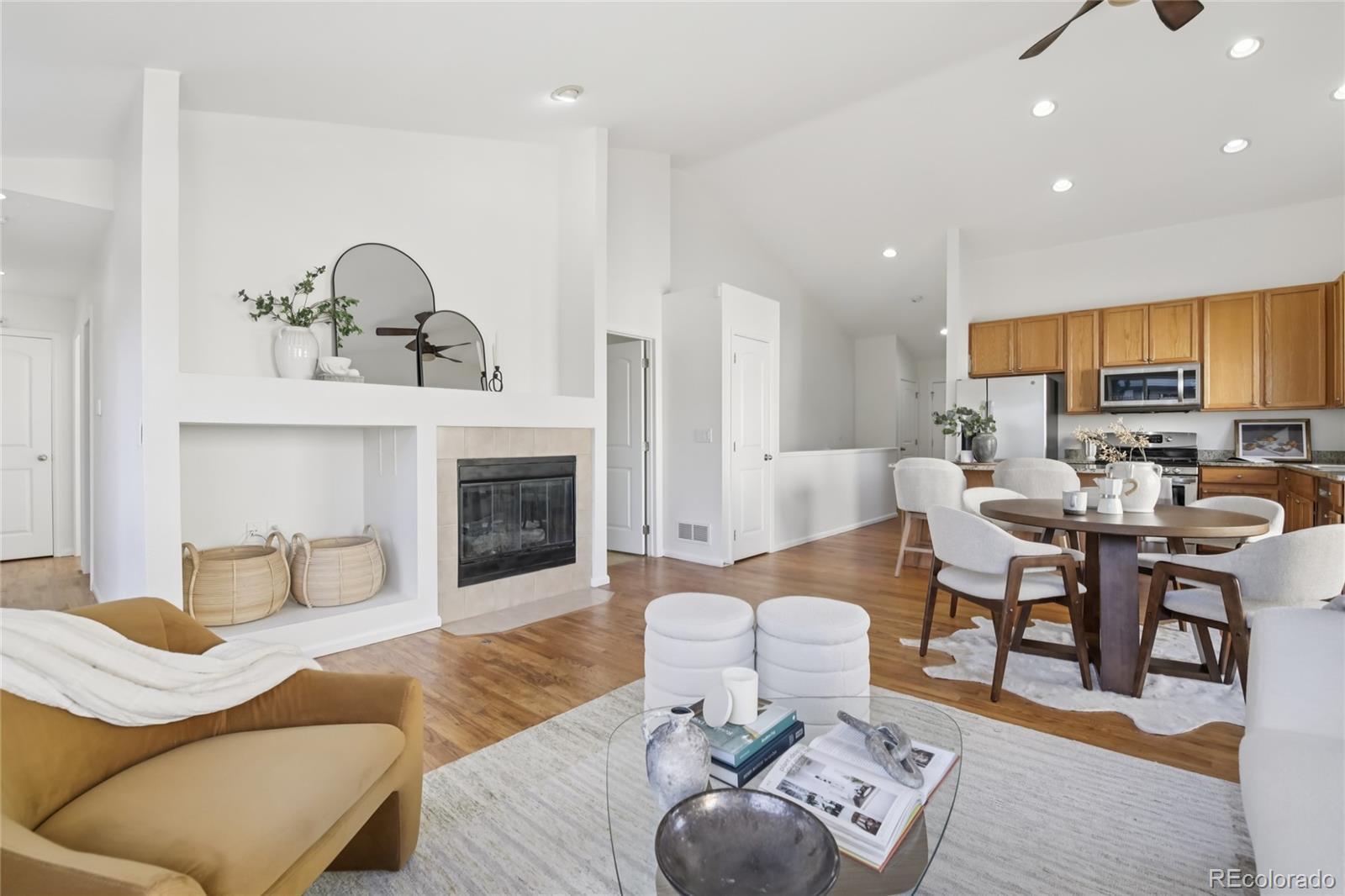 Welcome to this beautiful, light-filled home in the desirable Skylake Ranch community of Thornton, where thoughtful updates and an inviting layout create a truly move-in-ready retreat. A charming covered front porch welcomes you inside, where a sunny front office offers the perfect space for working from home or quiet reading. Continue down the hall to discover a stunning open main living area highlighted by soaring vaulted ceilings and an abundance of natural light. The kitchen features granite countertops, stainless steel appliances, and a convenient breakfast bar, flowing seamlessly into the dining area and living room. Here, a cozy gas fireplace anchors the space, while sliding glass doors open to the back deck—ideal for indoor-outdoor living. The main-floor primary bedroom suite offers vaulted ceilings, a private en-suite bath, and a large walk-in closet. An additional bedroom, full bathroom, and laundry room with access to the attached two-car garage complete the main level. The finished basement expands the home’s living space with a spacious bonus or flex room, an additional bedroom, and a beautifully finished 3/4 bathroom—perfect for guests, recreation, or a private retreat. Step outside to enjoy the fully fenced backyard and sunny deck, offering plenty of room for outdoor furniture and the perfect spot for morning coffee or relaxing afternoons soaking up Colorado sunshine. Extensive updates include a new roof and gutters (2024), finished basement (2023), whole-house interior paint, new carpet, restained deck, a newer water heater (approx. 4 years old), and a brand-new furnace and air conditioning system. This bright, beautifully maintained home offers comfort, style, and peace of mind in a fantastic Thornton location—ready for you to move right in and enjoy!