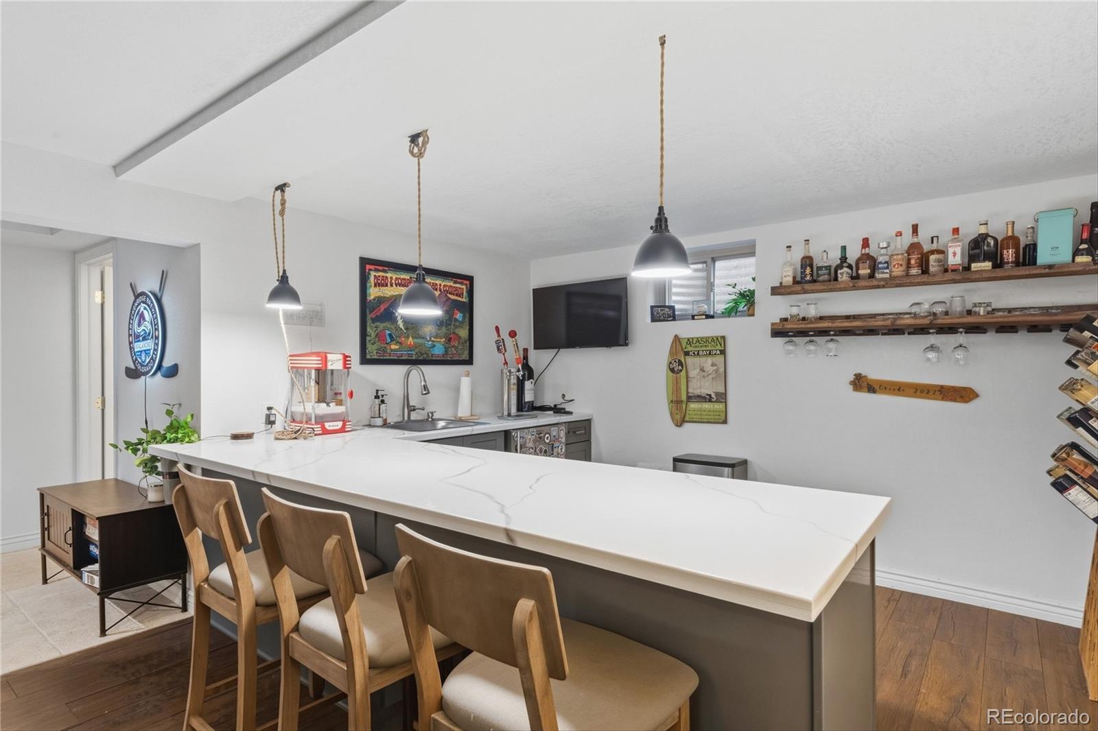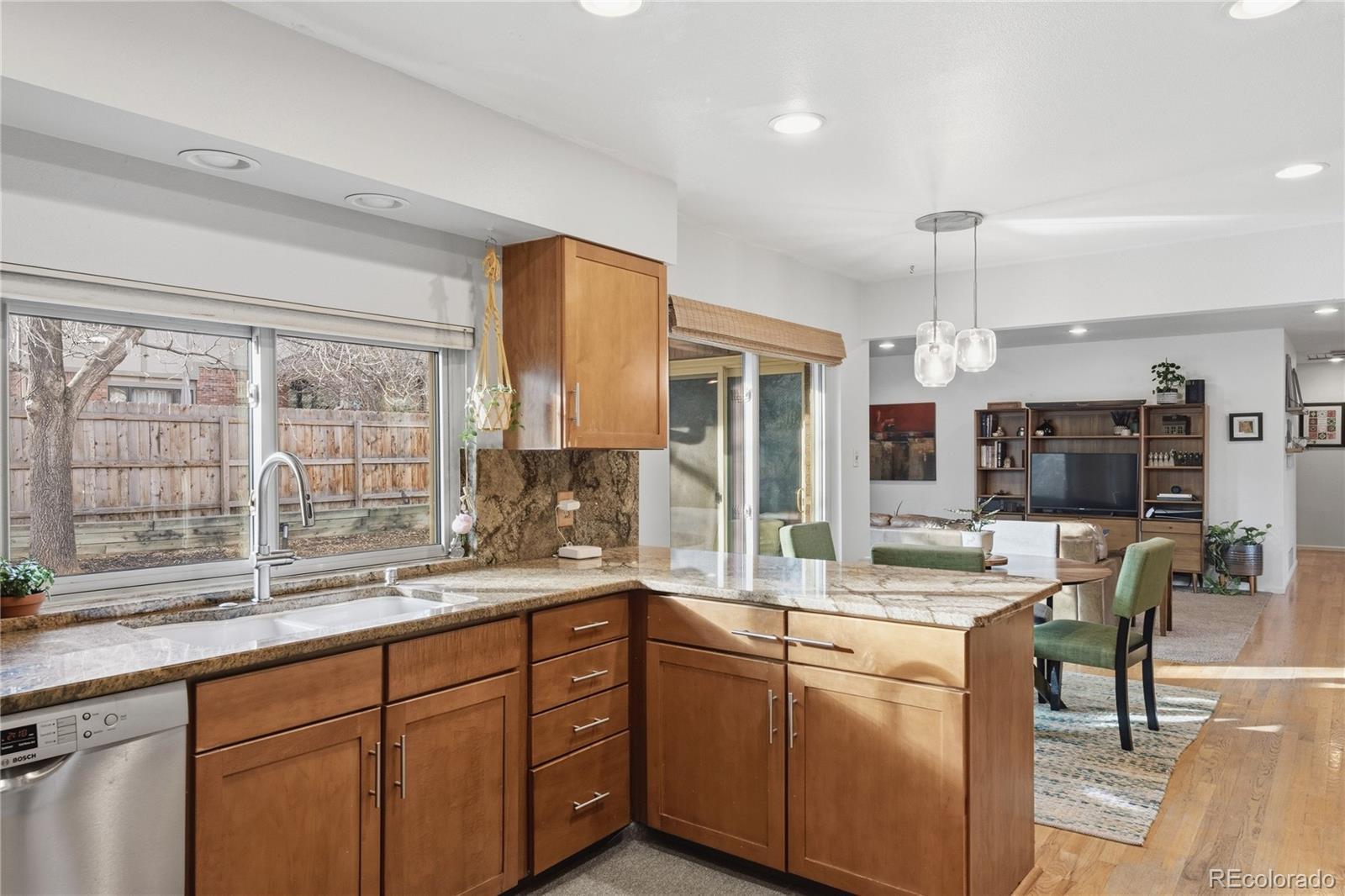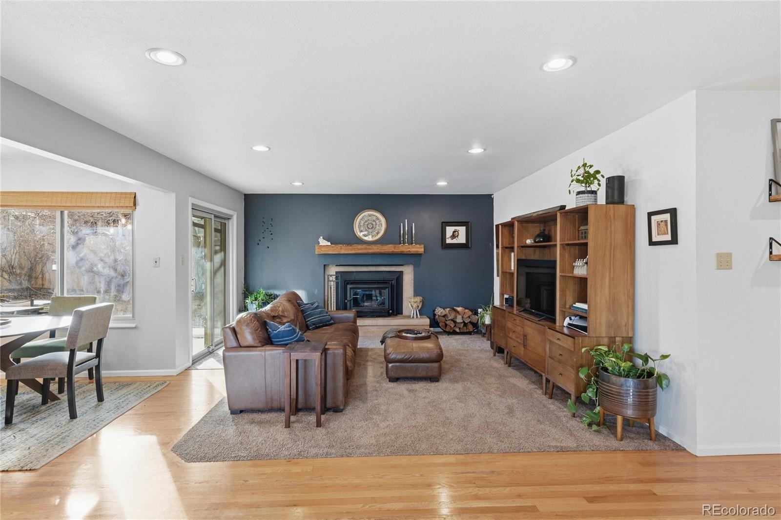 Sprawling 5 Bed | 4 Bath brick ranch on a quiet cul-de-sac in desirable Littleton, can be called home today! Timeless curb appeal welcomes you with classic brick, mature trees, and a newly re-paved driveway (8/2025). Inside, the open-concept main level features hardwood floors, abundant natural light, and a seamless flow between living, dining, and kitchen spaces. The inviting living room is anchored by a woodburning stove (2023), creating warmth and character. The kitchen offers granite countertops, stainless appliances, generous cabinetry, and ample prep space — ideal for everyday living and entertaining. The spacious primary suite includes a large closet and a beautifully appointed en-suite bath with dual sinks, soaking tub, and separate shower. New carpet installed November 2025 (with warranty) adds fresh comfort throughout select areas. The fully finished basement expands your living space with a large recreation area, game room, custom wet bar with seating, beverage fridge, and multiple entertainment zones. An additional bedroom and bathroom provide flexibility for guests, while a substantial storage area keeps everything organized. Step outside to an expansive backyard retreat featuring a large concrete patio, dedicated firepit gathering space, mature landscaping, a peaceful koi pond, and generous lawn — perfect for entertaining, pets, or play. The private lot offers exceptional outdoor living rarely found at this price point. A rare combination of space, updates, and location — this home is move-in ready and designed for both comfort and connection.