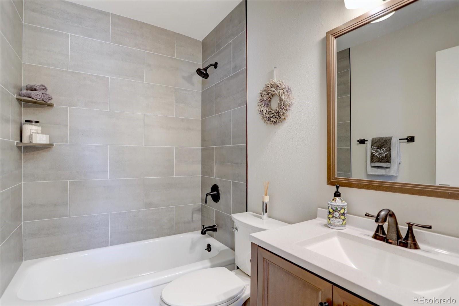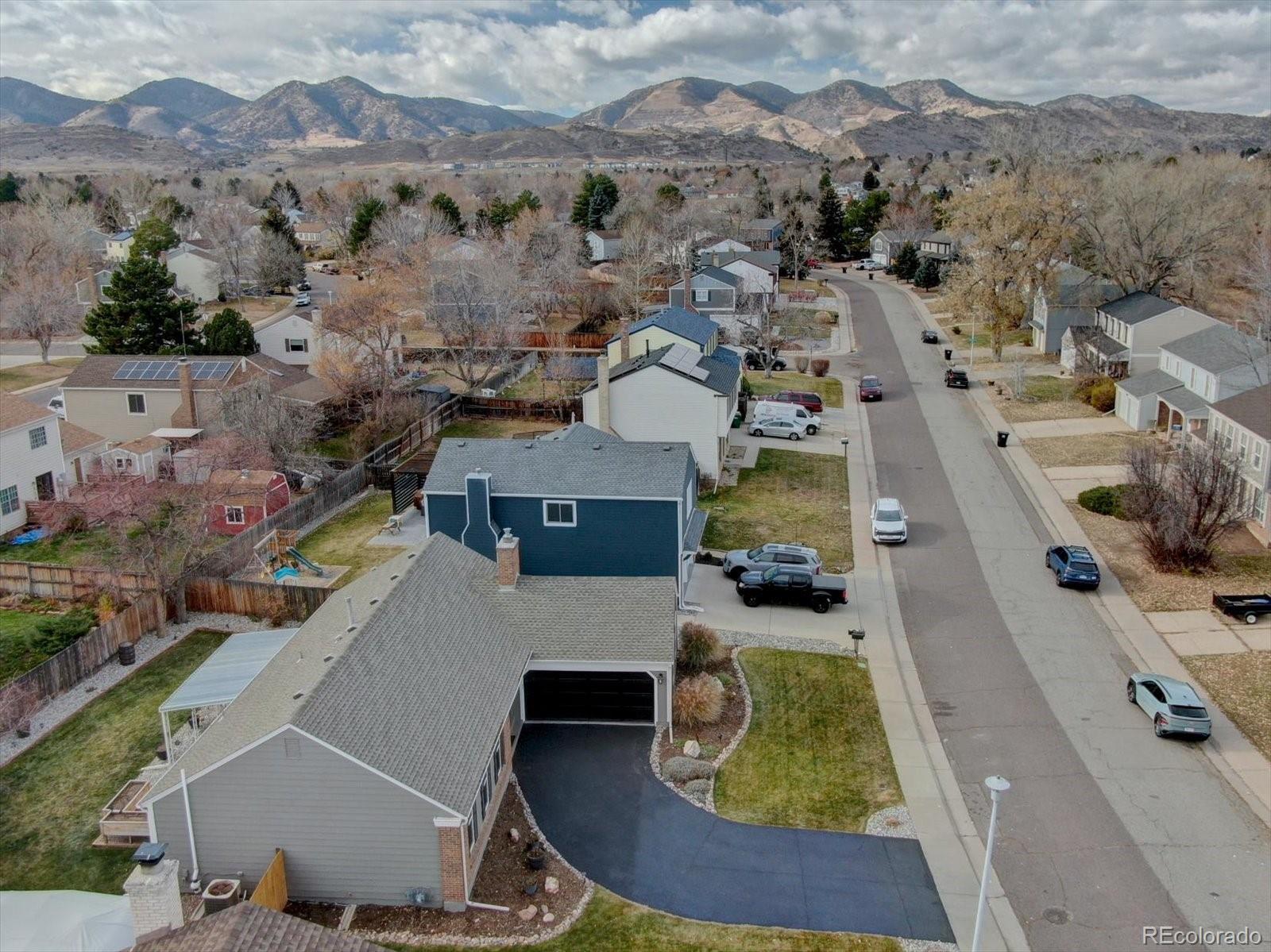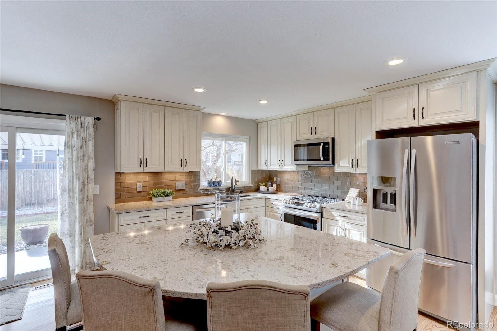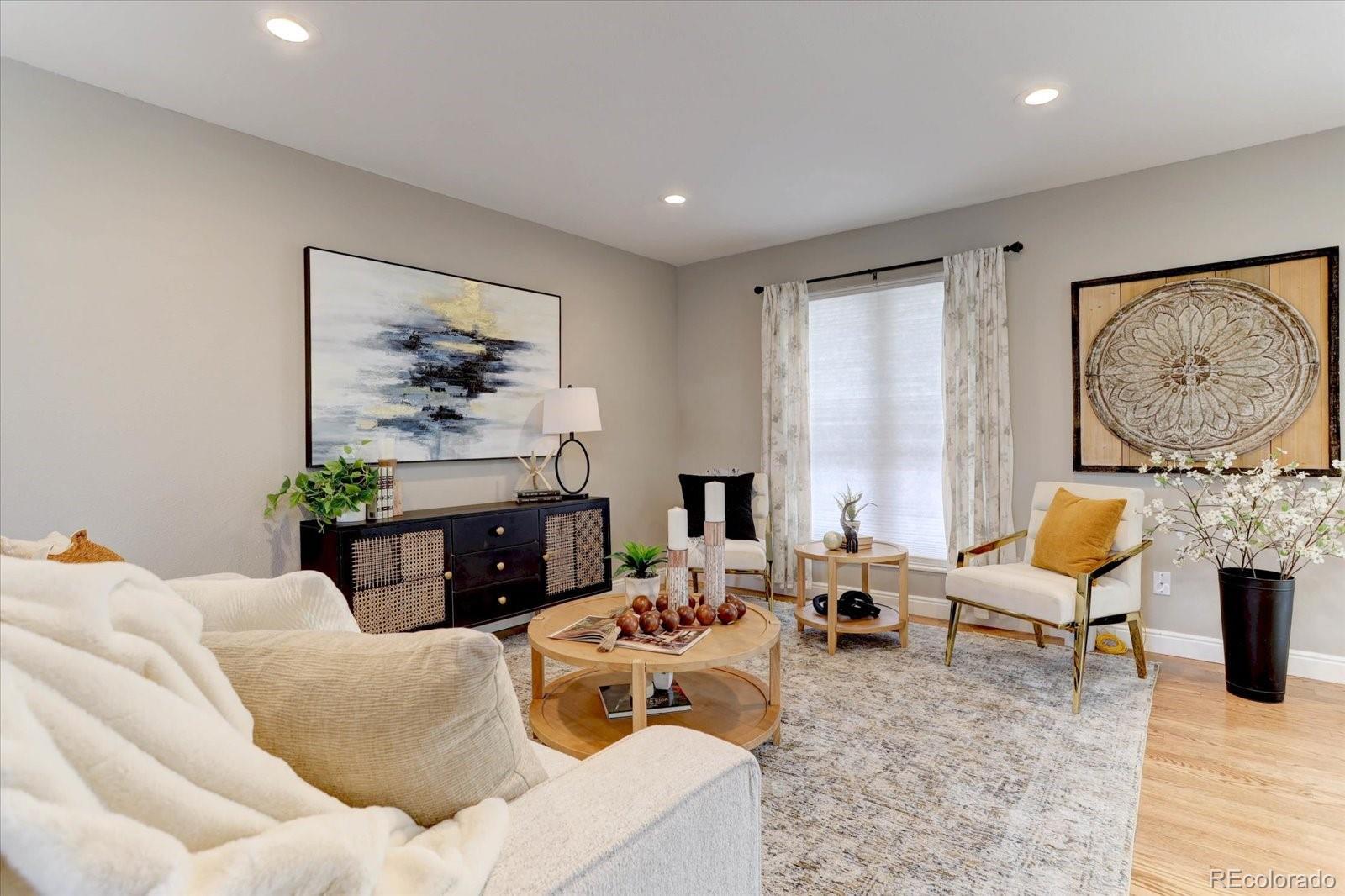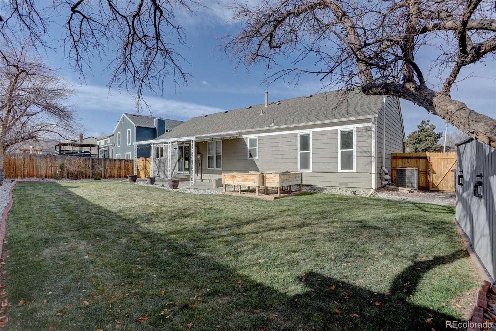 Welcome to a lovingly remodeled ranch home updated with thoughtful improvements inside and out. The main level has been opened up for modern living, featuring solid red oak large-plank hardwood floors, newer paint, upgraded baseboards, recessed LED lighting, and updated windows. The remodeled kitchen includes soft-close 42" cabinets, slab quartz counters, a large eat-in island, stainless steel appliances, and a glass-tile backsplash. Three bedrooms sit on the main level, including a private primary suite with a remodeled three-quarter bath and walk-in closet. The main-floor bath has also been fully updated, and the convenient laundry area features a newer upgraded LG ThinQ washer and dryer. The finished basement adds flexible living space with an additional large bedroom, rec room or office, a remodeled half bath, newer carpet, and large storage room with custom storage shelving. Outdoor living shines with a covered patio with two heaters, newer fencing, a beautifully landscaped yard with sprinkler and drip systems, three raised garden beds with organic soil, and two storage sheds. Additional highlights include newer exterior paint, newer gutters, new garage door, updated electrical panel, radon mitigation system with sealed crawlspace, newer insulated front door, Anderson glass screen door, Ring doorbell, Nest thermostat, and a wood-burning stove. Pride of ownership and move in ready. The oversized garage offers (220) EV compatible, a new garage door, new door from garage to house, new windows, and custom built-in shelving. Five year roof cert and furnace has been cleaned and certified. This home is move-in ready and thoughtfully upgraded throughout. Seller is also a Licensed Colorado Realtor.