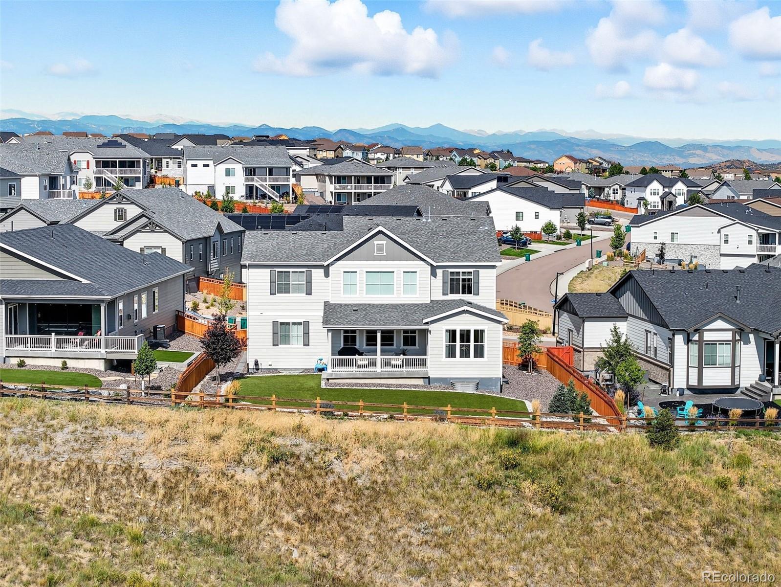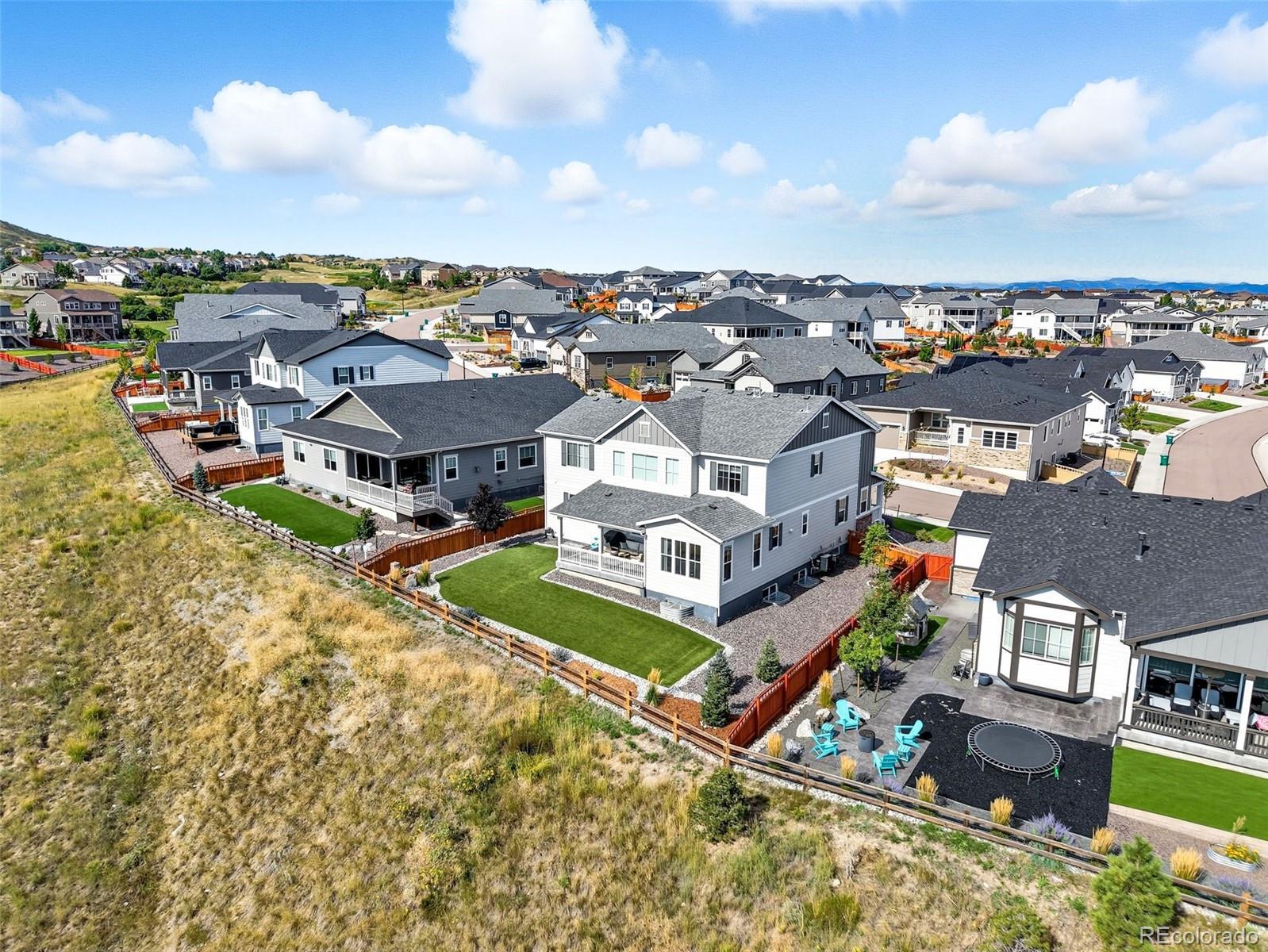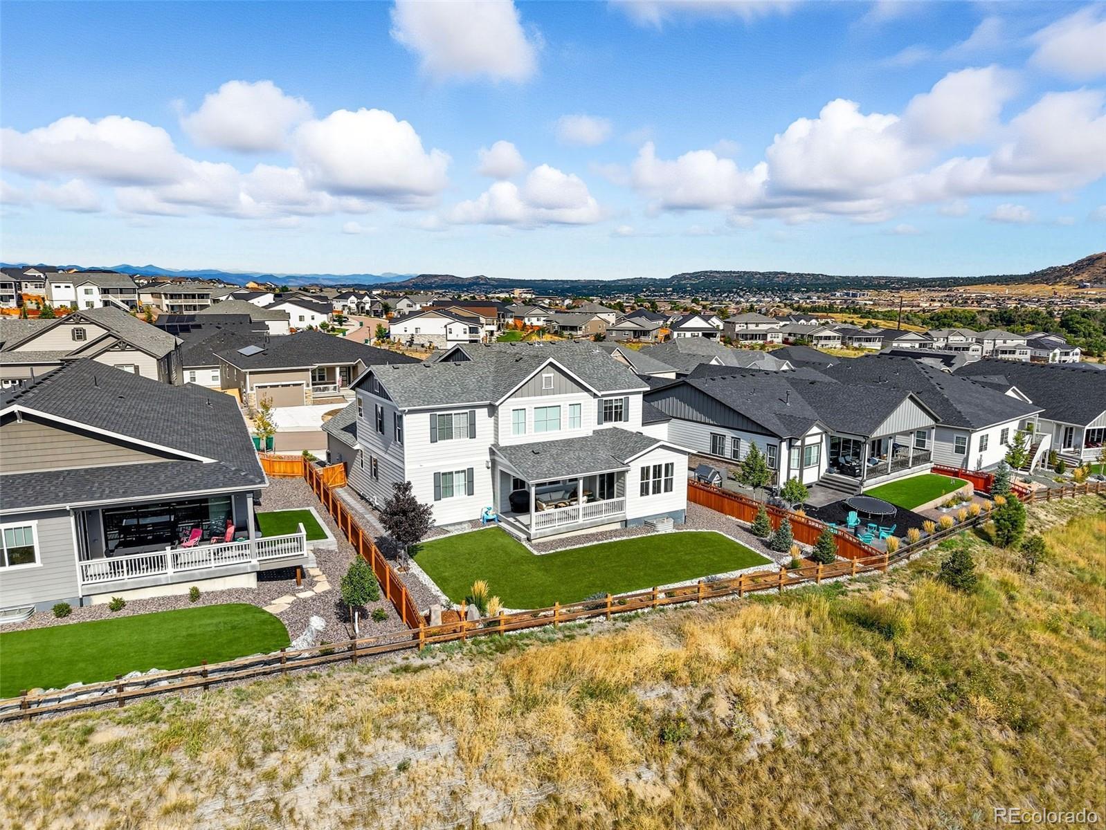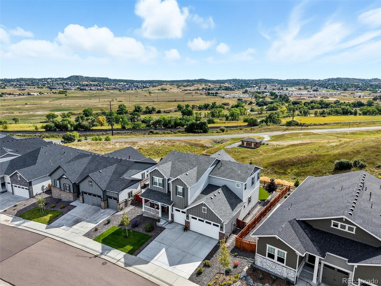 SCROLLING COMPLETE...THIS IS THE ONE! Grab one of Blacktail’s best open-space lots, where 'Castle Rock' takes center stage and the meadows stretch out back like your own private postcard. AN A+ LOCATION, just minutes to 2 playgrounds, top-rated schools, 2 neighborhood pools plus the Grange clubhouse, home to fun events that help newcomers build true community. Time to head out? You’re 5 minutes to Downtown, the Outlets, and I-25. Inside? This home just delivers! Immaculately maintained and move-in ready we start with a FORMAL DINING ROOM that sets the stage for clinking glasses, big laughs, and the kind of gatherings that spill long past dessert. It links to a CHEF’S KITCHEN through a smart BUTLER’S PANTRY with a beverage cooler and a PROVISION PANTRY keeping everything handily organized. Pretty white cabinetry, moss-green backsplash, quartz counters, an apron-front farm sink, double ovens, and a generous sit and sip island finish out the kitchen. But WOW…like a ‘knock-your-socks-off sort of wow’…the 2-STORY GREAT ROOM dramatically joins a VAULTED BREAKFAST NOOK flooded in southern light, a 5-STAR view, and access to a COVERED PATIO and ALL-SEASON TURF that extends the living space for snowman builds and starlit nights. A DEDICATED OFFICE makes “WORK FROM HOME” a true luxury, while a MUDROOM and FULL LAUNDRY ROOM keep backpacks, boots, and leashes tidy. Then we’ve got 4 BEDROOMS ALL ON THE SAME LEVEL, a quiet PRIMARY SUITE that captures serene views of that open space and joins to a spa-like bath, while additional bedrooms add flexibility with one room offering an ENSUITE BATH, and two others sharing a well-appointed hall bath. The FINISHED BASEMENT is yet another win: Extra room for fun or multi-gen living with its soaring 10' ceilings, 4 SUNNY EGRESS WINDOWS, a GUEST ROOM and BATH, GYM/FLEX SPACE, LOTS OF STORAGE and room for movie nights or even a bouncy castle if you need one! To top it off, a 3-CAR GARAGE keeps all sundry adventure toys at the ready. LET'S GO!