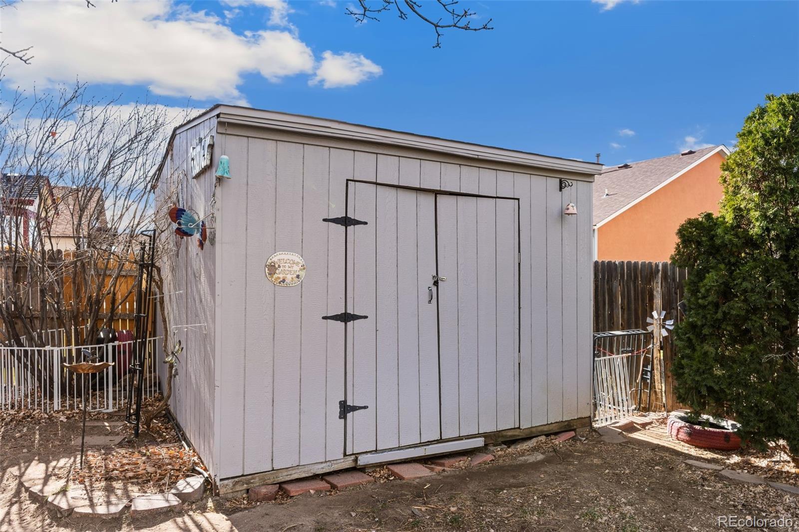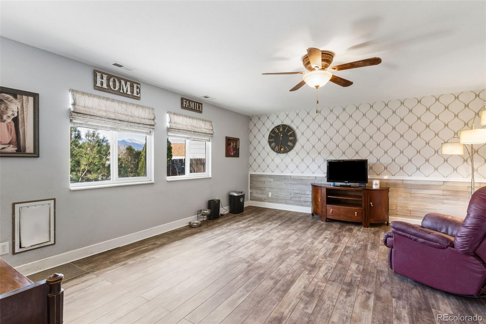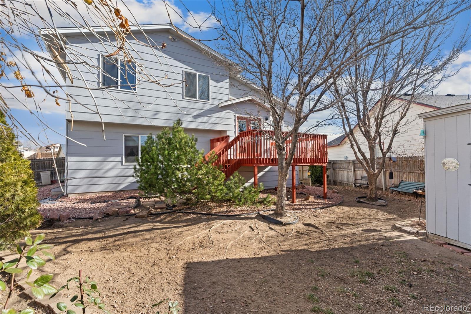 Beautifully updated 4-bedroom, 3-bath home in Fountain Valley Ranch! Ideally located just minutes from Peterson Space Force Base, Colorado Springs Airport, Fort Carson, and Pikes Peak State College. This home impresses from the moment you step inside. The main level boasts an inviting kitchen and dining area featuring white soft-close cabinetry, including slide-out drawers in the pantry cabinet. A striking Moroccan trellis tile backsplash beautifully complements the dark gray granite countertops, while a center island topped with white quartz is highlighted by trendy bubble-glass pendant lighting. All newer stainless-steel appliances are included, featuring an induction range and an antimicrobial dishwasher. Step outside through the atrium door with built-in between-the-glass blinds, to the spacious back deck - perfect for relaxing or entertaining and even provides a glimpse of those Colorado mountains! The dining area is further enhanced by a custom geometric accent wall and a charming window-seat bench offering both additional seating and hidden storage. Upstairs you will find the primary suite, which is showcased by another geometric accent wall and an updated en-suite ¾ bath with a tastefully designed oversized, spa-like shower. Two additional bedrooms and a nicely updated full bath featuring a marble countertop and vessel sink complete the upper level. The lower-level family room includes a convenient doggie door that leads to the backyard and a matching dog house - perfect for pet lovers. The fourth level offers a spacious bedroom with a garden-level window allowing for plenty of natural light, a third updated ¾ bath, and a dedicated laundry area. A 12’ x 12’ wood storage shed is included and provides ample extra storage space. This home is move-in-ready and combines modern updates, thoughtful design, and an excellent location—DON'T MISS IT!