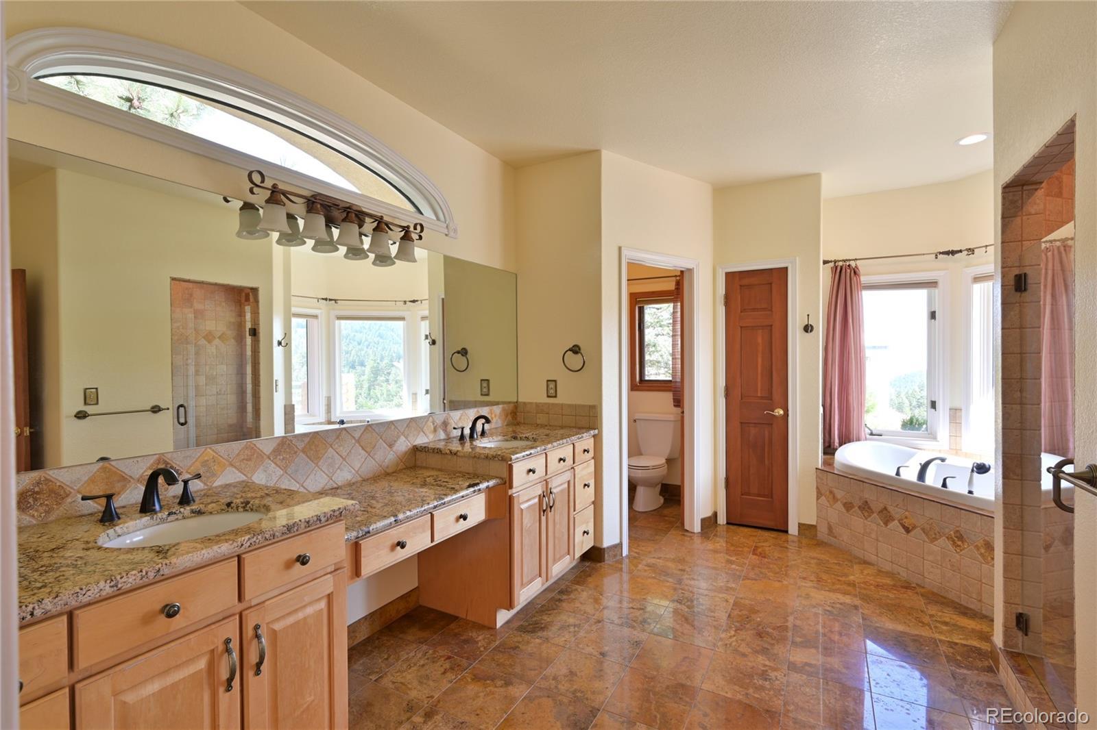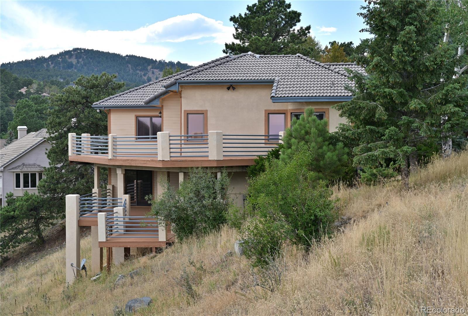 Price reduced - No HOA in gated community. This is a great opportunity to bring your offer! Live above the clouds in an exquisite top-of-the-ridge, sunny, foothills home with breathtaking mountain and city views surrounded by custom homes. This perfect location is convenient to I-70 and downtown Golden offering an abundance of shopping and restaurants within a quick 15-minute drive. 25 minutes east to downtown Denver and 40 minutes to DIA. West to mountain ski resorts - 30 minutes to Loveland, 40 minutes to Eisenhower tunnel and 1 hour to Copper Mountain or Winter Park. Exclusive Panoramic View location in Mt. Vernon Canyon, accessed through the gated Riva Chase community. Enjoy Riva Chase amenities without the HOA. Luxury meets convenience – grand entry flows into spacious main level with expansive hardwood and stone flooring. Large, open living room, thoughtfully designed eat-in kitchen, formal dining room with private deck, separate office, and spacious primary suite with five-piece bath, charming soaking tub alcove, and large walk-in closet. Walkout lower level is light filled throughout with three additional bedrooms - each with walk-in closets, two bathrooms (one with steam room and bidet), ample sized living area wired for movie theater, and room for your fitness equipment. Additional unfinished level below basement has room for storage and is accessed from the exterior.