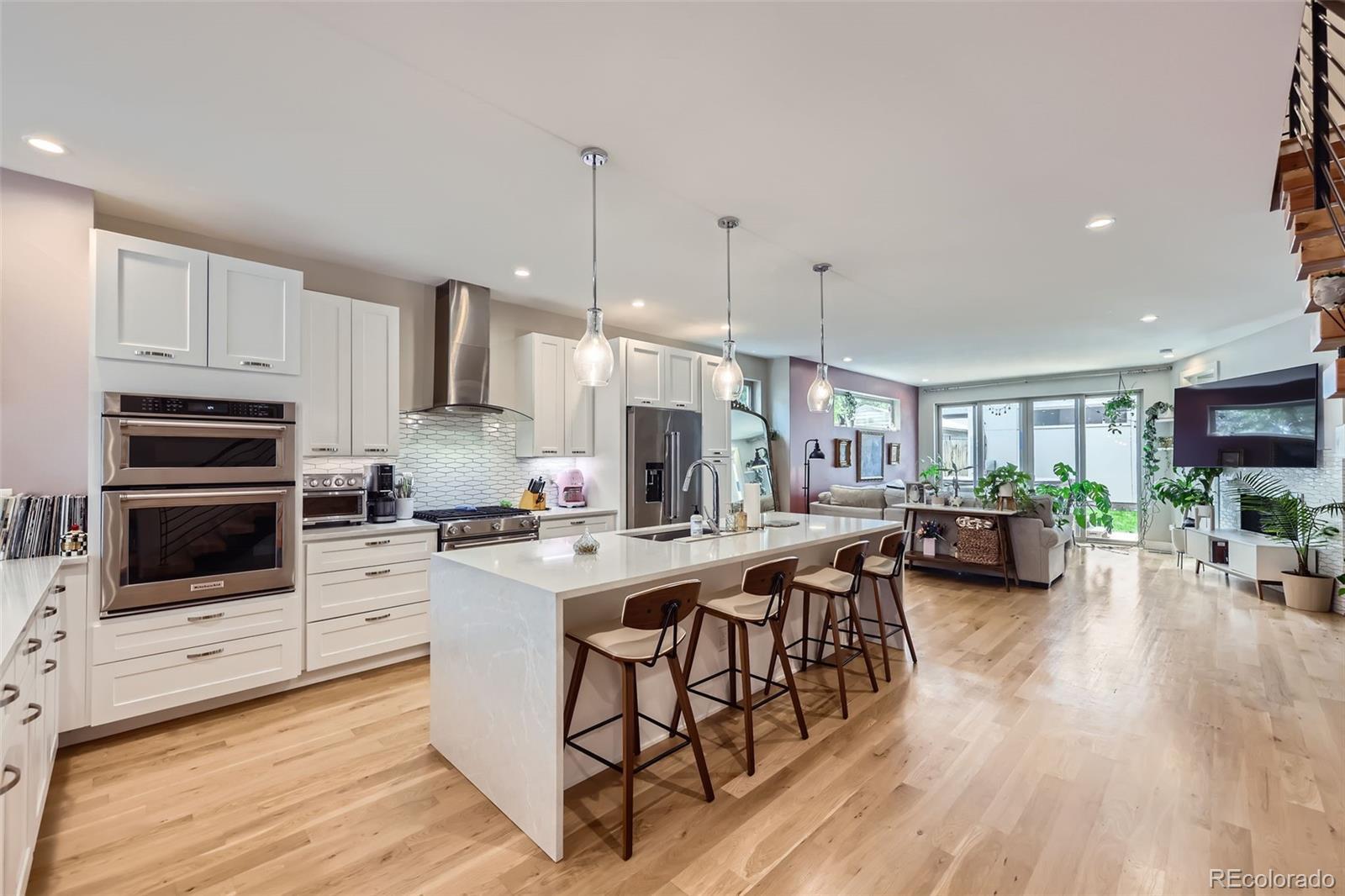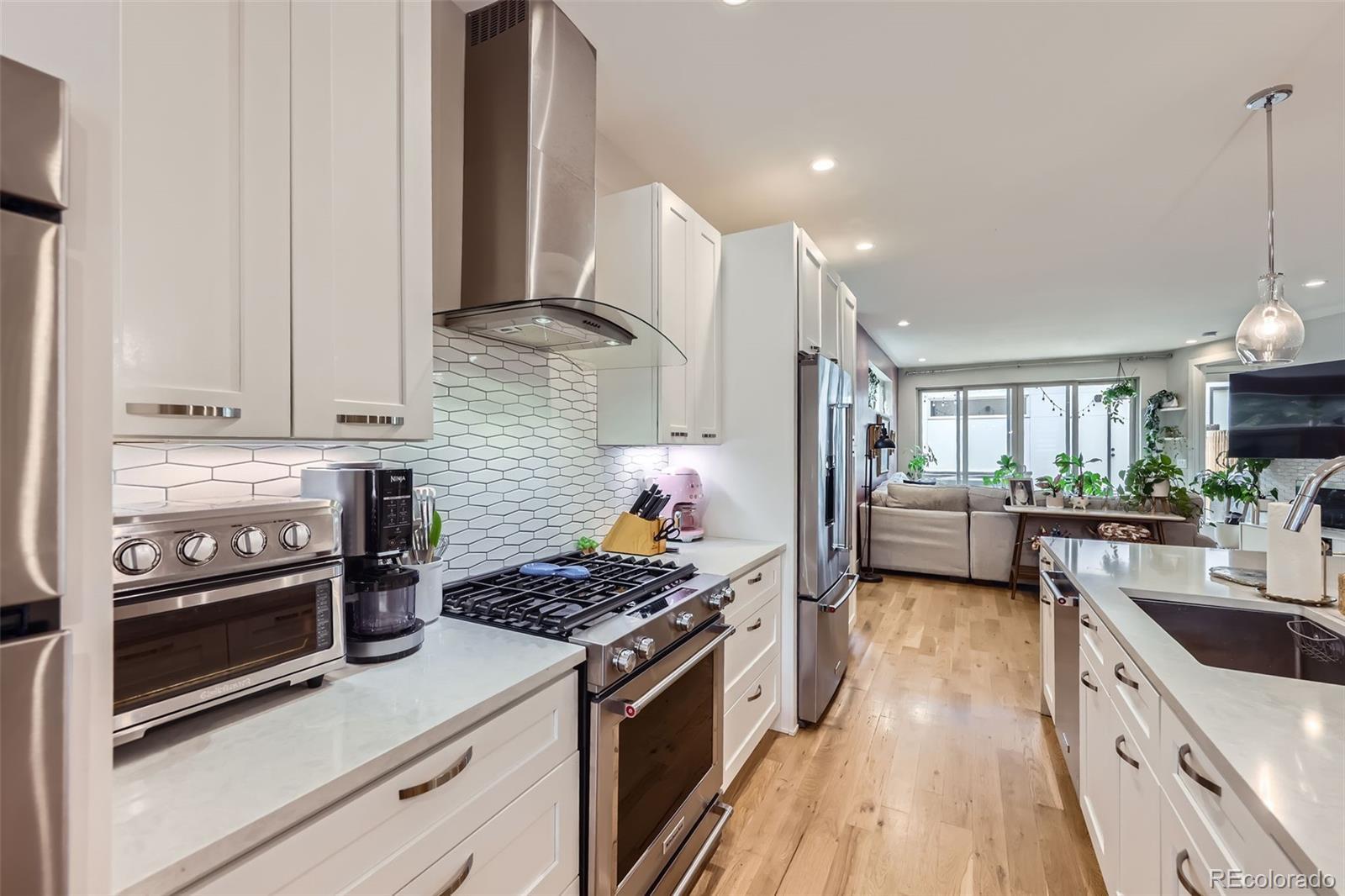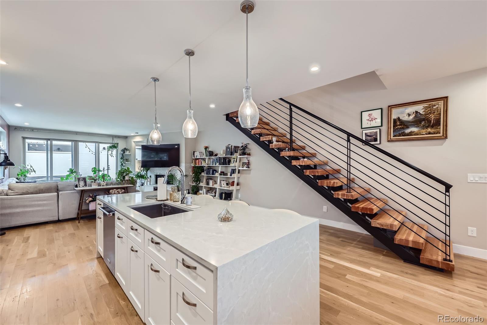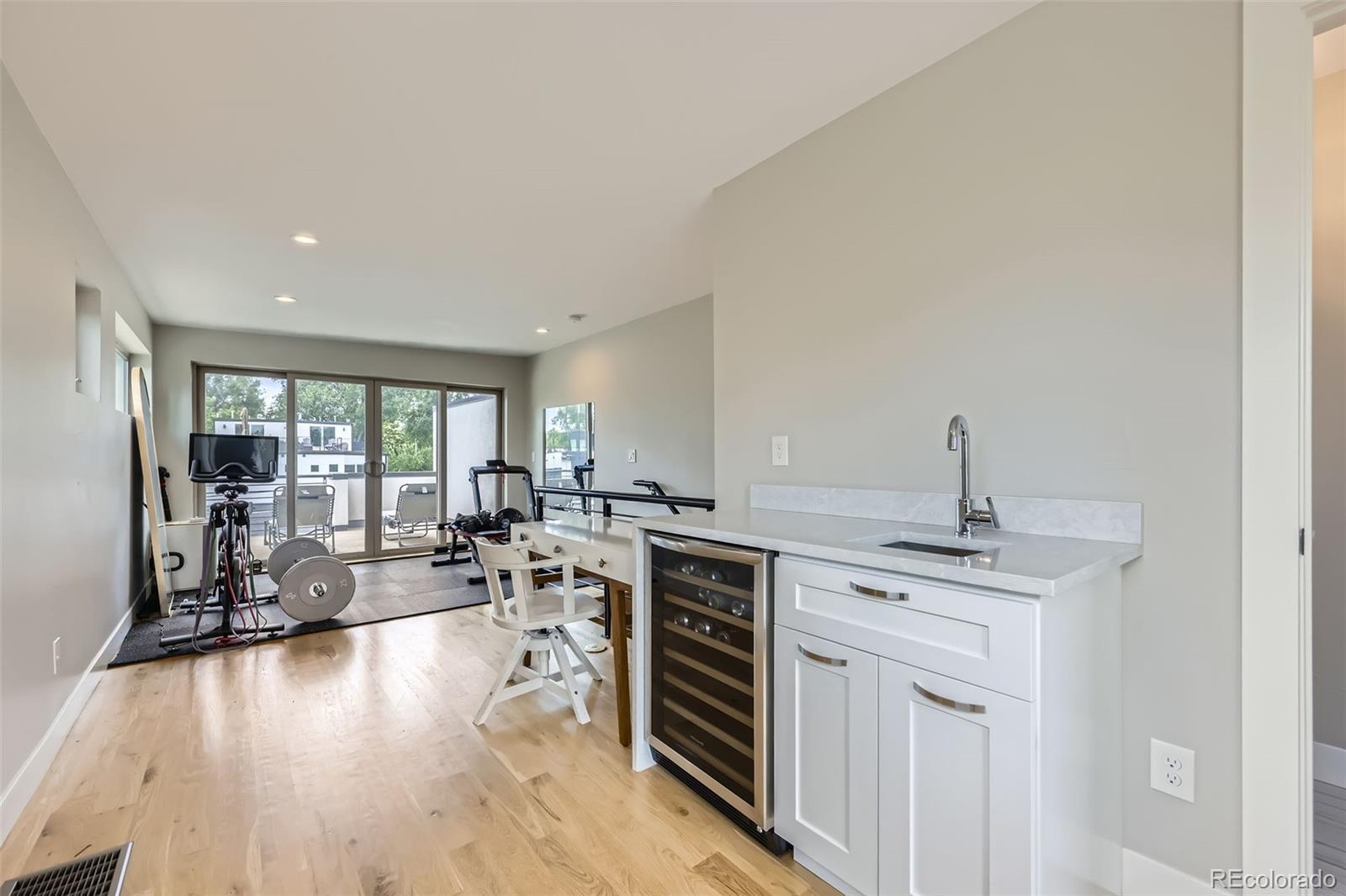 Sleek, Modern Living in the Heart of Sunnyside Nestled on Chaffee Park, this beautifully designed Sunnyside home blends contemporary style with thoughtful functionality. A custom exterior and covered front porch lead into a bright, open layout featuring wide-plank hardwood floors, floor-to-ceiling windows, and elevated finishes throughout. The gourmet kitchen impresses with a center island, quartz countertops, custom cabinetry, and premium KitchenAid appliances. A spacious dining area and sunlit living room with a modern fireplace open to a private backyard retreat with a patio and hot tub. Upstairs, the serene primary suite offers a private balcony and spa-like bath. Two additional bedrooms share a Jack-and-Jill bathroom, and a laundry room adds convenience. The third floor boasts a rec room with a wet bar, powder bath, and front and rear rooftop decks — perfect for entertaining and enjoying park views. Extras include a two-car insulated garage, privacy fencing, full landscaping with sprinkler systems, and a large, lighted crawl space accessible from the mudroom. With designer finishes, smart layout, and exceptional indoor-outdoor living, this home is a standout in Sunnyside.