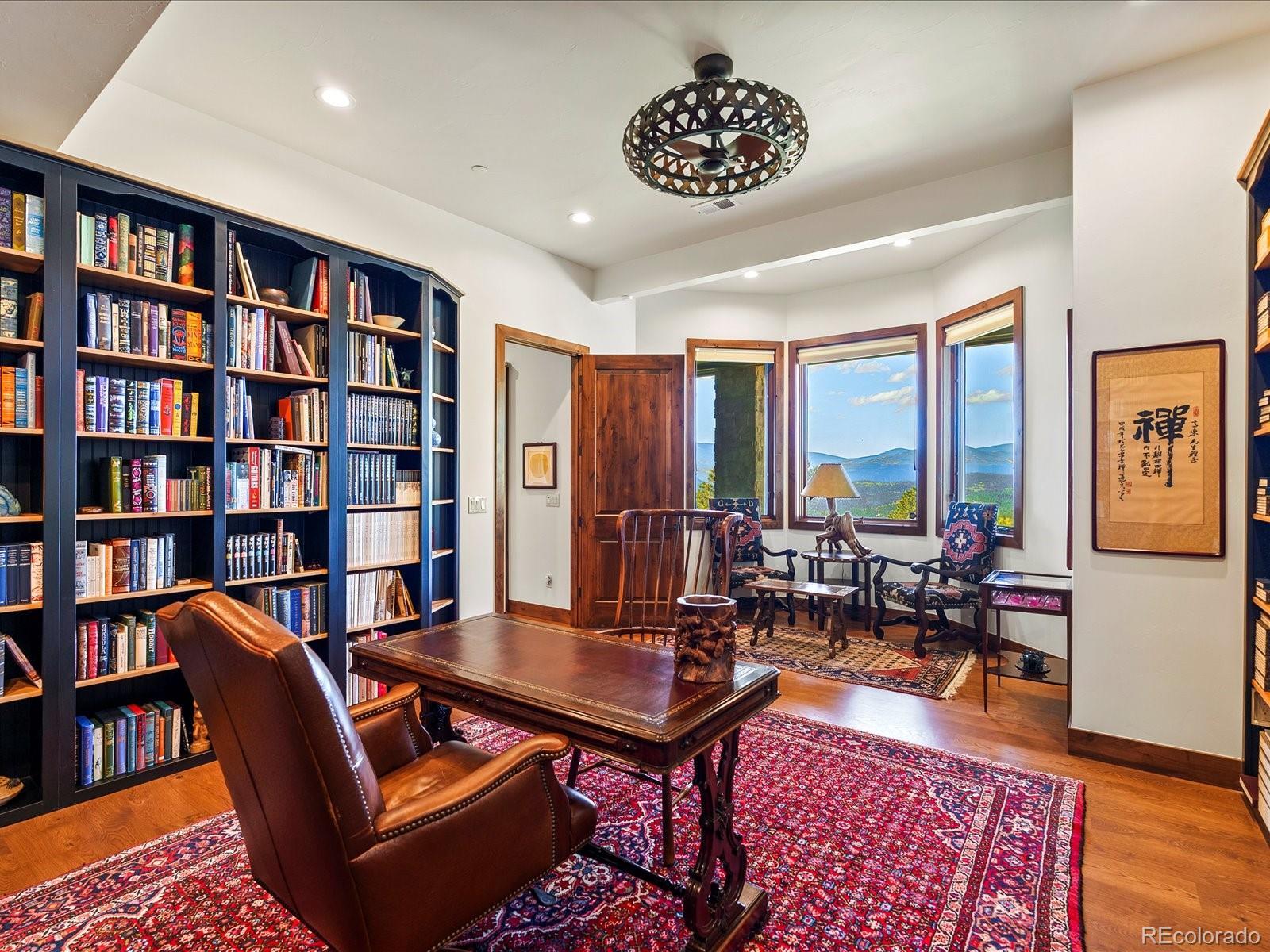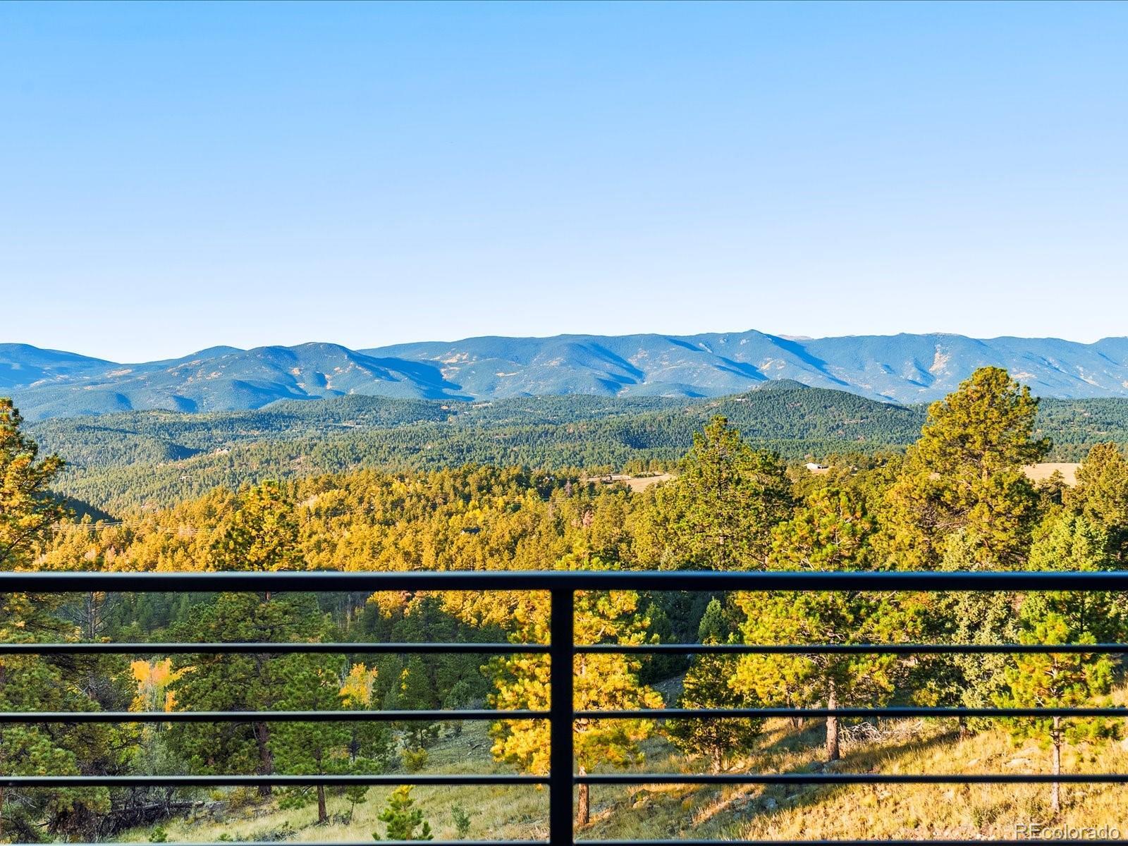 Welcome to 33958 Running Bear Trail, a one-of-a-kind mountain retreat where privacy, artistry, and modern luxury converge. Set atop 20 private acres in the prestigious Reserve at Brauch Ranch, this 2019 masterpiece was custom built to capture awe-inspiring views from nearly every room. With over 7,500 square feet of living space, the residence feels like both a modern gallery and a warm retreat, designed for those who value refined architecture, thoughtful craftsmanship, and an unparalleled connection to nature. Walls of glass frame endless mountain ranges, flooding the interiors with natural light and bringing the outdoors in. Entertaining is elevated with expansive living and dining areas that flow seamlessly onto a covered deck overlooking dramatic vistas. The chef’s kitchen features artistic quartz surfaces, custom cabinetry, a statement island, and a walk-in pantry with rolling ladder. A spa-like primary suite on the main level offers private deck access and a tranquil retreat. Upstairs, generous bedrooms with ensuite and Jack-and-Jill baths offer luxury and privacy for family or guests, alongside a massive loft space ready for creative expression or recreation. The walk-out lower level was designed for living well, complete with a theater, custom library, large office, exercise room, second living space, and abundant storage. This property delivers the rare combination of seclusion and accessibility: less than an hour to downtown Denver yet a world away in atmosphere. If you were to build this home today on this setting, the cost and wait would far exceed its offering. Every element speaks to someone who truly appreciates art, design, and the exclusivity of a private retreat.