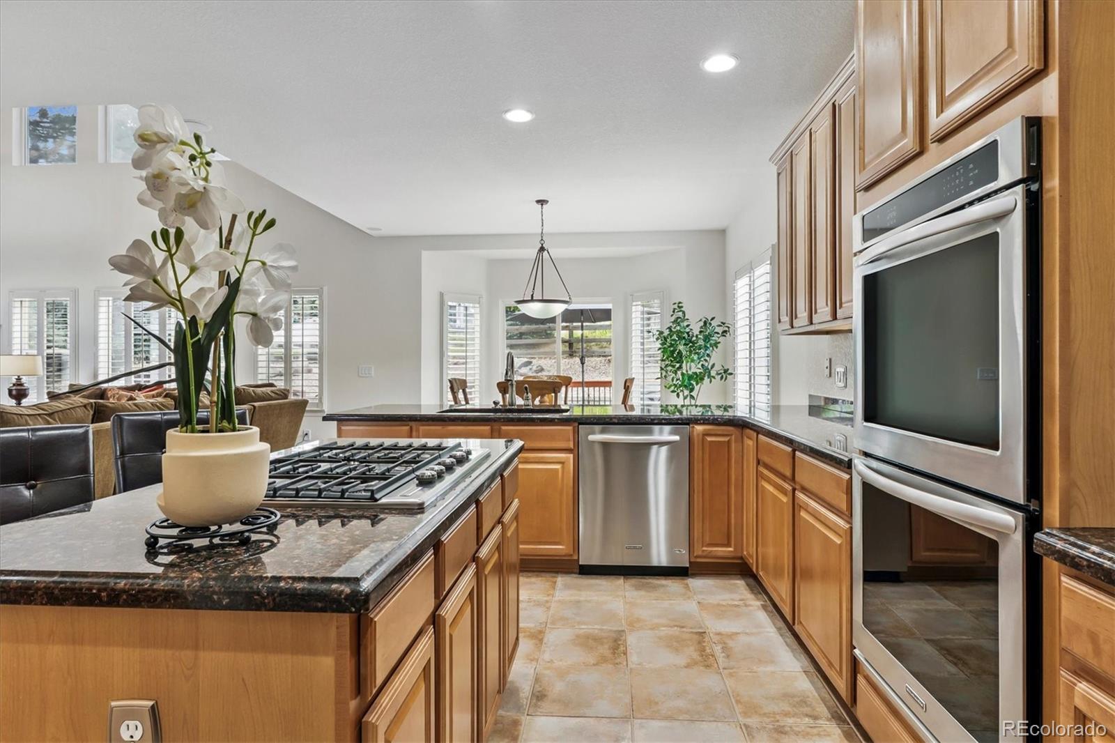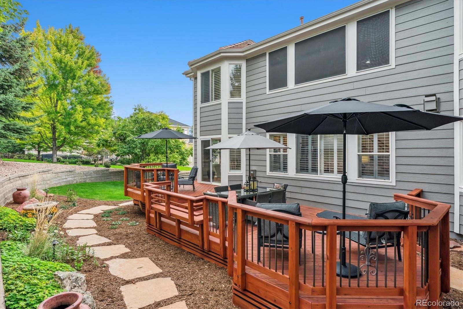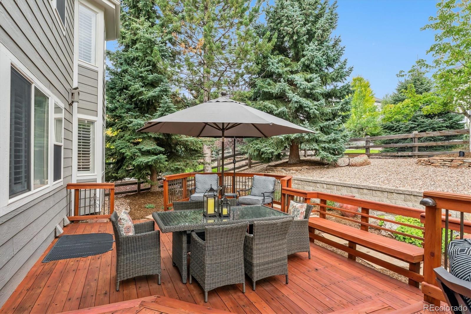 Defined by intentional design, seamless flow, and refined finishes, 3443 Elk Run Drive offers contemporary living on a premium lot in The Meadows. New exterior paint and professional landscaping greet you from the street with instant curb appeal. Inside, the grand foyer features high ceilings, tile floors, and is bathed in abundant natural light, unfolding to formal living and dining areas. The heart of this home is the gorgeous family room, complemented by 20’ ceilings and a dual-sided gas fireplace. The well-appointed kitchen includes granite countertops, a stainless steel appliance package, a walk-in pantry, a center island, and an inviting breakfast nook. Step outside to your backyard oasis. This entertainer's backyard offers ample privacy with multiple mature trees and new professional landscaping, which can be enjoyed from the sizable wooden deck. Upstairs, the private living quarters unfold to three generously sized secondary bedrooms, an updated full bath, and the primary suite. This serene retreat features dual walk-in closets, an updated 5-piece ensuite bath, new tile floors, and a walk-in shower. Additional features of this turnkey residence include a main-floor home office with a gas fireplace, plantation shutters, a laundry room with built-in cabinetry, an attached 3-car garage, and an unfinished basement, plumbed and ready for future expansion. The Meadows is a coveted family-friendly community in Castle Rock within minutes of Soaring Hawk Elementary, Paintbrush Park, The Grange, Red Hawk Ridge golf course, and endless shopping, dining, and entertainment of The Outlets and Downtown Castle Rock. Do not hesitate to experience contemporary living at 3443 Elk Run Drive; book your showing today!
