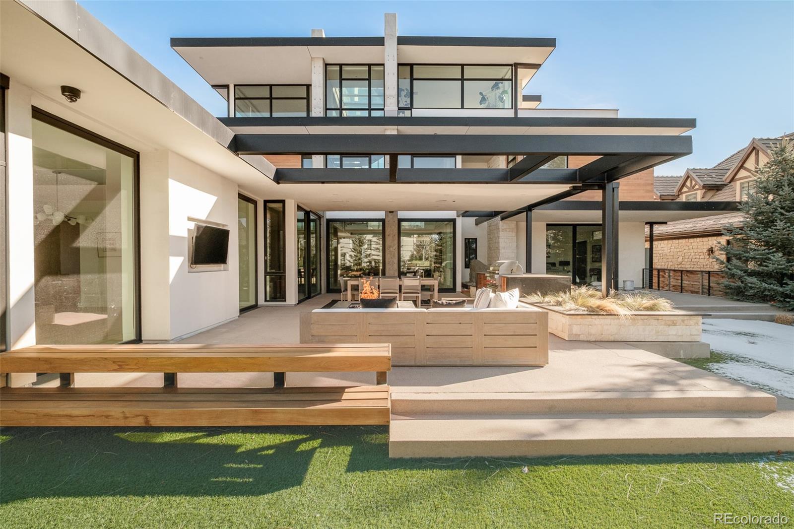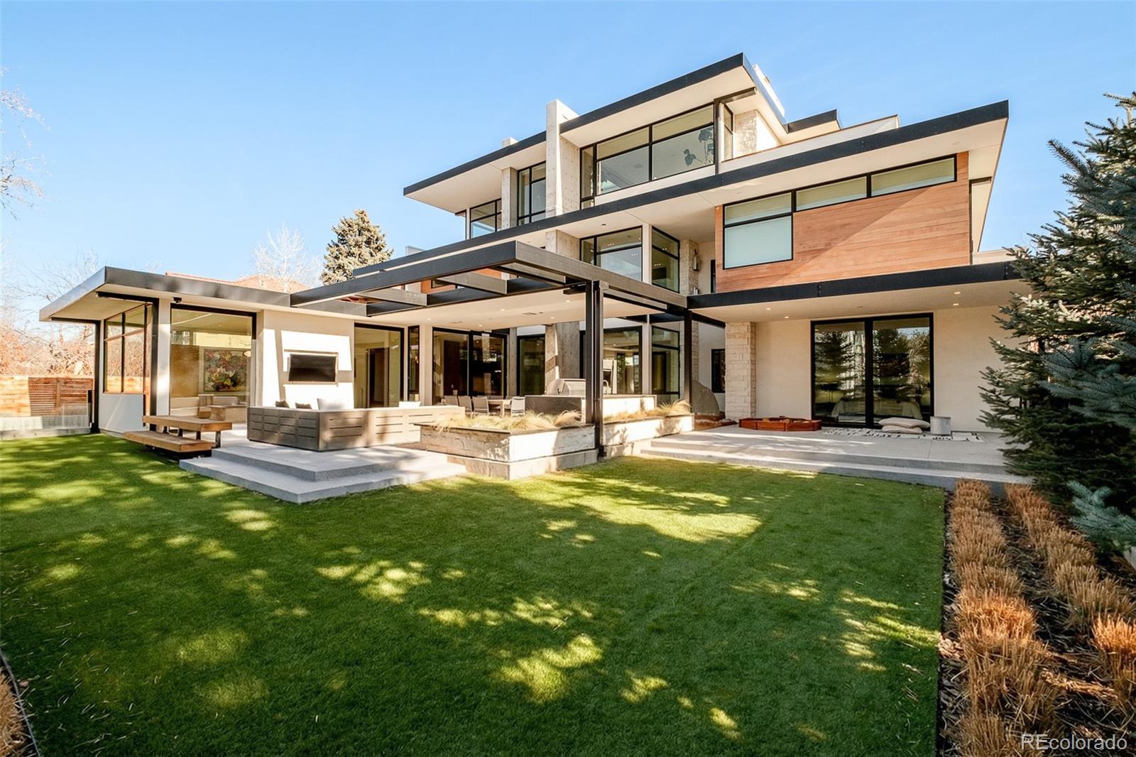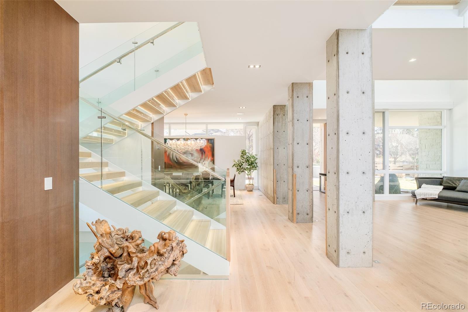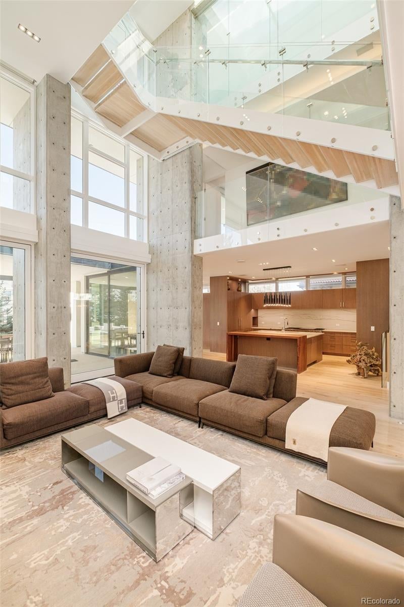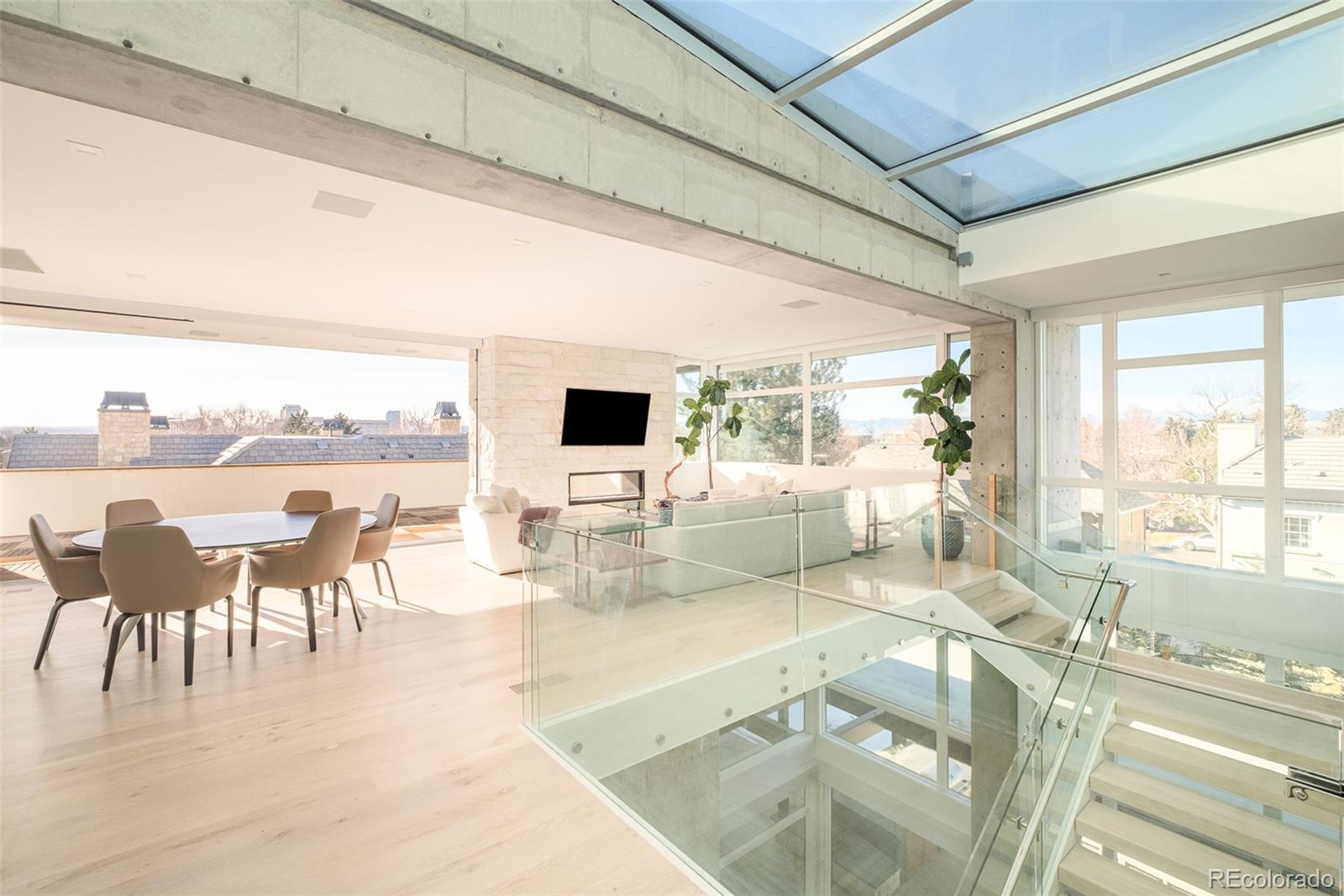An exceptional modern residence in Denver’s coveted Hilltop neighborhood, this architecturally striking home offers over 10,000 square feet of refined living defined by volume, light, and intentional design. Created by Nest Architectural Design, the home is anchored by soaring glass walls, exposed concrete, and a dramatic central atrium with suspended bridges that connect two private wings. The main level is designed for effortless entertaining, featuring expansive open living and dining spaces, a statement chef’s kitchen with premium integrated appliances, generous pantry, and seamless indoor-outdoor flow to a resort-style terrace. A serene main-level primary suite opens directly to the backyard and includes a spa-inspired bath with heated floors. A second primary suite on the upper level offers the same level of privacy and luxury, perfect for hosting guests. Above, a glass-enclosed retreat includes a private office, living area, kitchenette, and an expansive terrace with sweeping mountain and neighborhood views—ideal for entertaining or quiet retreat. The finished lower level extends the living experience with multiple guest suites, a full home theater with Dolby Atmos, fitness room, wine room, and flexible recreation spaces filled with natural light. Outdoors, layered terraces, an outdoor kitchen, fire features, and thoughtfully designed landscaping create a private urban oasis with pool-ready infrastructure. Completing the home are a Crestron smart home system, two elevators, radiant-heated baths, and a heated three-car garage and driveway. Bold, sculptural, and impeccably executed, this is a rare offering for those seeking modern design without compromise.