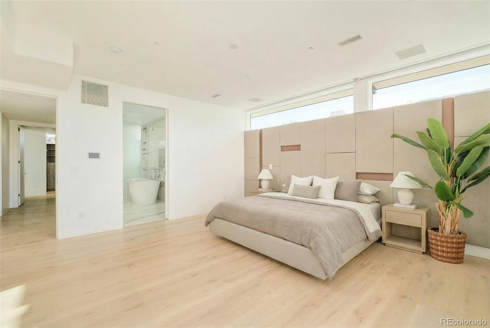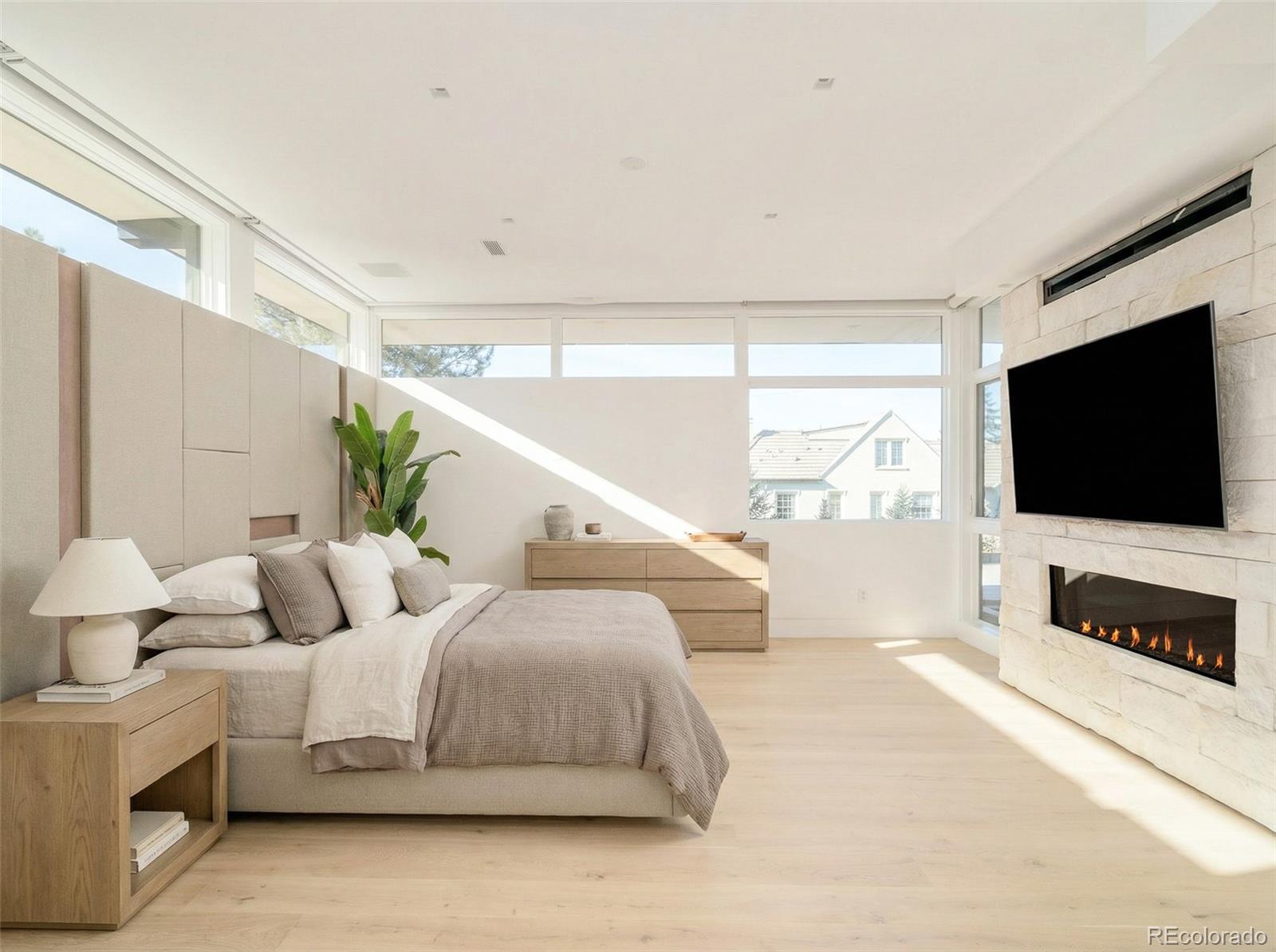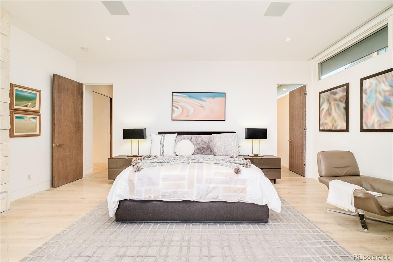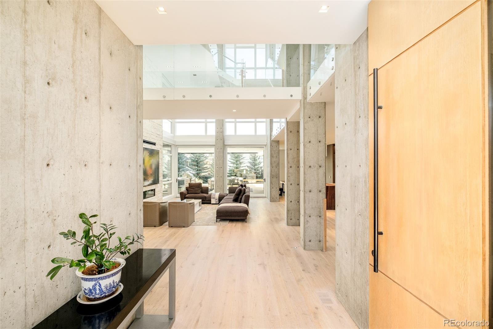 An exceptional modern residence in Denver’s coveted Hilltop neighborhood, this architecturally striking home offers over 10,000 square feet of refined living defined by volume, light, and intentional design. Created by Nest Architectural Design, the home is anchored by soaring glass walls, exposed concrete, and a dramatic central atrium with suspended bridges that connect two private wings. The main level is designed for effortless entertaining, featuring expansive open living and dining spaces, a statement chef’s kitchen with premium integrated appliances, generous pantry, and seamless indoor-outdoor flow to a resort-style terrace. A serene main-level primary suite opens directly to the backyard and includes a spa-inspired bath with heated floors. A second primary suite on the upper level offers the same level of privacy and luxury, perfect for hosting guests. Above, a glass-enclosed retreat includes a private office, living area, kitchenette, and an expansive terrace with sweeping mountain and neighborhood views—ideal for entertaining or quiet retreat. The finished lower level extends the living experience with multiple guest suites, a full home theater with Dolby Atmos, fitness room, wine room, and flexible recreation spaces filled with natural light. Outdoors, layered terraces, an outdoor kitchen, fire features, and thoughtfully designed landscaping create a private urban oasis with pool-ready infrastructure. Completing the home are a Crestron smart home system, two elevators, radiant-heated baths, and a heated three-car garage and driveway. Bold, sculptural, and impeccably executed, this is a rare offering for those seeking modern design without compromise.