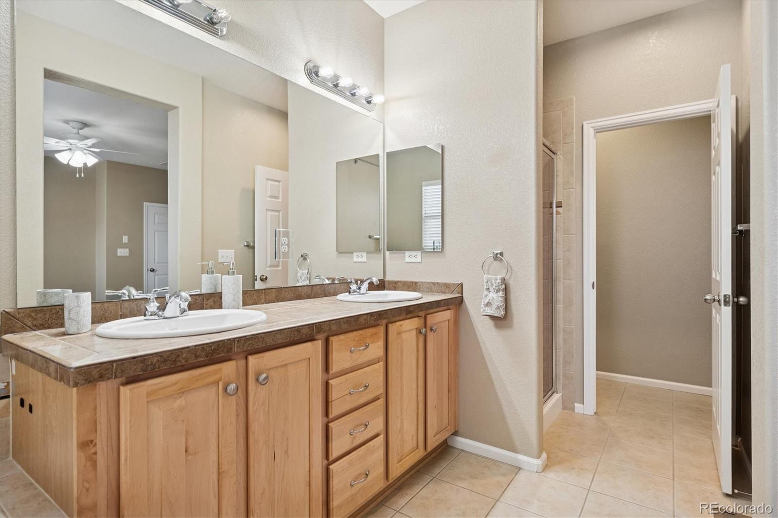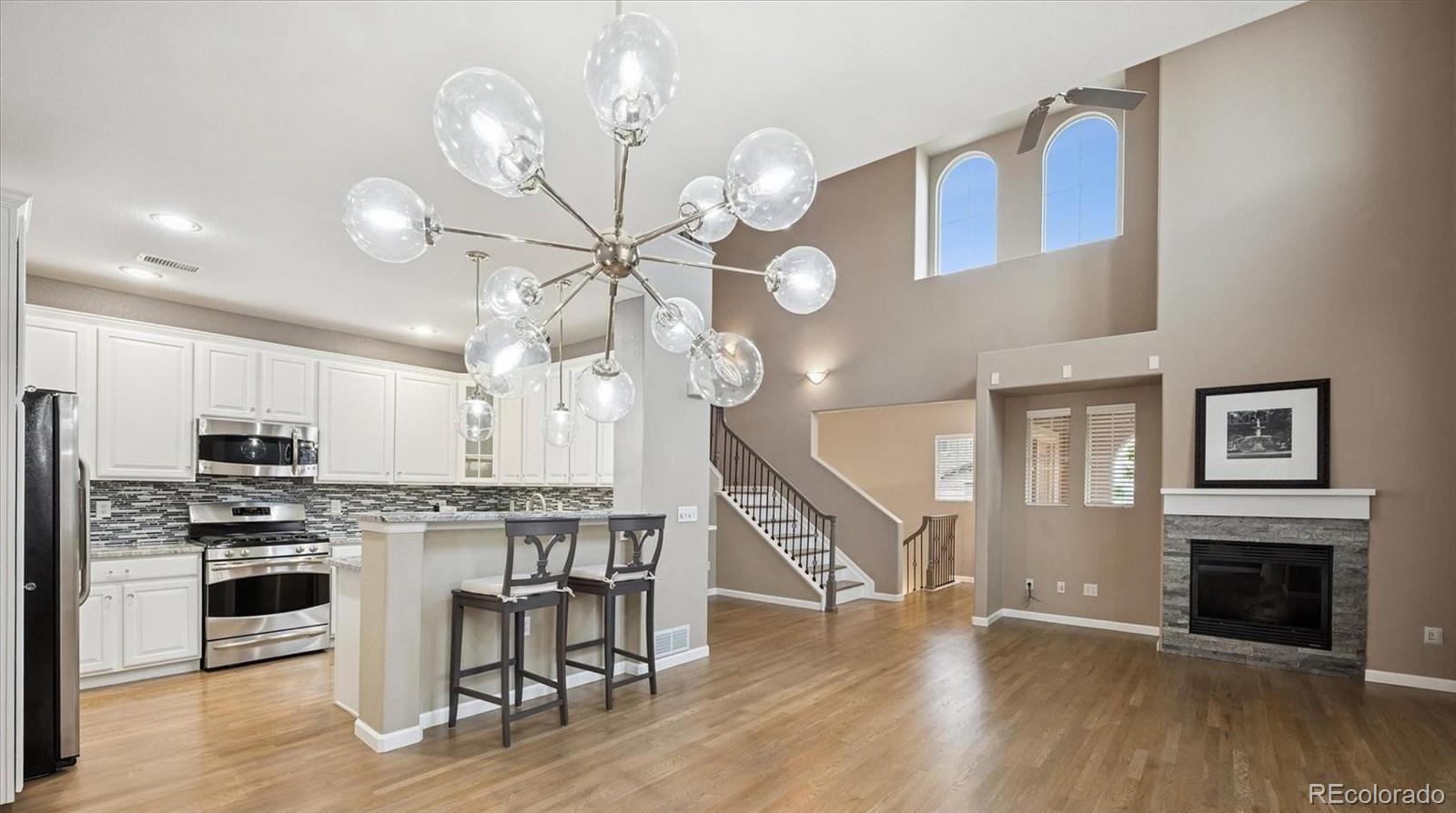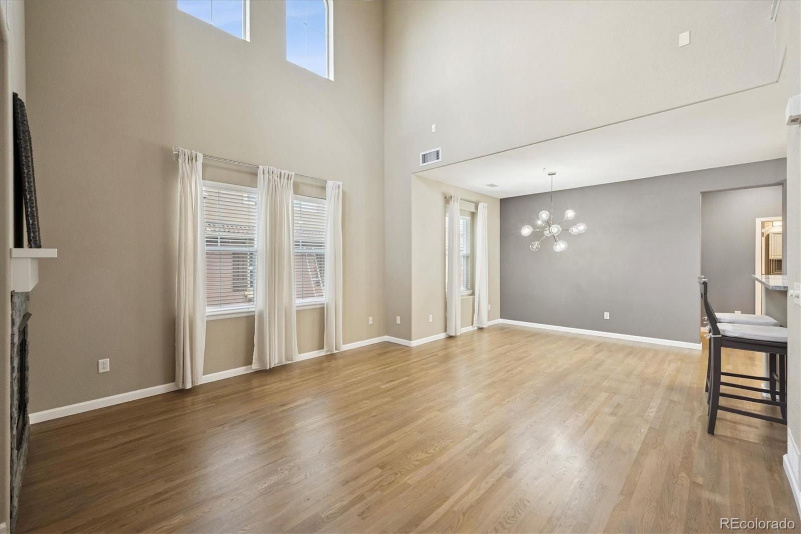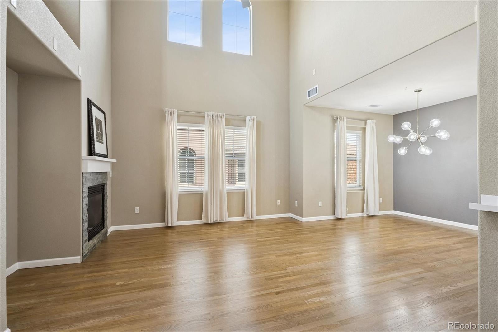 Stunning loft style condo with a view of the mountains perfect for the active professional. Discover modern elegance in this stunning corner unit with no one above or below you, two-bedroom, two-bathroom condo nestled in the heart of desirable Highlands Ranch. This thoughtfully updated residence showcases premium craftsmanship with solid white oak hardwood flooring that flows seamlessly from the welcoming entry up the stairs, through the living, dining kitchen, and study area. The space feels both sophisticated and inviting, enhanced by wider custom baseboards and fresh paint throughout. The heart of the home features a chef-inspired kitchen boasting granite slab countertops, a striking new marble and slate backsplash, and top-tier stainless steel appliances including a convenient gas cooktop. The open loft-style living area captivates with soaring two-story ceilings that flood the space with natural light. Comfort extends throughout with luxurious sixty-ounce Karastan carpeting in the guest bedroom and a beautifully appointed guest bathroom featuring a tub and shower combination adorned with custom ledger stone-look tile. The primary suite offers a spacious private retreat with upgraded carpet a large walk in closet, along with a beautifully appointed in-suite bath with double sinks, tub and separate shower with custom tile throughout. Located in the highly sought-after Tresana community, offering residents a club house, pool, spa/hot tub, play ground and beautiful landscape all maintained by the HOA, plus access to all Highlands Ranch recreation facilities. You can enjoy easy access to quality shopping at nearby Whole Foods Market, excellent outdoor recreation at Cougar Run Park. The neighborhood perfectly balances suburban tranquility with urban convenience, offering reliable public transportation connections.
