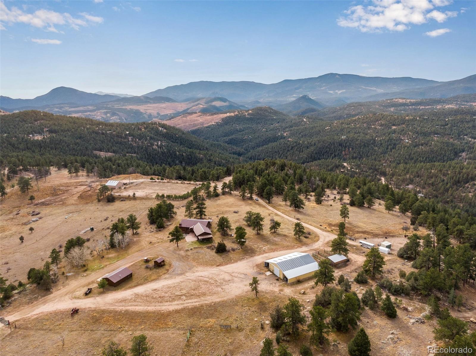 Please note: this property is in Pine, not Bailey. A beautiful true Rocky Mountain Ranch awaits your dreams. You will be living in the Colorado mountains, surrounded with majestic views, yet so close to the city. This property is made of two parcels, 17922 is 8.85 acres, 42525 is 38.61 acres, for a total of 47.46 acres, per recent 2025 survey. This property is set up for equestrian, possible working cattle ranch, hunting right outside your door, building a second home/accessory dwelling unit (ADU) or just pure relaxation. The 3,323 SqFt walkout ranch home sits perfectly surrounded by 7 different outbuildings and a professional sized arena, lights and electricity to most, including the arena. All of this and just 1.4 miles off Highway 285 and only 45-minutes from Denver. The Seller has made several expensive upgrades, which you can read about within the captions on each picture and/or the room descriptions. Just to name a few done in 2025, allowing you to spend your money elsewhere: $17K survey, $40K+ septic system & leach field, interior & exterior paint and stain, quartz countertops, SS appliances, luxury vinyl flooring, tile floor in the “sunroom”, all hardwoods refinished, kitchen sink, garbage disposal, kitchen RO system, faucets and hardware in most areas, toilets, lighting in many areas, all tile grout professionally cleaned, boiler HVAC system, pellet stove & fireplace cleaned and inspected, over 2000’ of fencing, new garage doors in detached heated garage, new access door in the attached heated garage, deck stairs and front porch flagstone stairs have been replaced. Both wells (Well permit #40416-A is on parcel 17922 for house use only. Well permit #319169 is on parcel 42525 for live stock watering.) are new within the last five years. This home is ready for your own personal touches! Don’t forget to watch the video which really represents this magnificent property. Now come and see it, make it yours for the Holidays and have your dreams come true.