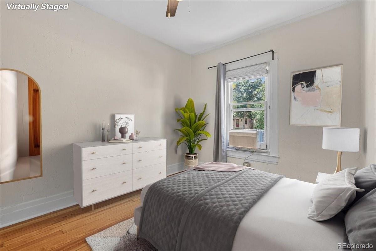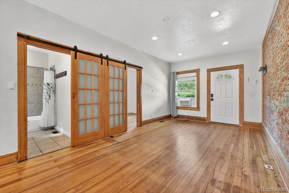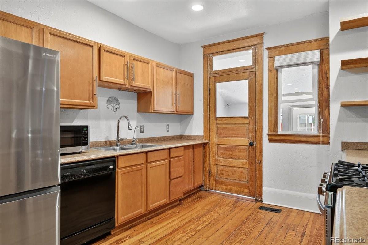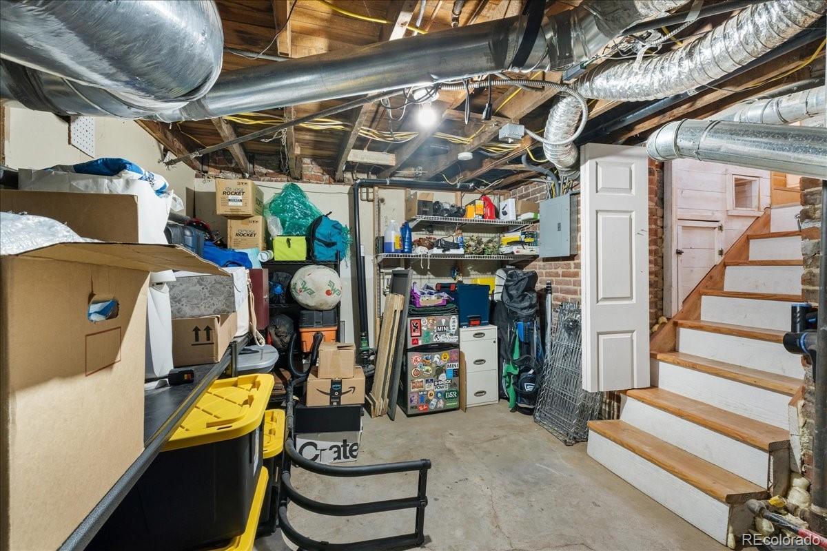 Urban Charm Meets Modern Comfort in Whittier! Would be an excellent rental or Airbnb! This beautifully remodeled 1-bed, 1-bath row home perfectly blends historic character with stylish updates. Featuring exposed brick, original hardwoods, and rich woodwork, this light-filled space radiates warmth and personality The modern kitchen shines with custom live-edge shelving, newer appliances, and a thoughtfully reimagined back vestibule—ideal for extra storage or a cozy drop zone. The bright bathroom features a skylight, and the spacious 140 sq. ft. stand-up basement adds incredible bonus storage. Step outside to your private, fully fenced backyard with low-maintenance turf, garden space, and oversized parking spot and alley access—all with no HOA! Located on a quiet street just blocks from parks, RiNo’s best dining, breweries, and boutiques, this home offers the perfect mix of city living and neighborhood charm.