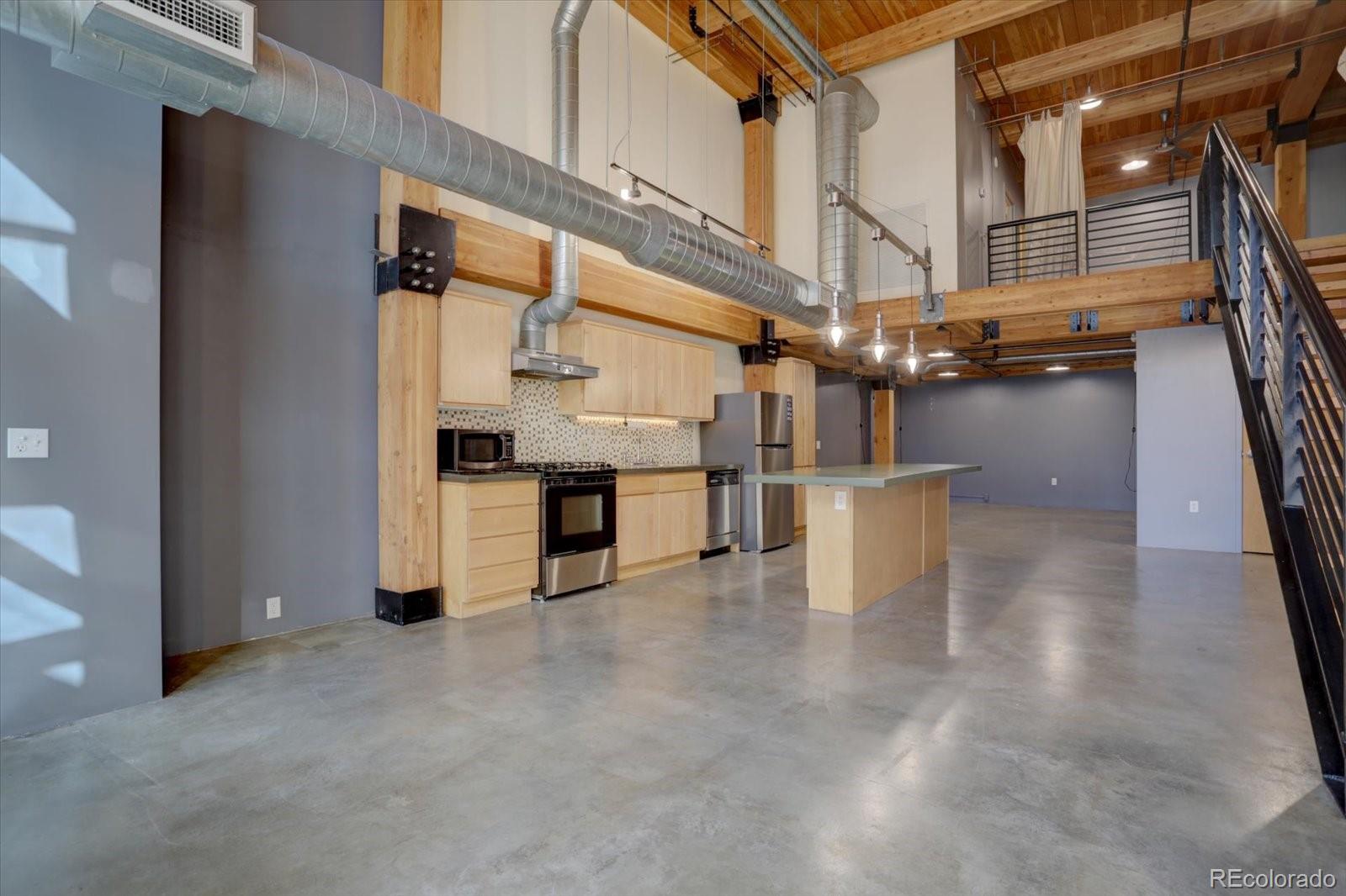 Unique and modern loft in one of the best locations in RINO/LODO. This is a premium unit in AJAX LOFTS, true loft with high ceilings, timber beams, open rafters, exposed ducts, floating staircase, concrete and exposed brick throughout. You will love the large bedroom, walk in closet, two full baths and a huge great room. Lots of open space for living, dining, or office. Located in the Prospect neighborhood it is a few minutes to Riverfront Park, Union Station, Coors Field, LODO, RINO, bike trails and light rail. The kitchen offers everything you would expect. Stainless appliances, gas cooking, large concrete island/dining table. The floor plan allows for the flexibility to create an office, additional guest bedroom, or a study. Many, many possibilities to give this home your own personality. Unique to this unit, it is located on the first floor with easy direct street access. This portion of Inca Street is a dead end so traffic flow is low. Large tinted windows insure privacy without compromising your view. Washer and Dryer, underground secured parking garage with one parking space. Storage unit in garage is included. Dogs are OK. Also close is the Railyard dog park. Utilities are tenant responsibility, except water and trash, and average about $150/mo. 1 reserved parking space is reserved