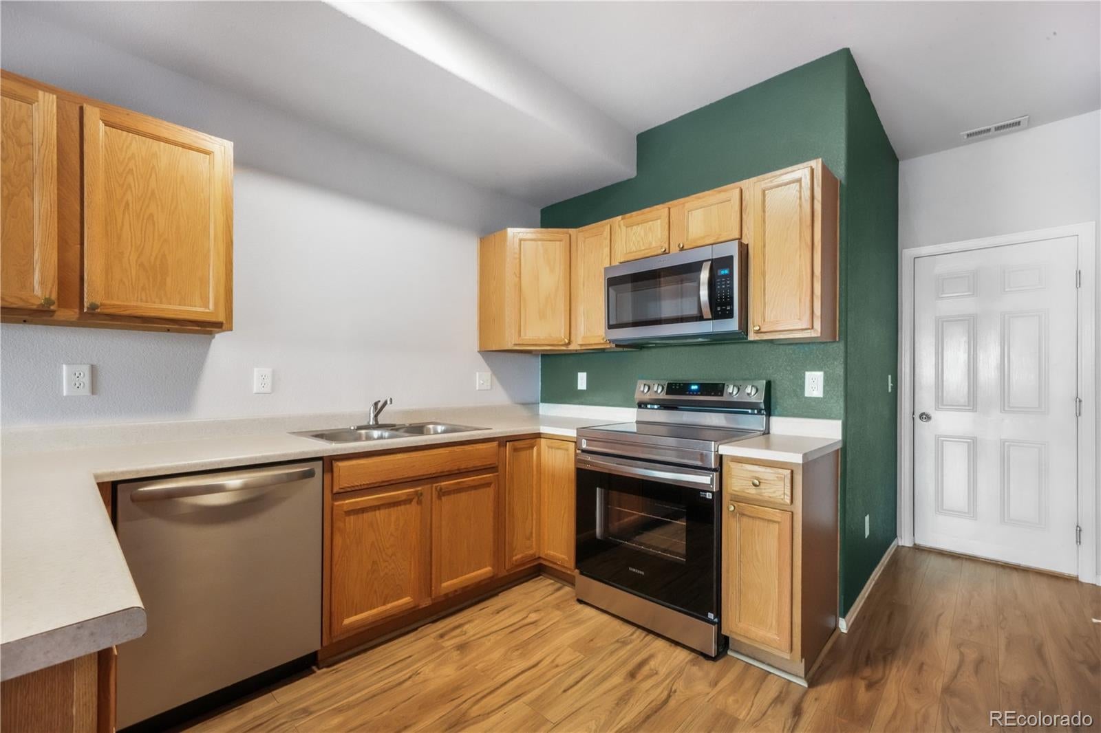 Welcome to this beautifully maintained 2 bedroom, 3 bathroom townhome located in the quiet and convenient Stonegate townhome community.A turn key unit as major mechanical have all been undated recently, hot water heater less than 2 years old and the furnace/ac replaced in the last year. This thoughtfully designed home features an attached 1 car garage, an open and functional floor plan, and a private larger than normal fenced patio privacy fence was recently stained this area offers a low maintenance outdoor space ideal for relaxing, entertaining, or pets. The main level showcases durable LVT wood style flooring throughout the living and dining areas, complemented by abundant natural light and a stylish accent wall that adds warmth. The kitchen is well appointed with ample cabinetry, generous counter space, stainless steel appliances, a functional island, and excellent flow for everyday living and entertaining. A convenient main level powder bath enhances functionality. Upstairs the primary suite offers a comfortable retreat with a large walk in closet and a well designed en suite bathroom featuring dual sinks, a soaking tub, and a separate walk in shower. The secondary bedroom is generously sized with easy access to an additional full bathroom. A dedicated upstairs laundry area with washer and dryer included adds everyday convenience. Easy access to nearby greenbelt areas, mountain views, shopping, dining, major commuter routes, and large employers throughout the corridor. With quick access to I-25, this home offers an exceptional balance of comfort, convenience, and Colorado lifestyle living.