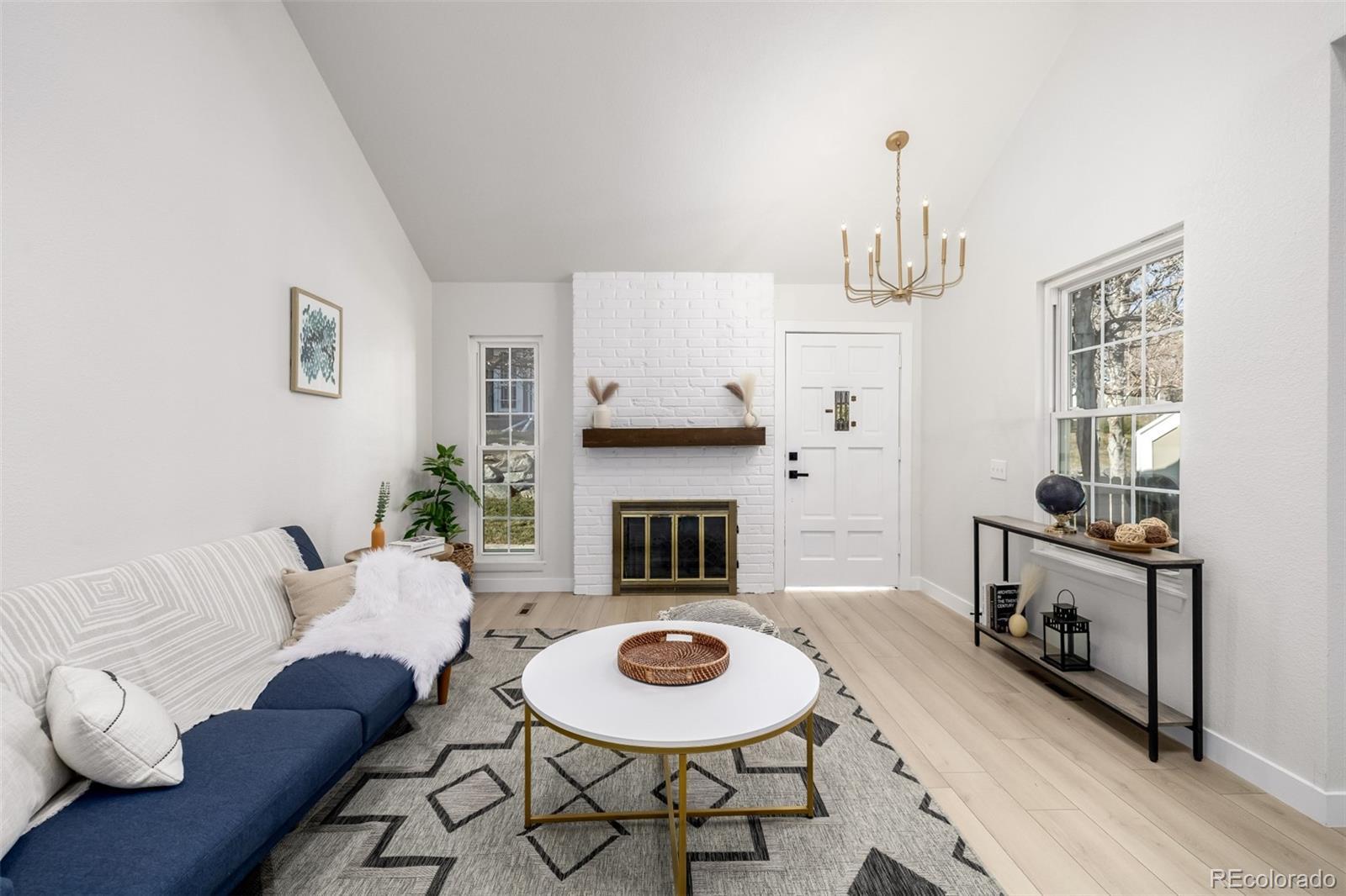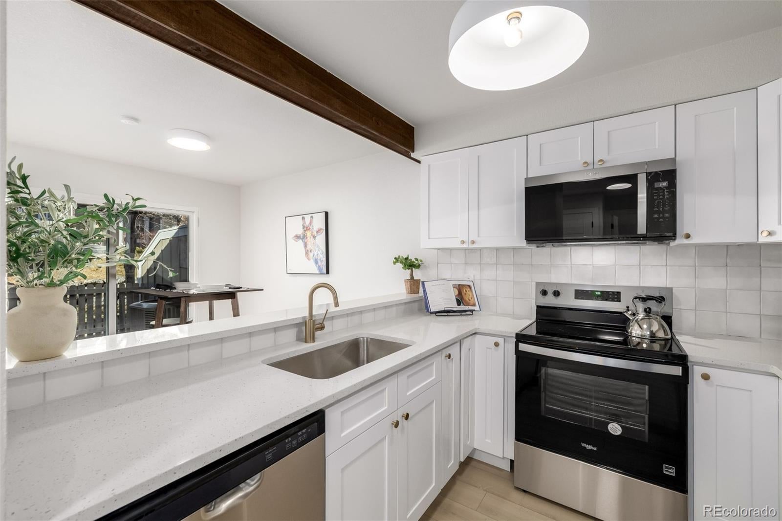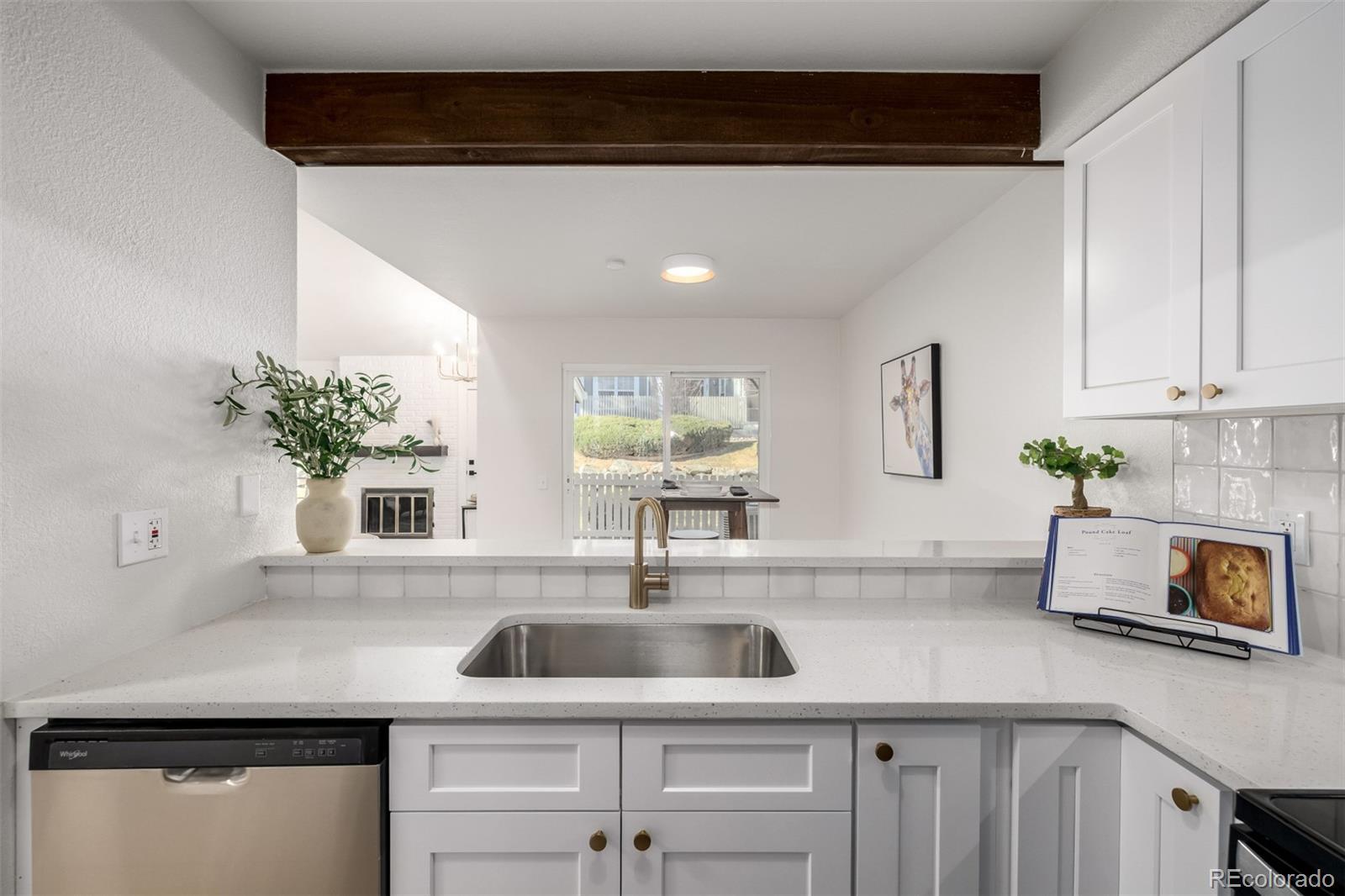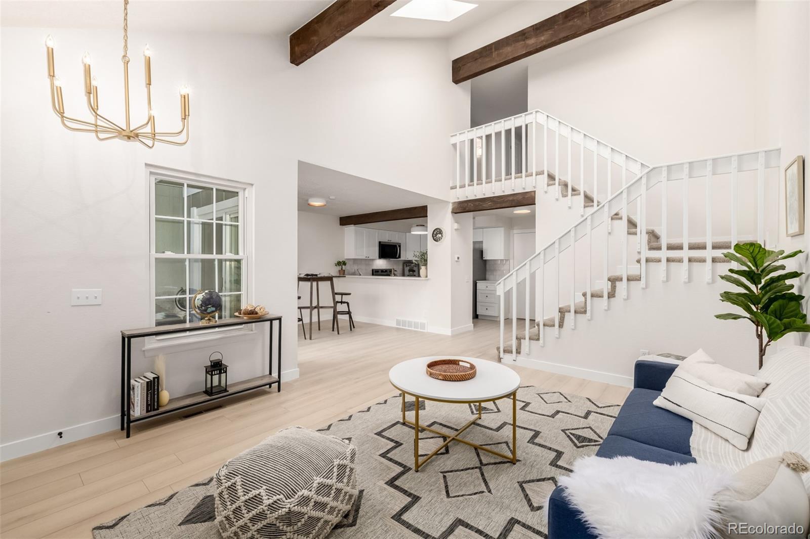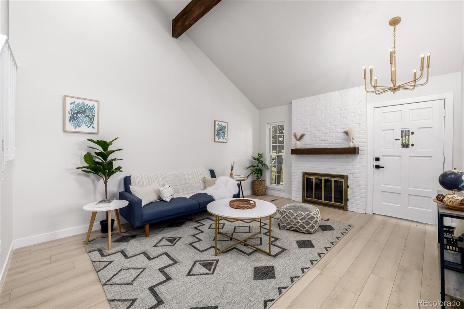 Step into a beautifully updated home where modern design meets warm, inviting character. The open layout features vaulted ceilings, exposed wood beams, and abundant natural light, with a cozy fireplace greeting you right as you enter—perfect for relaxing nights or entertaining. The kitchen has been completely remodeled with white shaker cabinetry, quartz countertops, stainless steel appliances, and a designer backsplash that ties it all together. Thoughtful updates continue throughout the home, including fresh interior paint, new flooring, updated light fixtures and ceiling fans, and new doors, trim, and hardware for a crisp, finished look. The bathrooms are fully remodeled with premium tilework and beautiful wood vanities, creating a spa-like feel. Downstairs, the unfinished basement offers a blank canvas—ideal for future living space, a home gym, office, or guest suite. Complete with a 2-car garage and an unbeatable location near I-225 for easy access, plus close proximity to parks, dining, shopping, and entertainment—this home is truly move-in ready.
