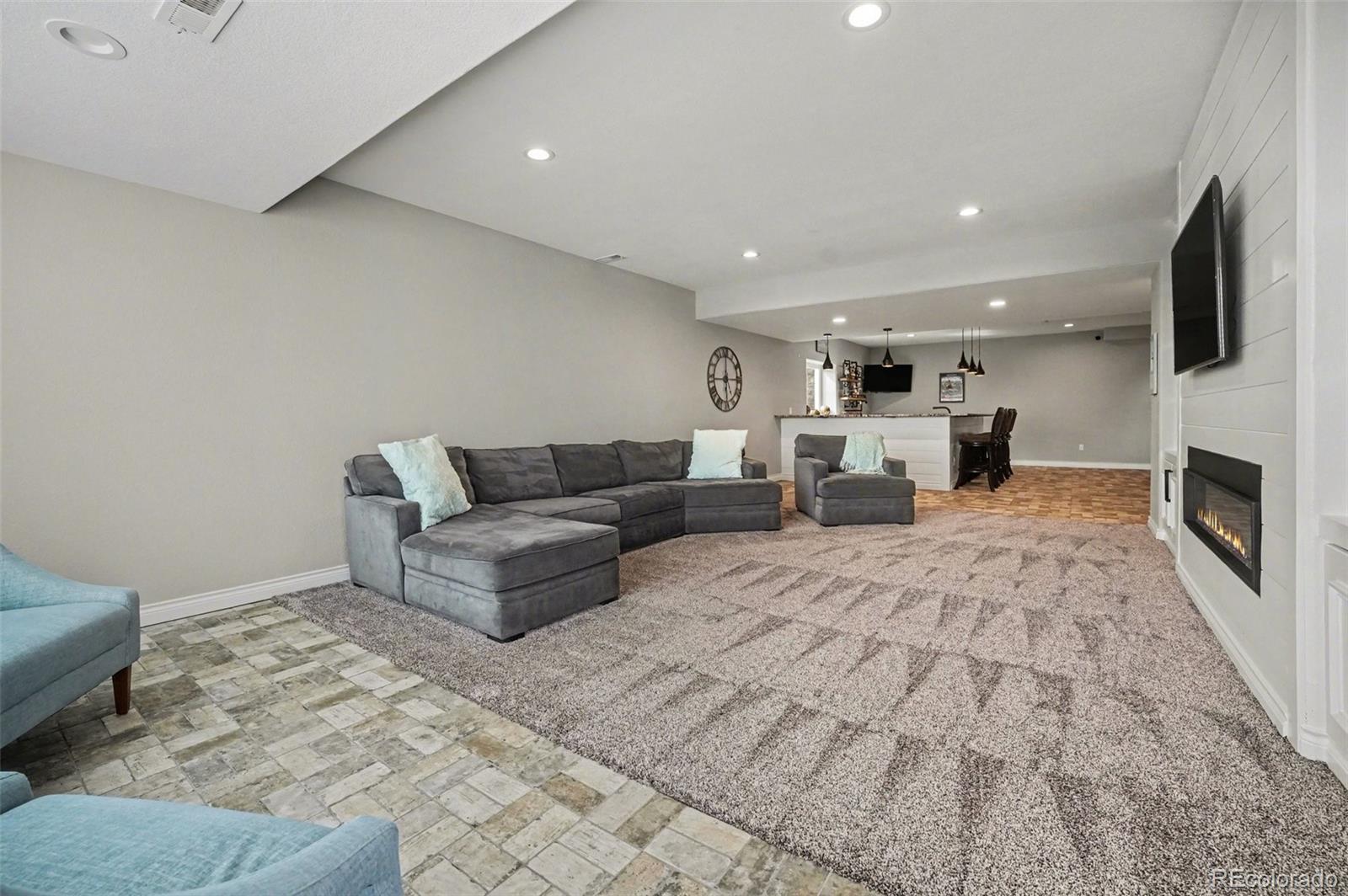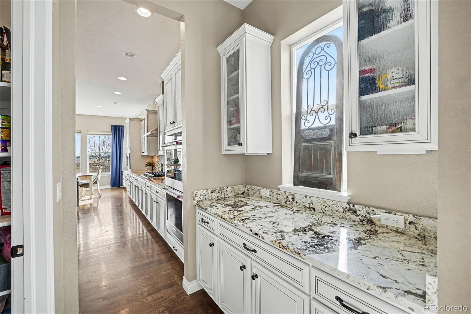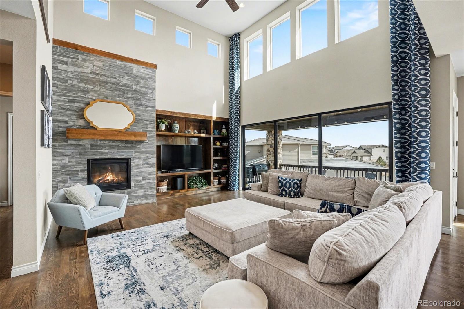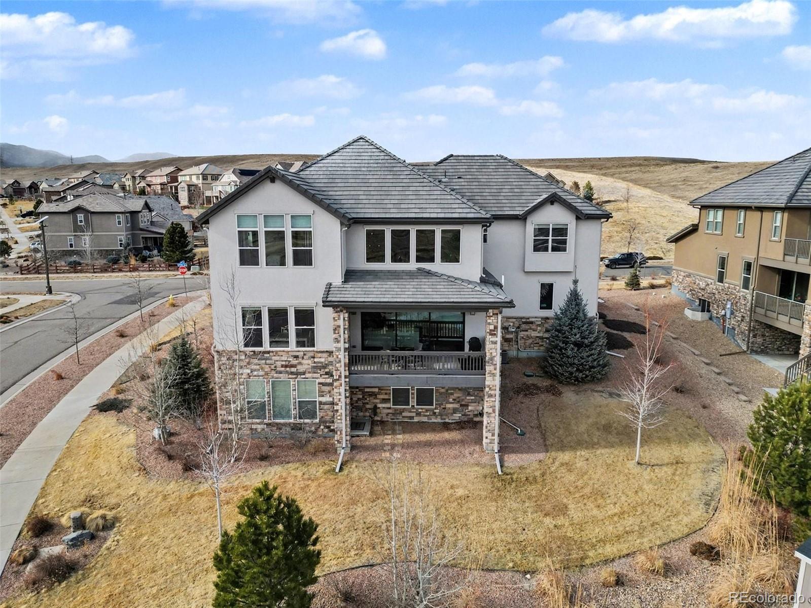 This exceptional residence in Skyview at Candelas delivers elevated Colorado luxury at every turn. Ultra-rare 5-car tandem garage. Panoramic mountain & city views. Former Remington model with extensive designer upgrades. Rich hardwood floors, custom built-ins, & expansive windows frame sweeping views across the main level. At the heart of the home, the chef’s kitchen is designed for both daily living & upscale entertaining, featuring full-extension dovetail Tharp cabinetry, quartz countertops, stainless steel appliances, 5-burner gas range, instant hot water, statement backsplash, & generous walk-in pantry. The main level features a vaulted family room with fireplace flowing seamlessly into formal & casual dining spaces with views, complemented by a main-level office or guest suite, powder bath, mudroom, & expansive custom storage. A 15’ x 8’ infinity sliding door opens to the covered deck, creating true indoor-outdoor living. Upstairs, 4 bedrooms include a luxurious primary retreat positioned to capture panoramic views, complete with a spa-inspired 5-piece bath & oversized walk-in closet. Secondary bedrooms feature attached baths & walk-in closets, while an expansive laundry room adds convenience. The finished walk-out basement is built for entertaining, anchored by an 8-seat custom wet bar with bronze sink, leathered granite, built-in ice maker, dishwasher, & a striking steampunk liquor display. A guest suite with en-suite bath, spacious living area with custom shelving & fireplace, & covered patio complete the space. Additional highlights include: custom window coverings, custom and mature landscaping, additional unfinished space for workout room or storage, expanded driveway, and located within window view of local K-8 school bus stop. Generous corner lot that sides and fronts to open space plus access to trails and top commuter routes, this home offers a rare combination of panoramic views, model home level enhancements, and luxury finishes in Northwest Arvada.